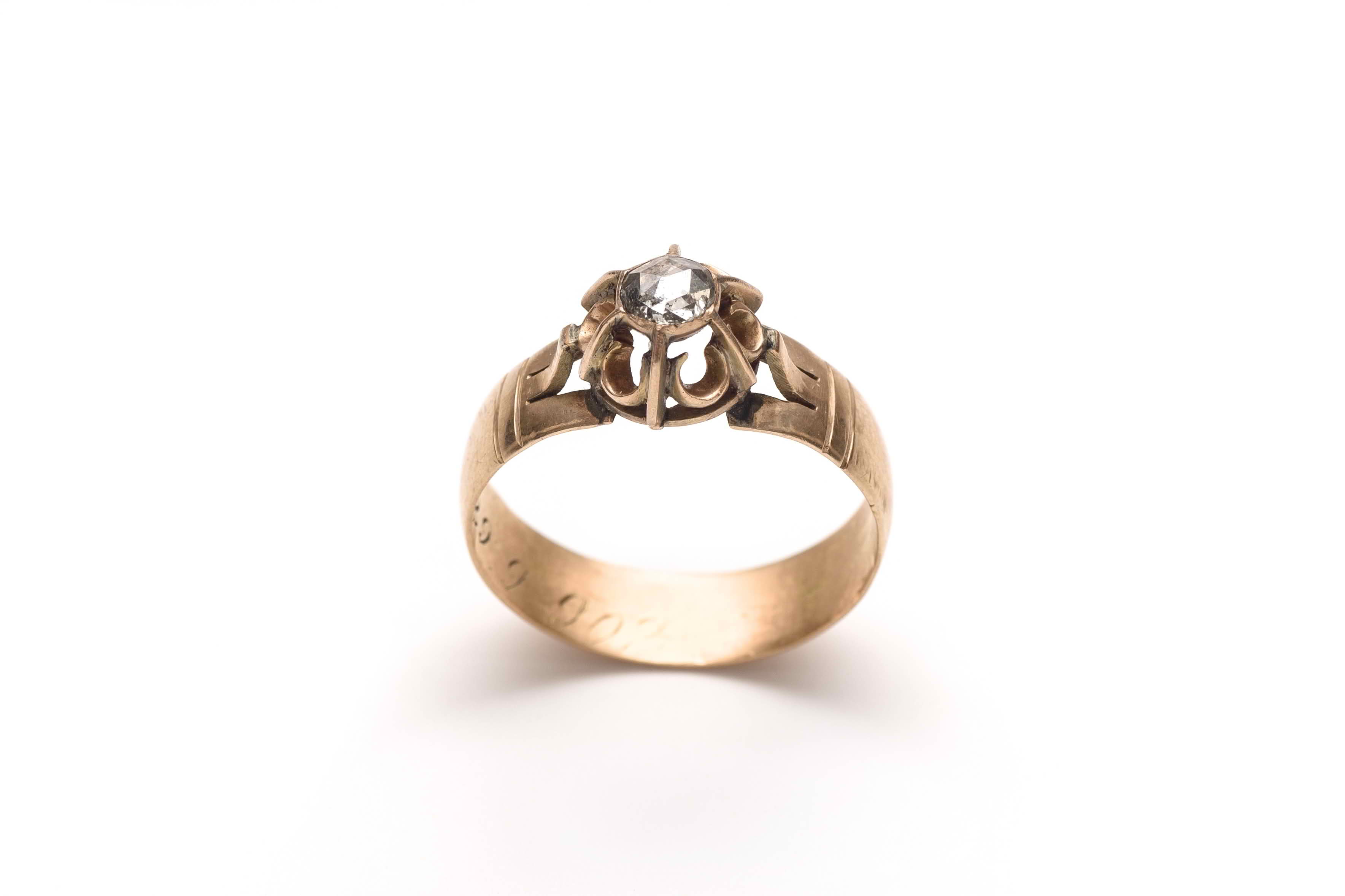 Gold ring, band with diamond and petal-like openwork shank, inscribed "E.S. 29.9.908".
