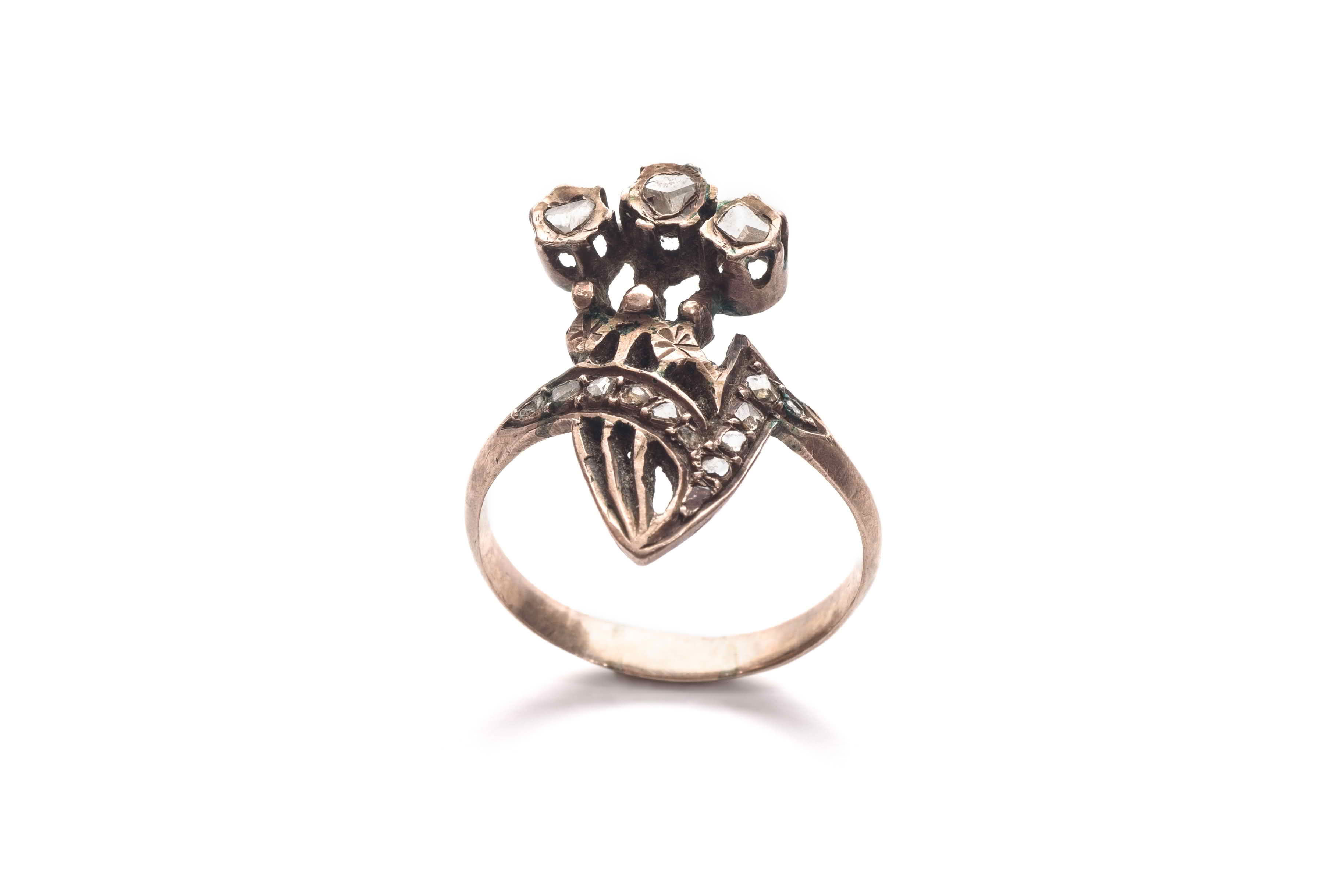Woman's gold ring, decorated with floral motif, set with eleven small diamonds and ending with threefold finial set with three diamonds in prong setting.