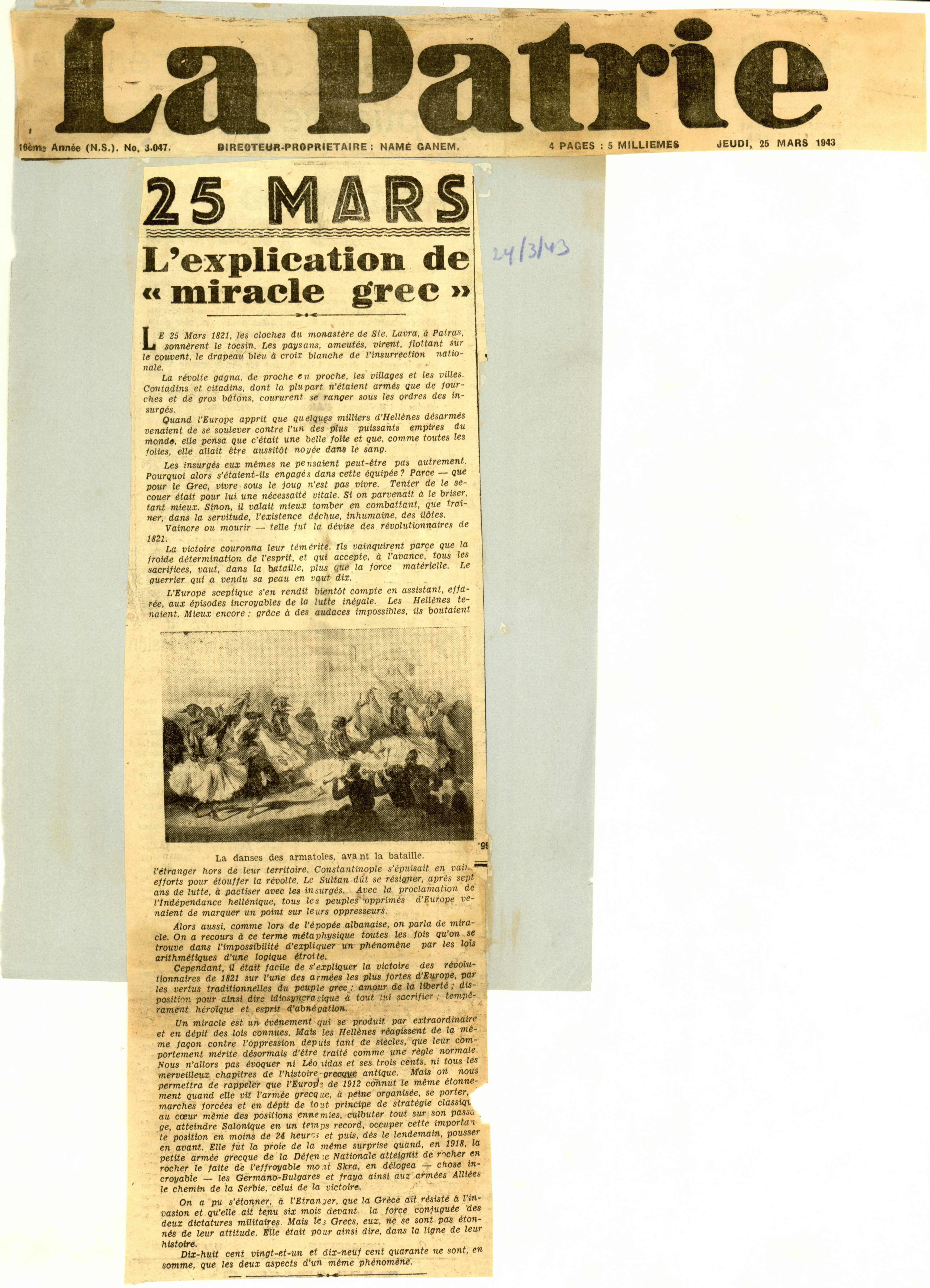 "La Patrie" newspaper clippings, attached on paper, with article titled "25 Mars: L'explication de «miracle grec»", March 25th, 1943, No. 3047.