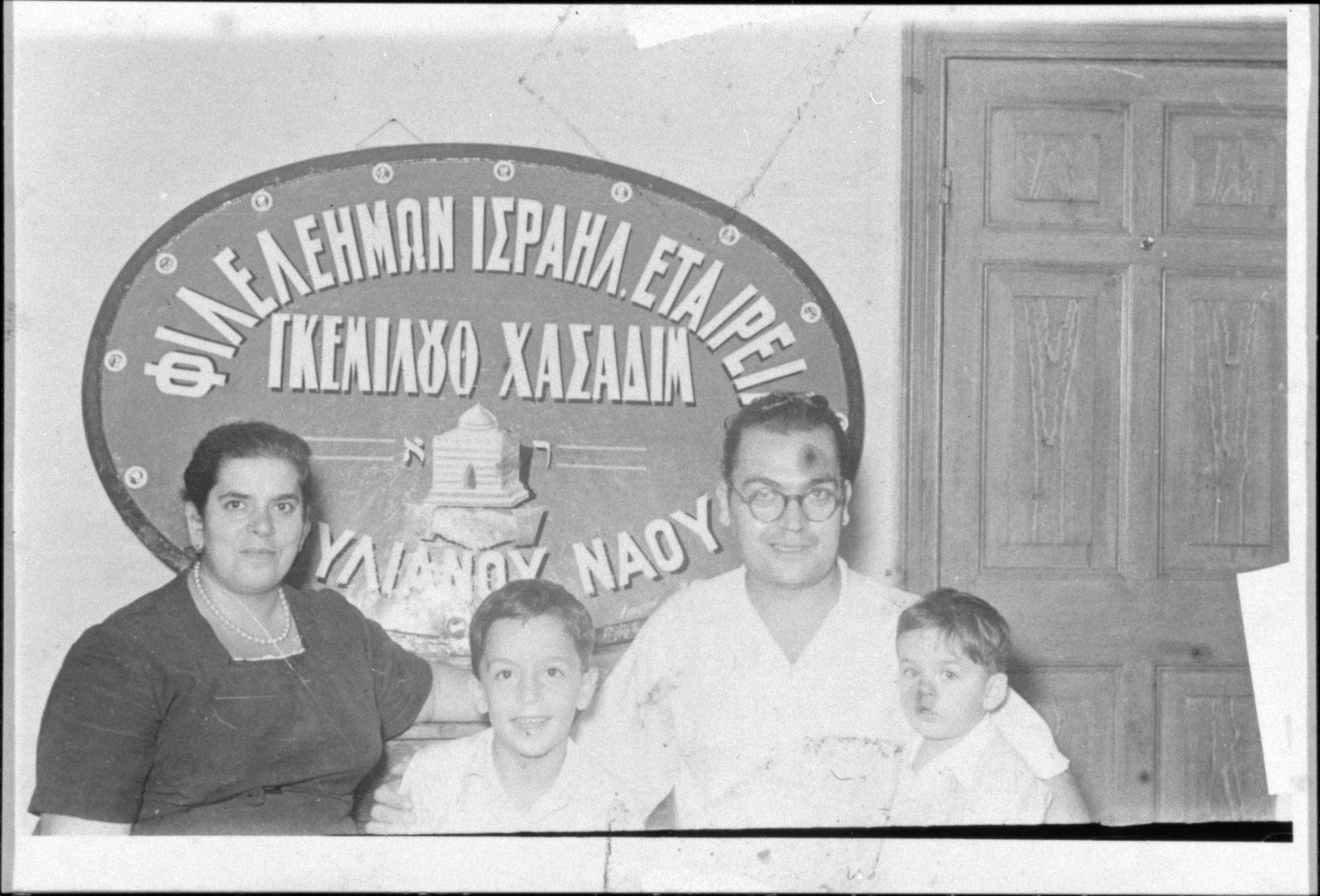 The Mattathias family (Euftychios, Lukia, Nissim and Moses) in the house of Mr. Gershon Mattathias where the synagogue and the community offices were located, photographed in front of a sign of Gemiluth Hasadim (c. 1954, Corfu) (Due to a disagreement, half of the community used Gershon Mattathias' house as a synagogue). From L to R, Lucia Mattathias, Nissim Mattathias, Euftychios Mattathias and Moses