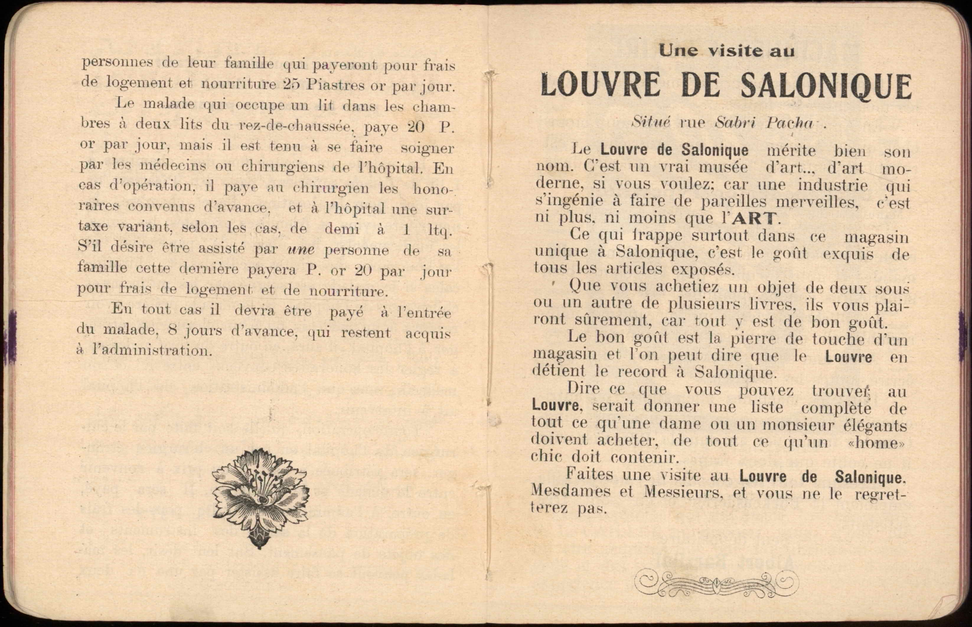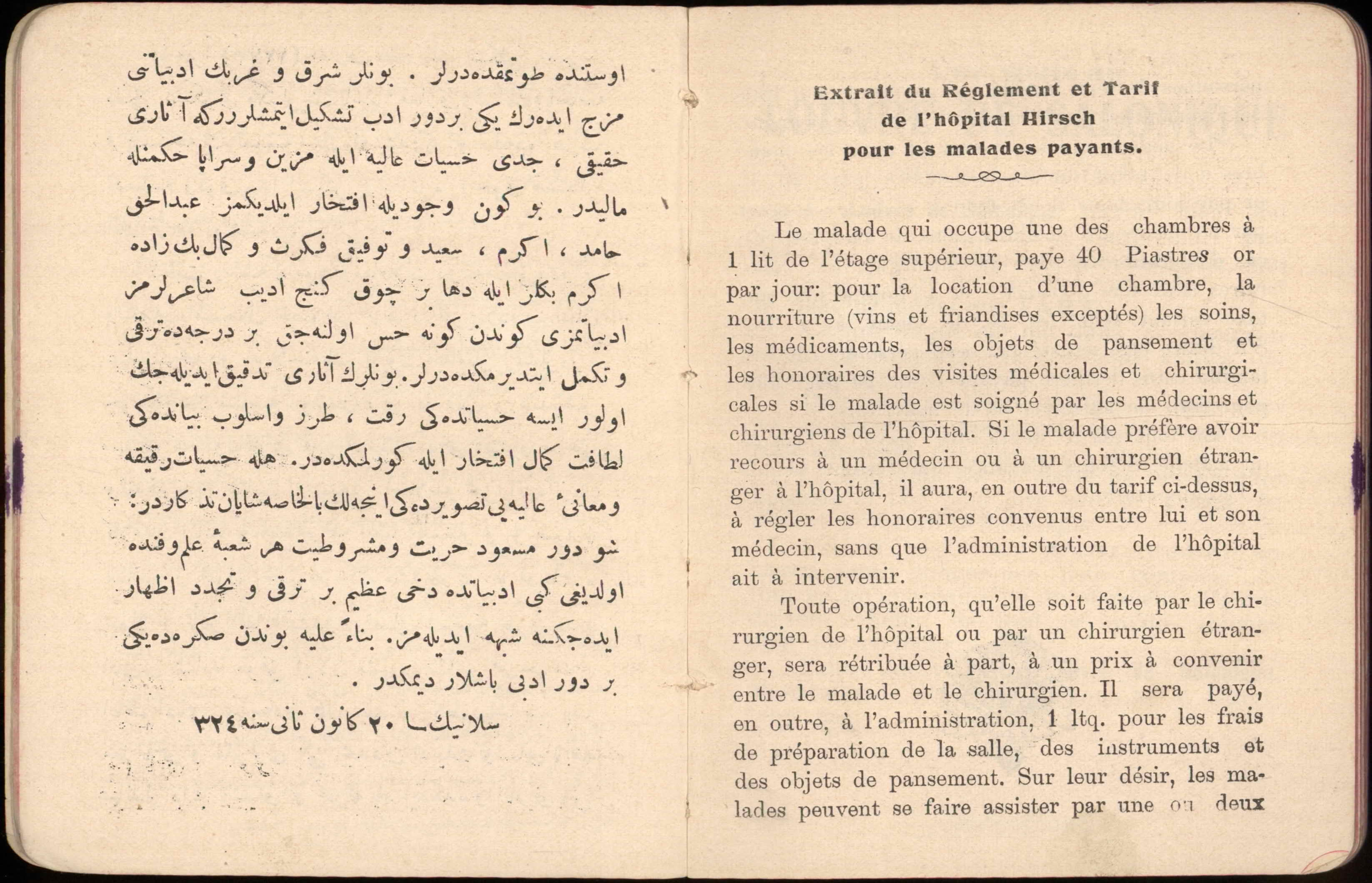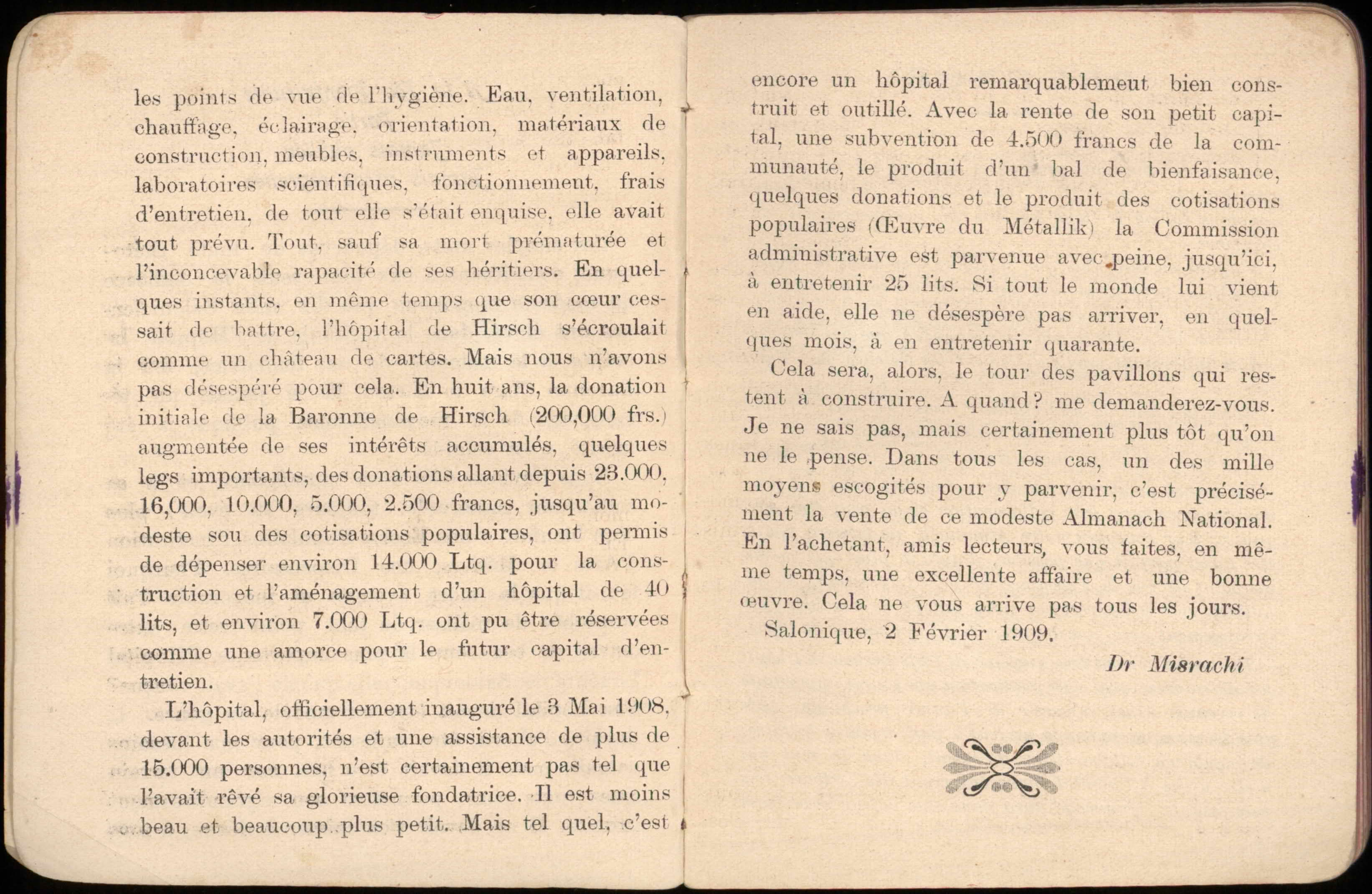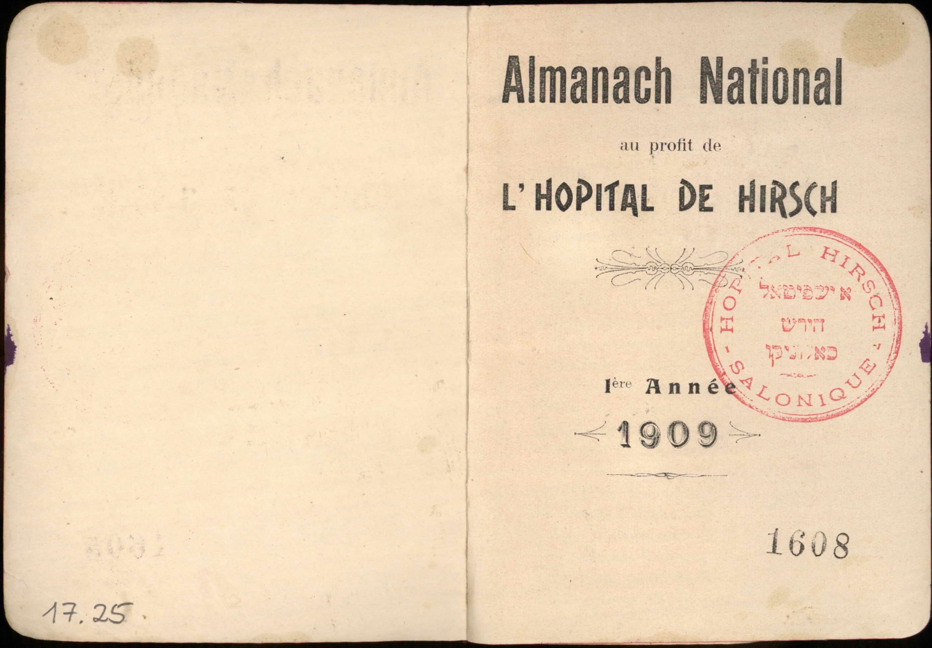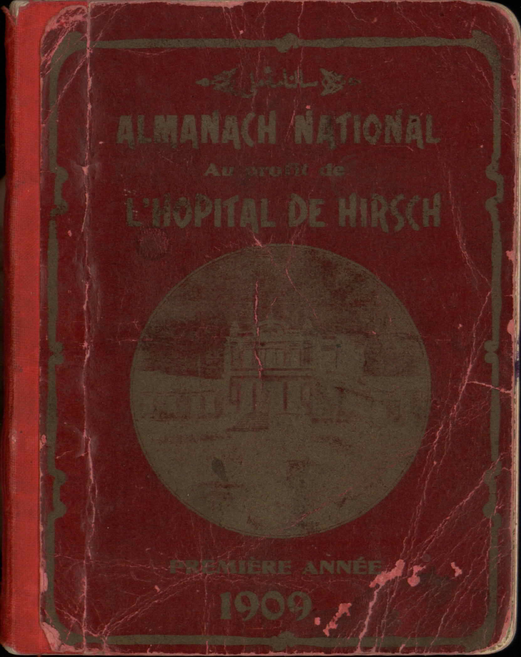 Almanac published by the Hirsch Hospital of Salonica, with Jewish, Christian, and Muslim calendars, various articles, and advertisements.