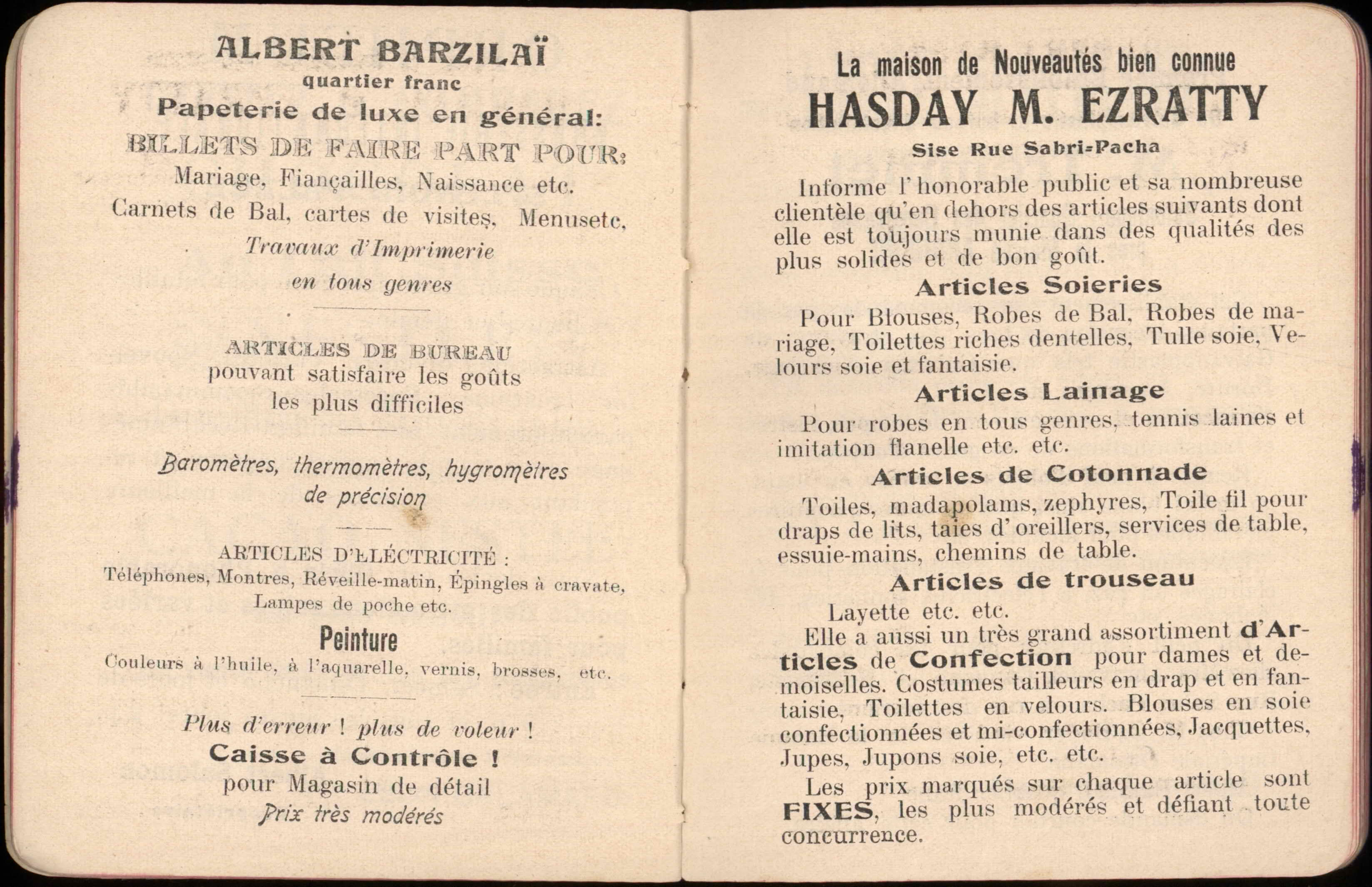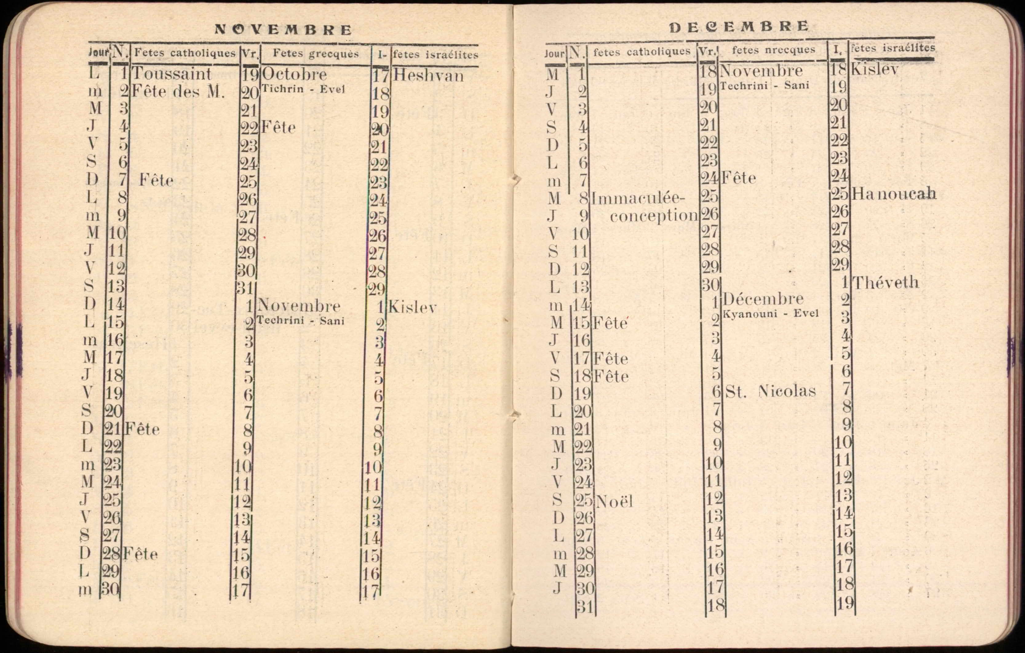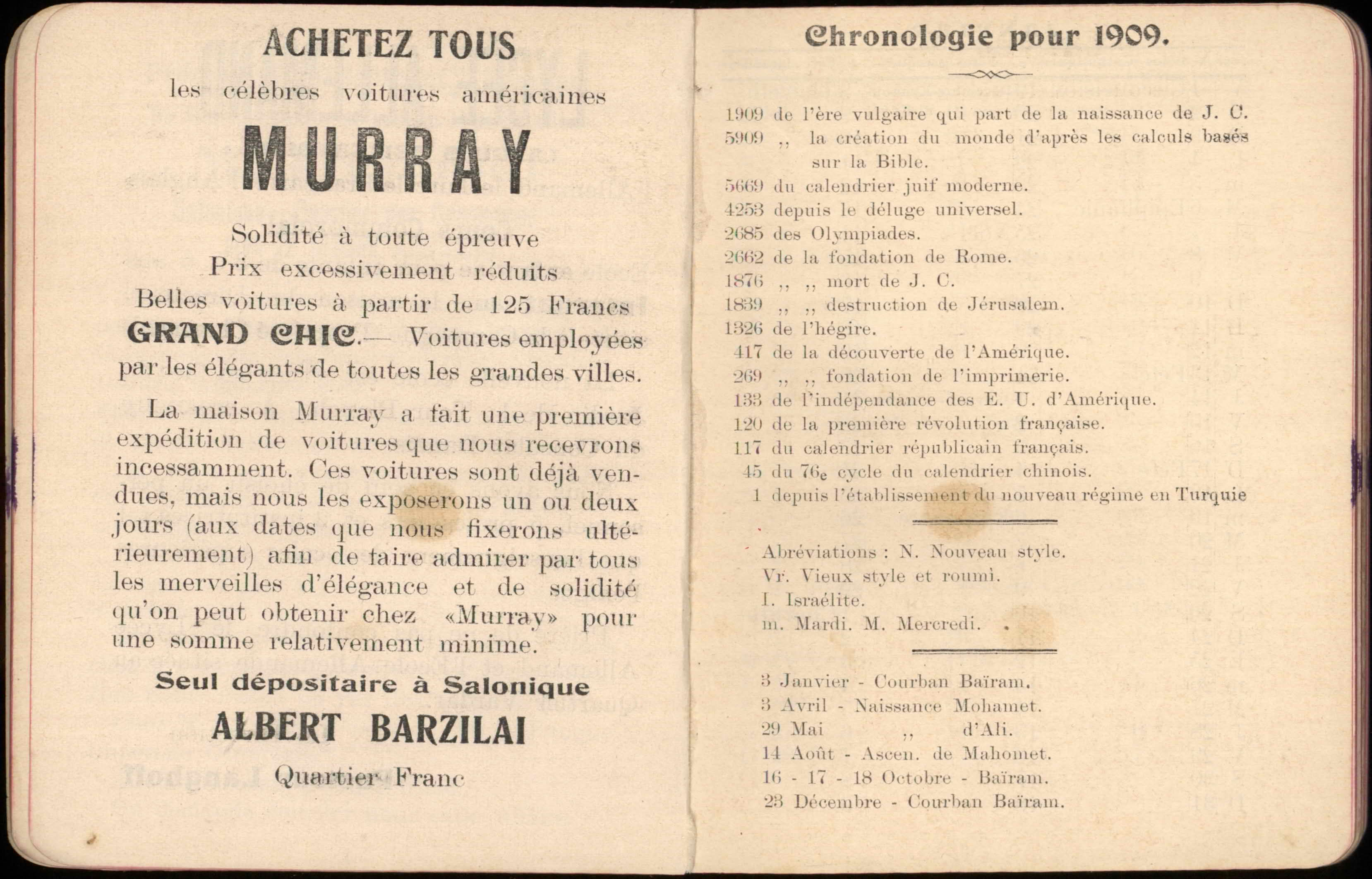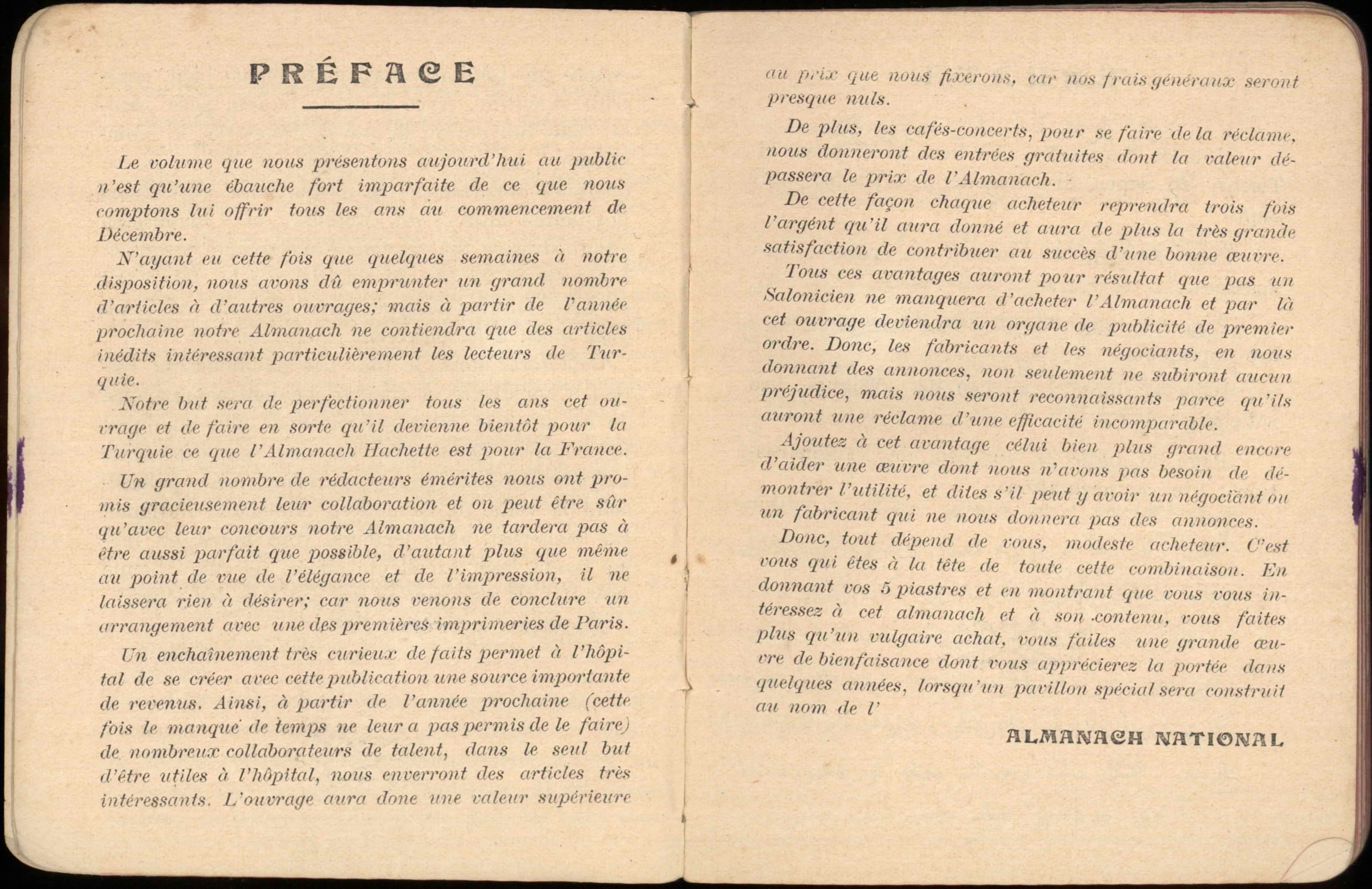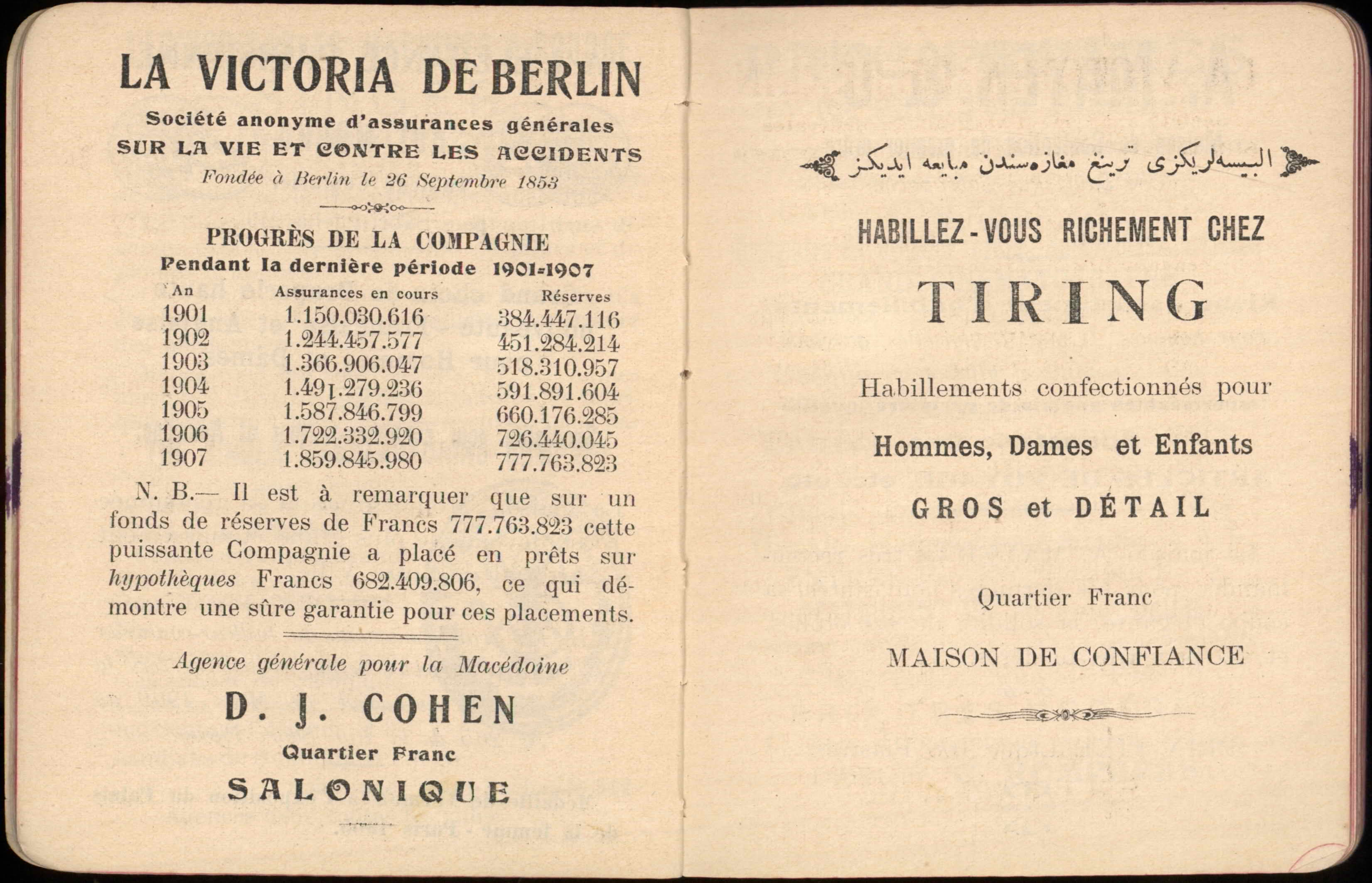 Almanac published by the Hirsch Hospital of Salonica, with Jewish, Christian, and Muslim calendars, various articles, and advertisements.