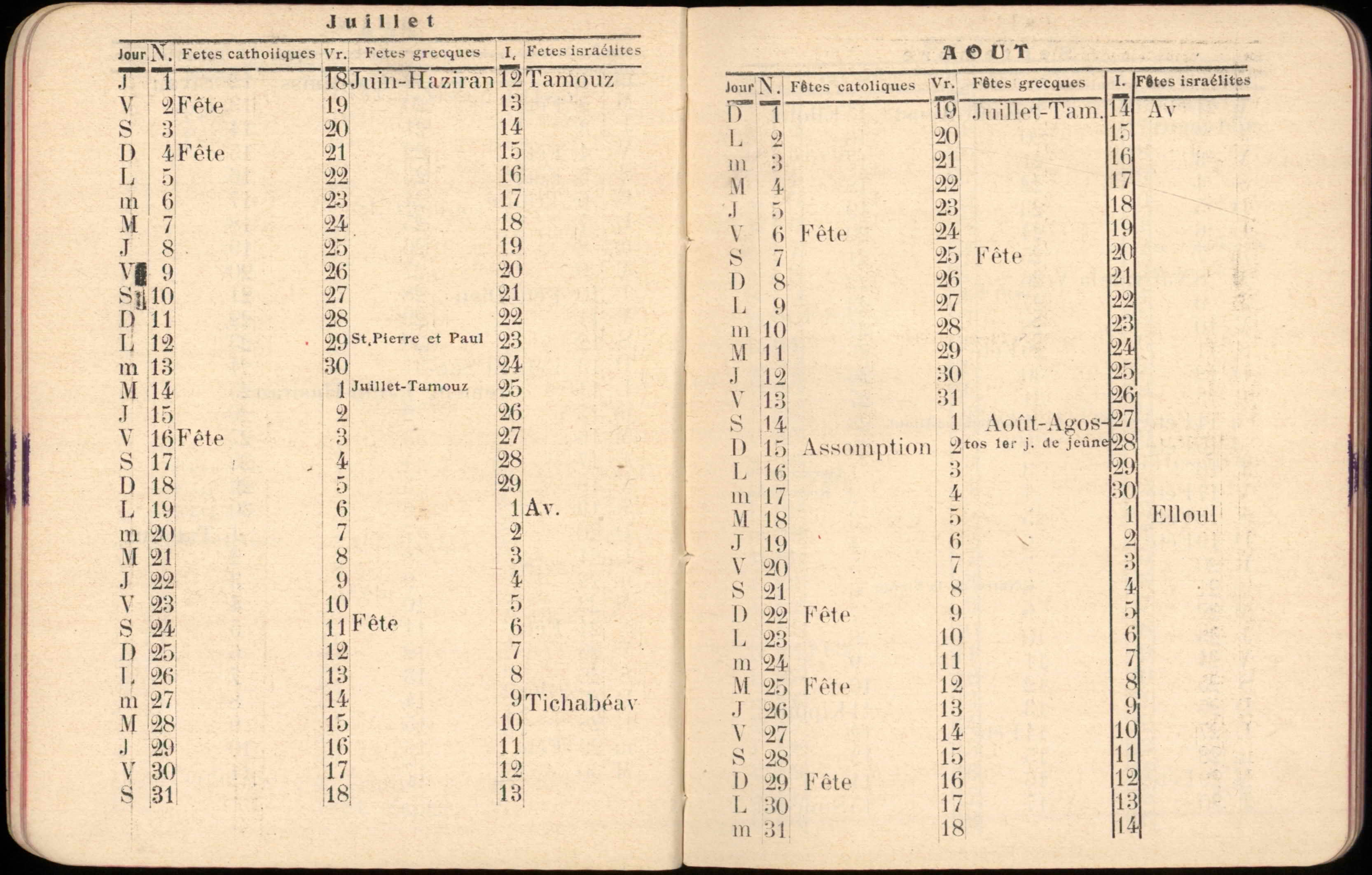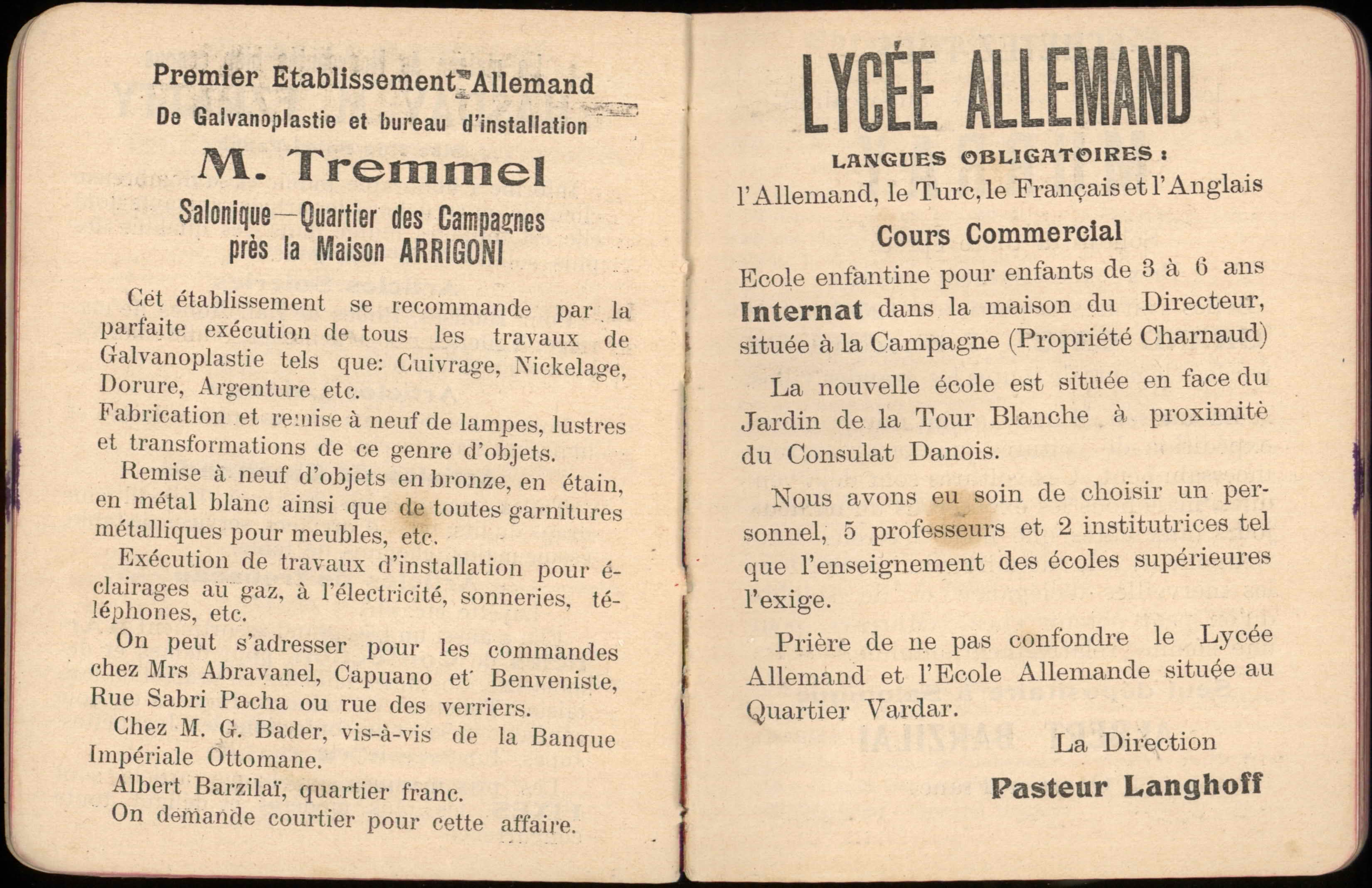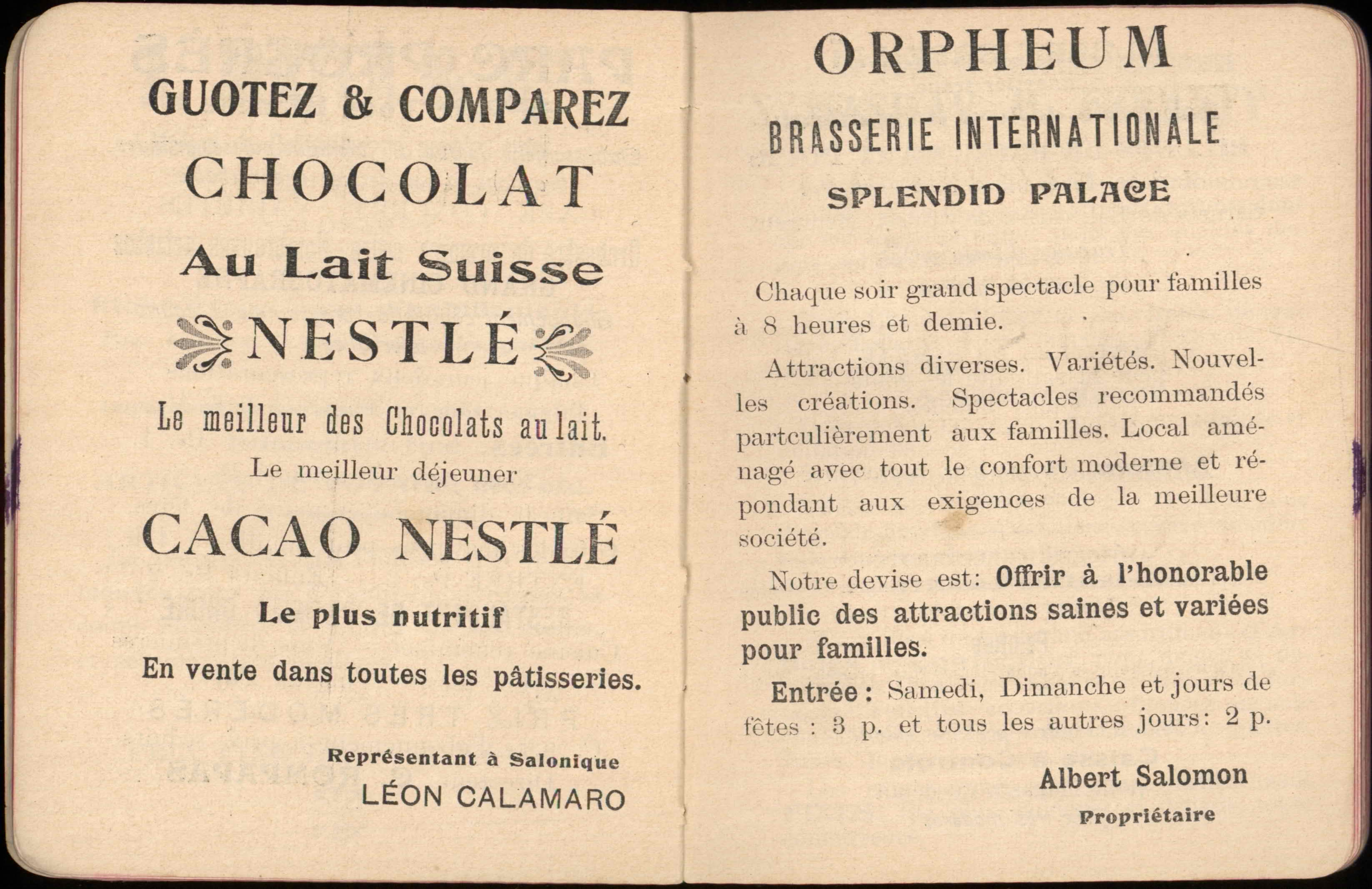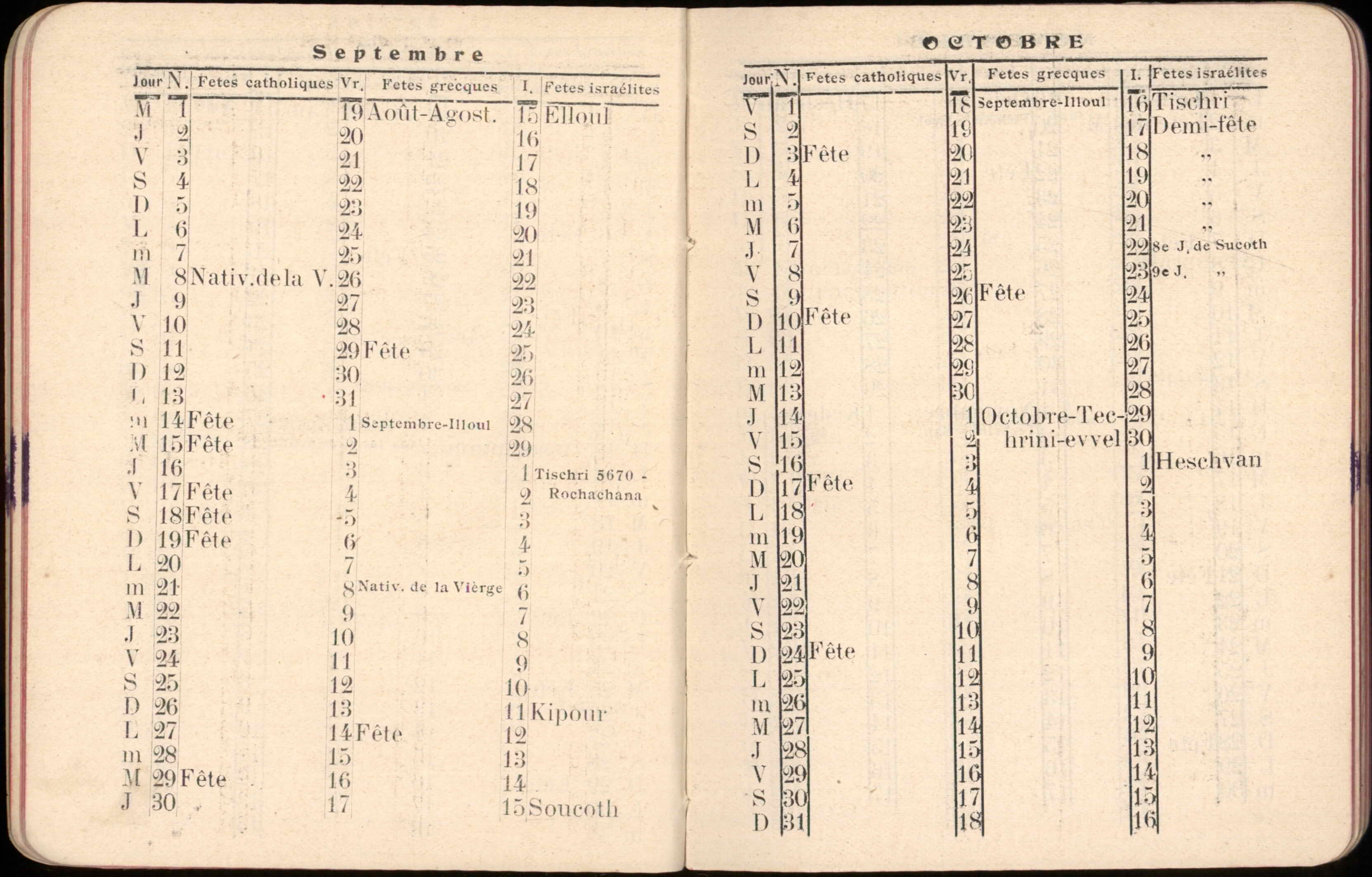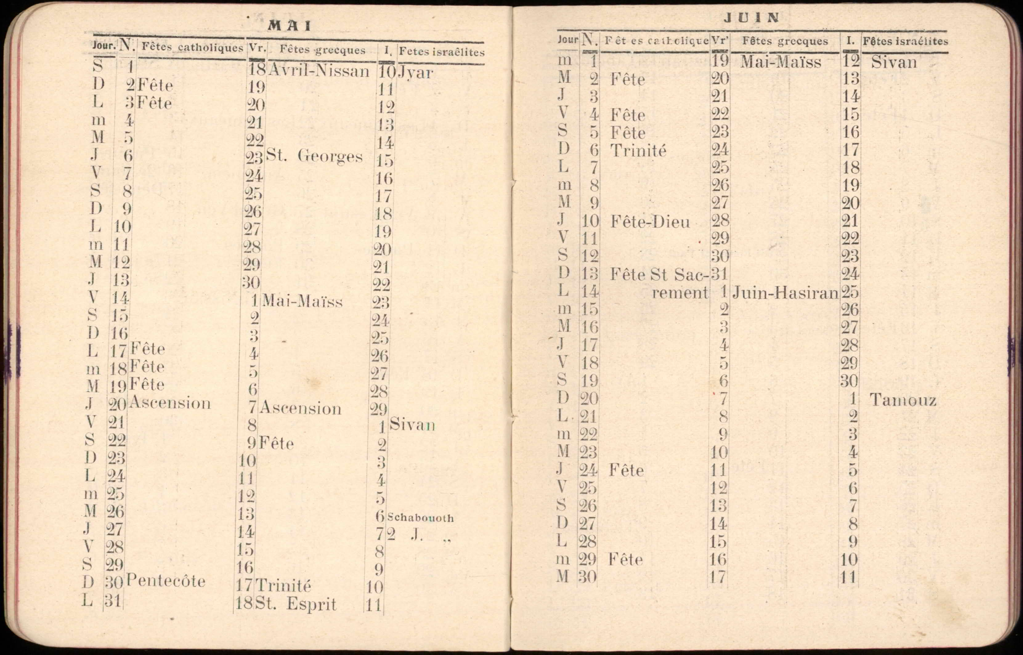 Almanac published by the Hirsch Hospital of Salonica, with Jewish, Christian, and Muslim calendars, various articles, and advertisements.