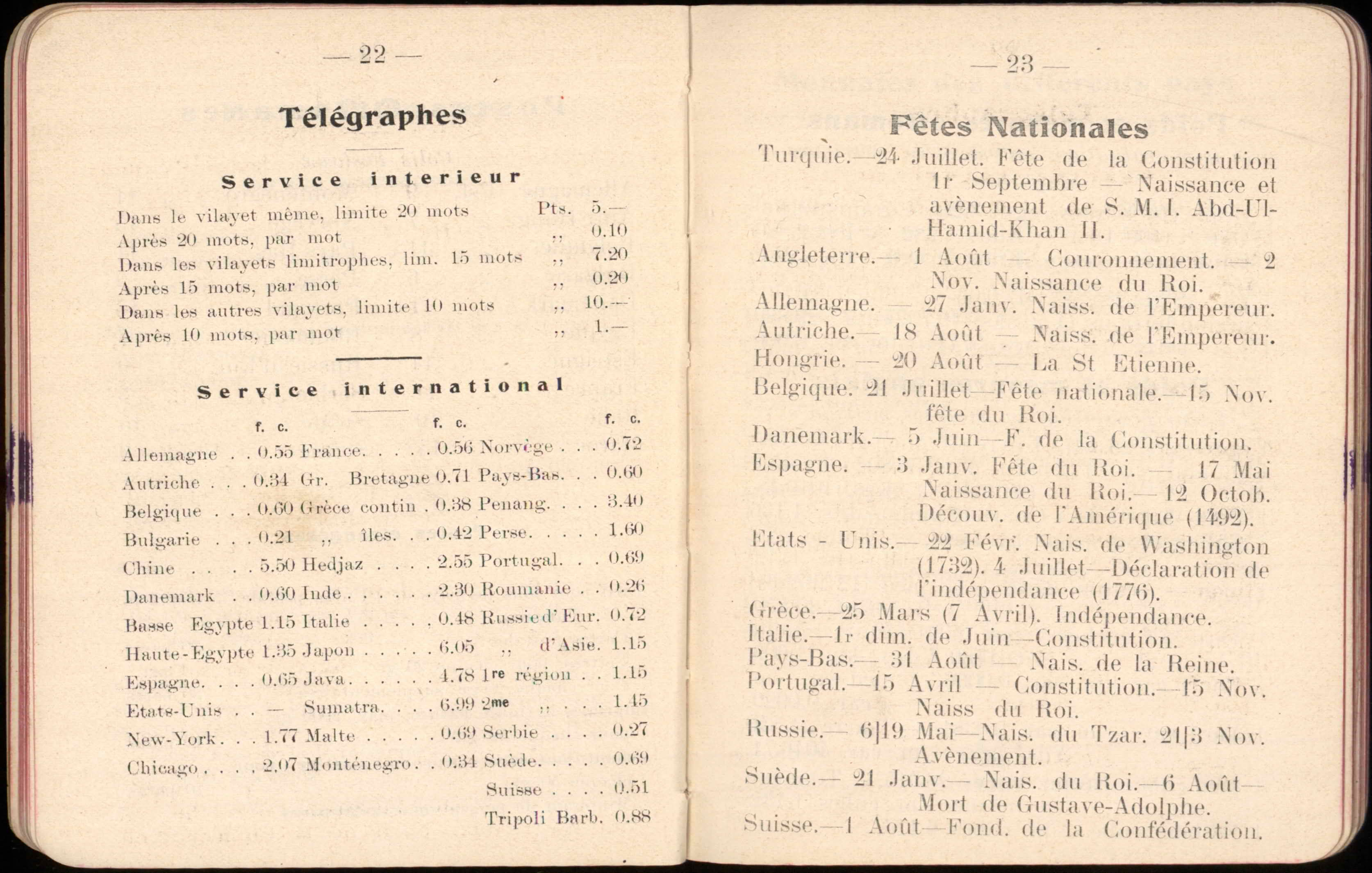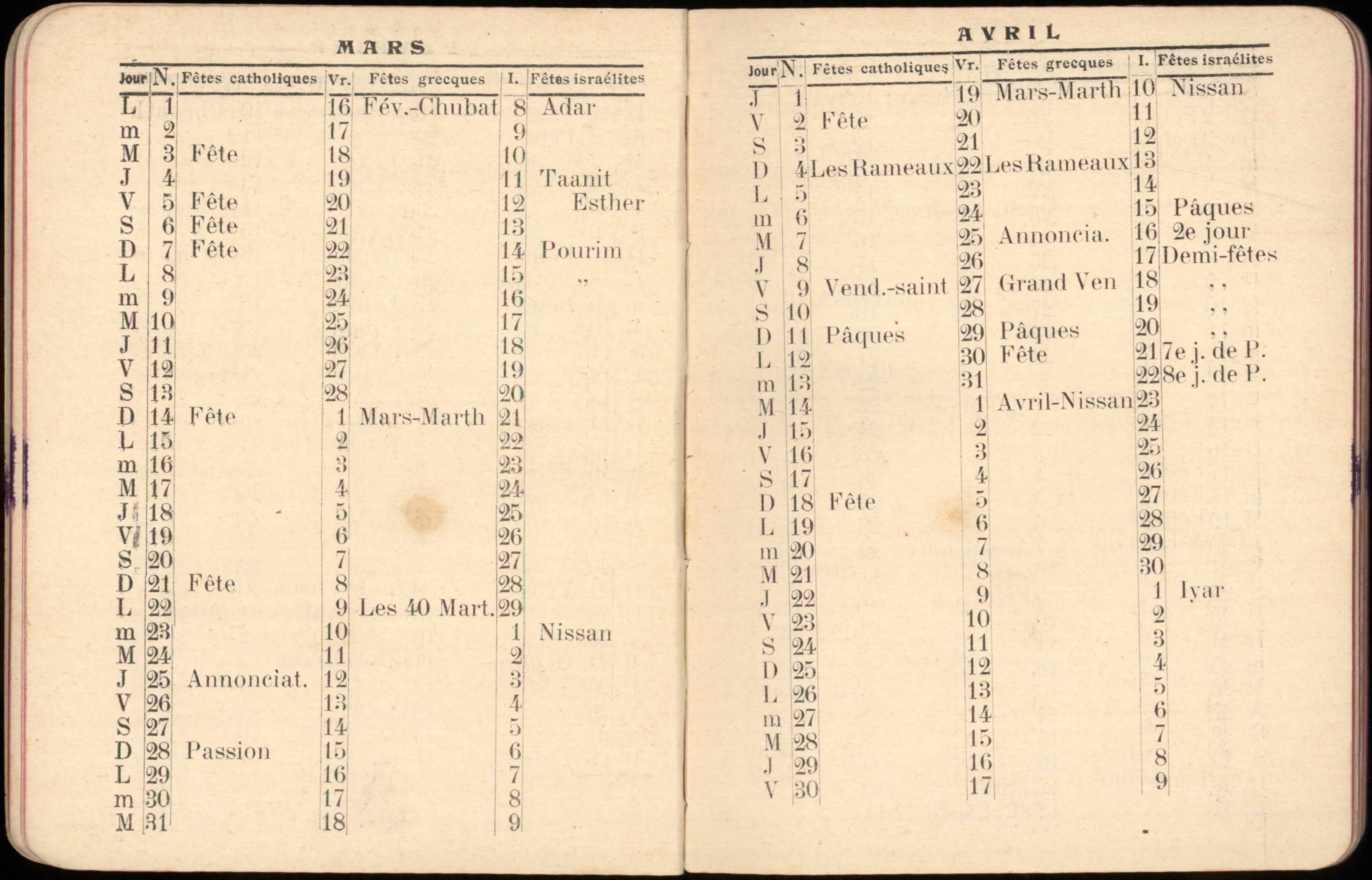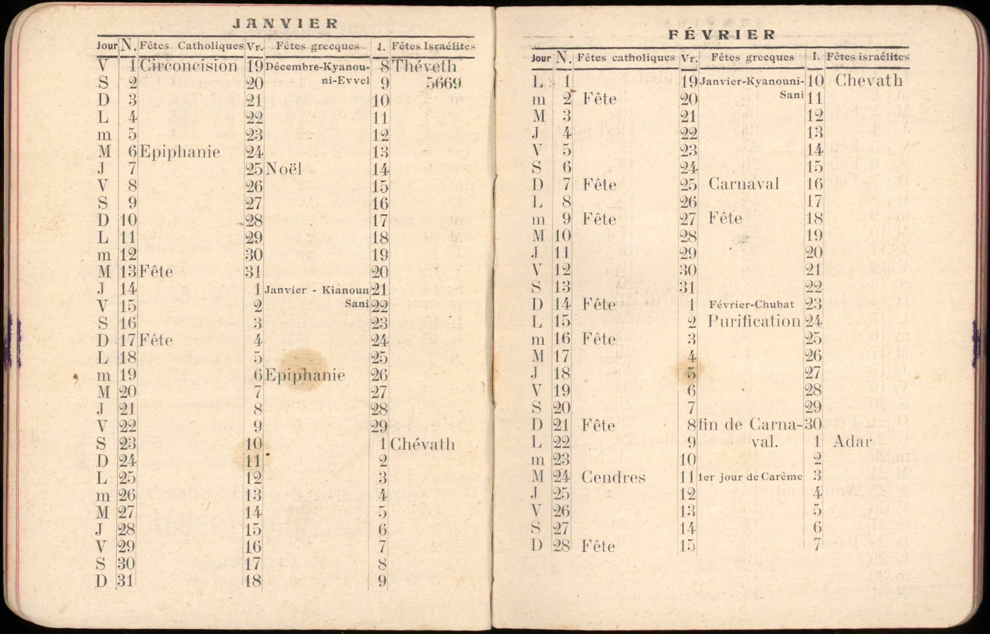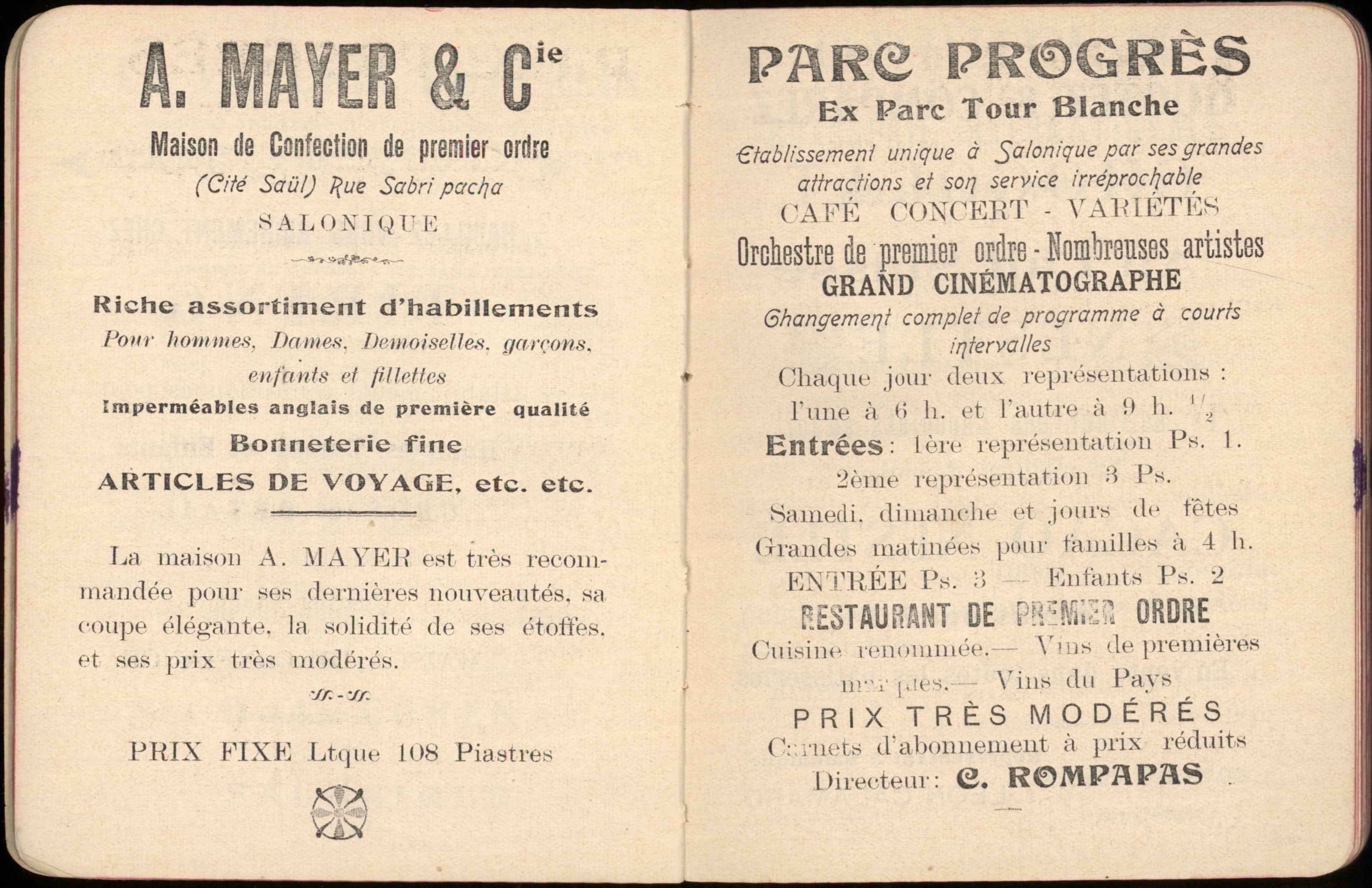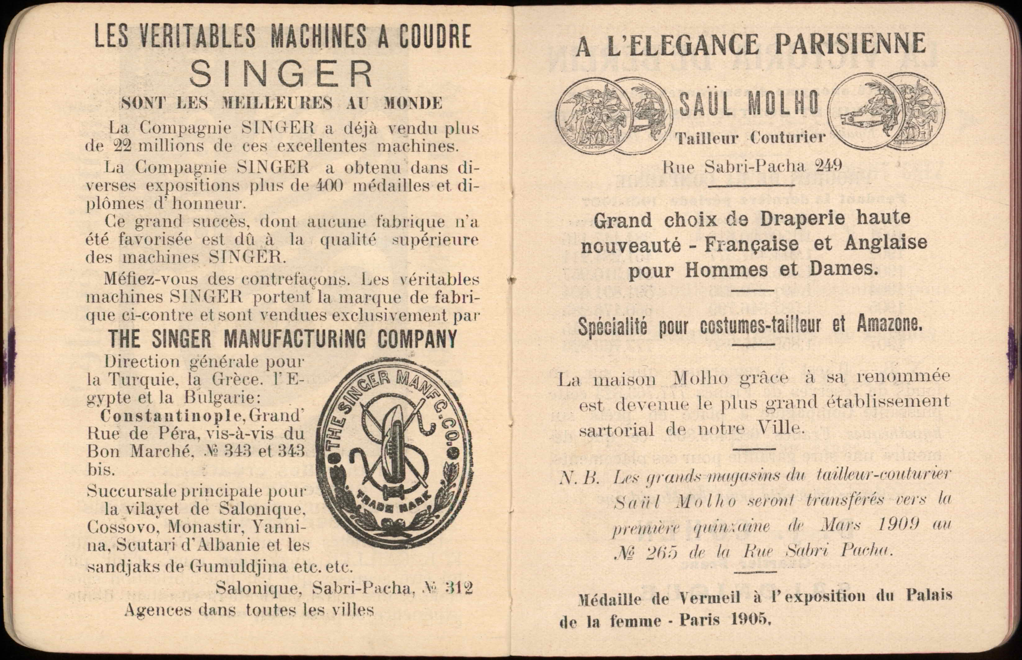 Almanac published by the Hirsch Hospital of Salonica, with Jewish, Christian, and Muslim calendars, various articles, and advertisements.