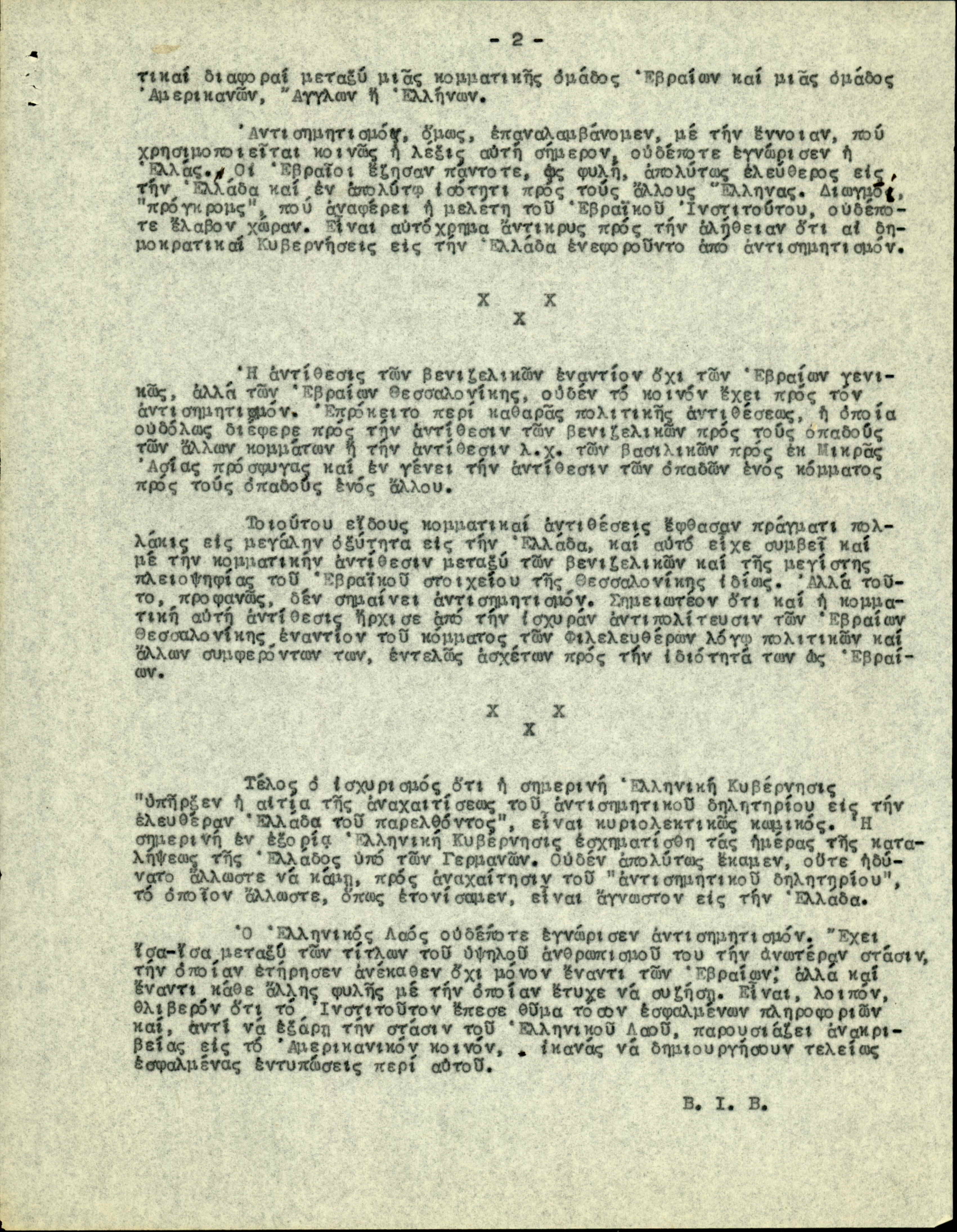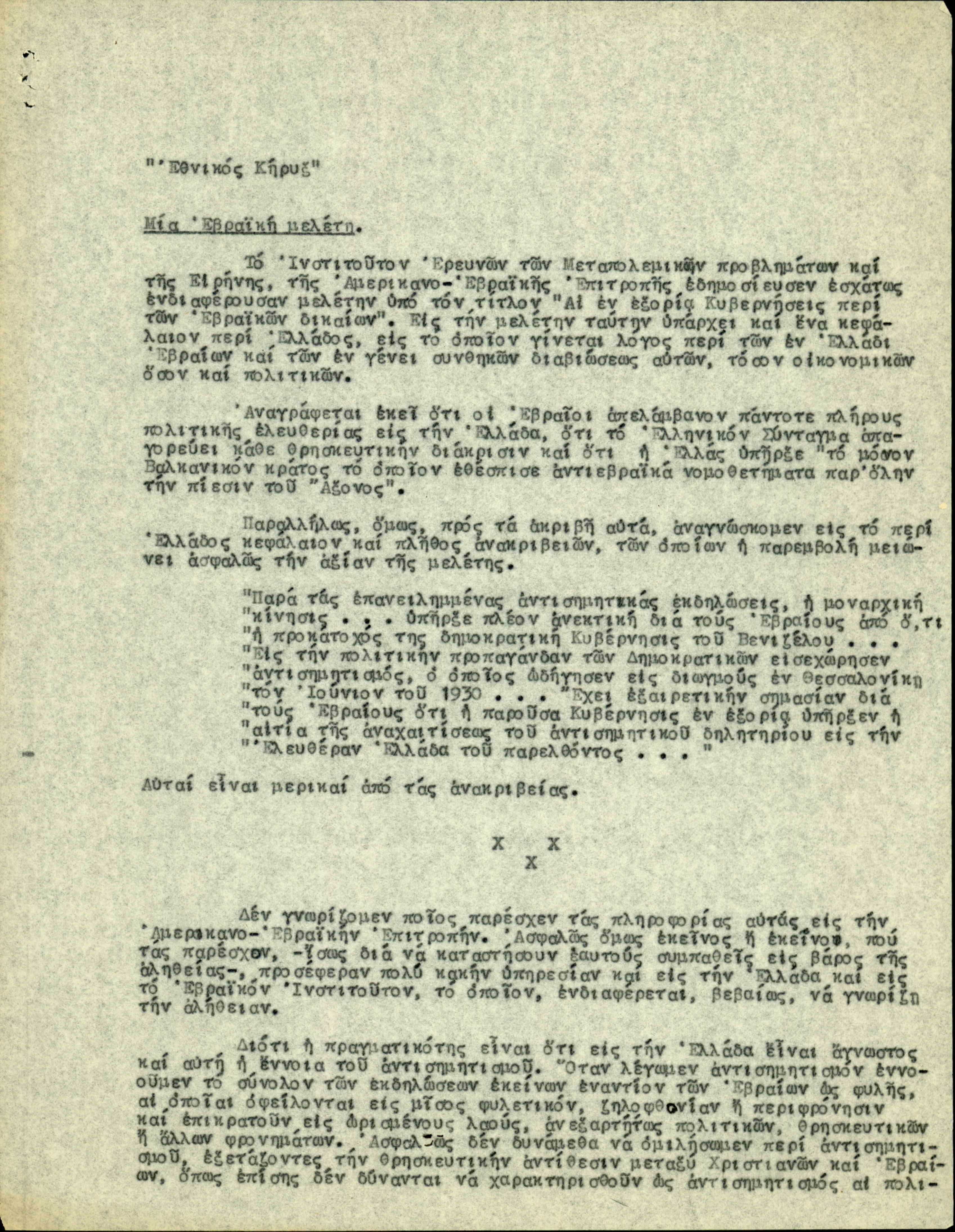 Typescript of an article from "Εθνικός Κήρυξ" ("Ethnikos Kirix") newspaper, titled "Μια Εβραϊκή μελέτη" ("A Jewish study"), signed by B.I.B.