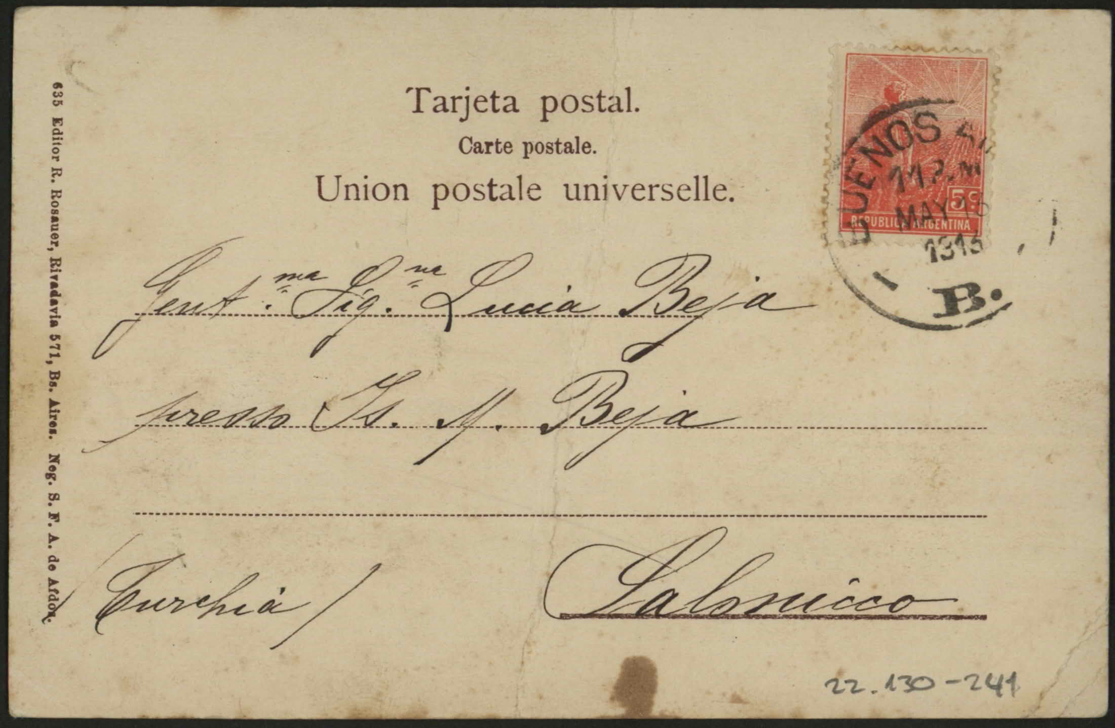 From Florence, Abraham (?), Renee and Andre to Monsieur Isaac M. Beja, Agent - Committion, Salonique, Grece. "Meilleures affections Florence, Abraham (?), Renee, Andre".