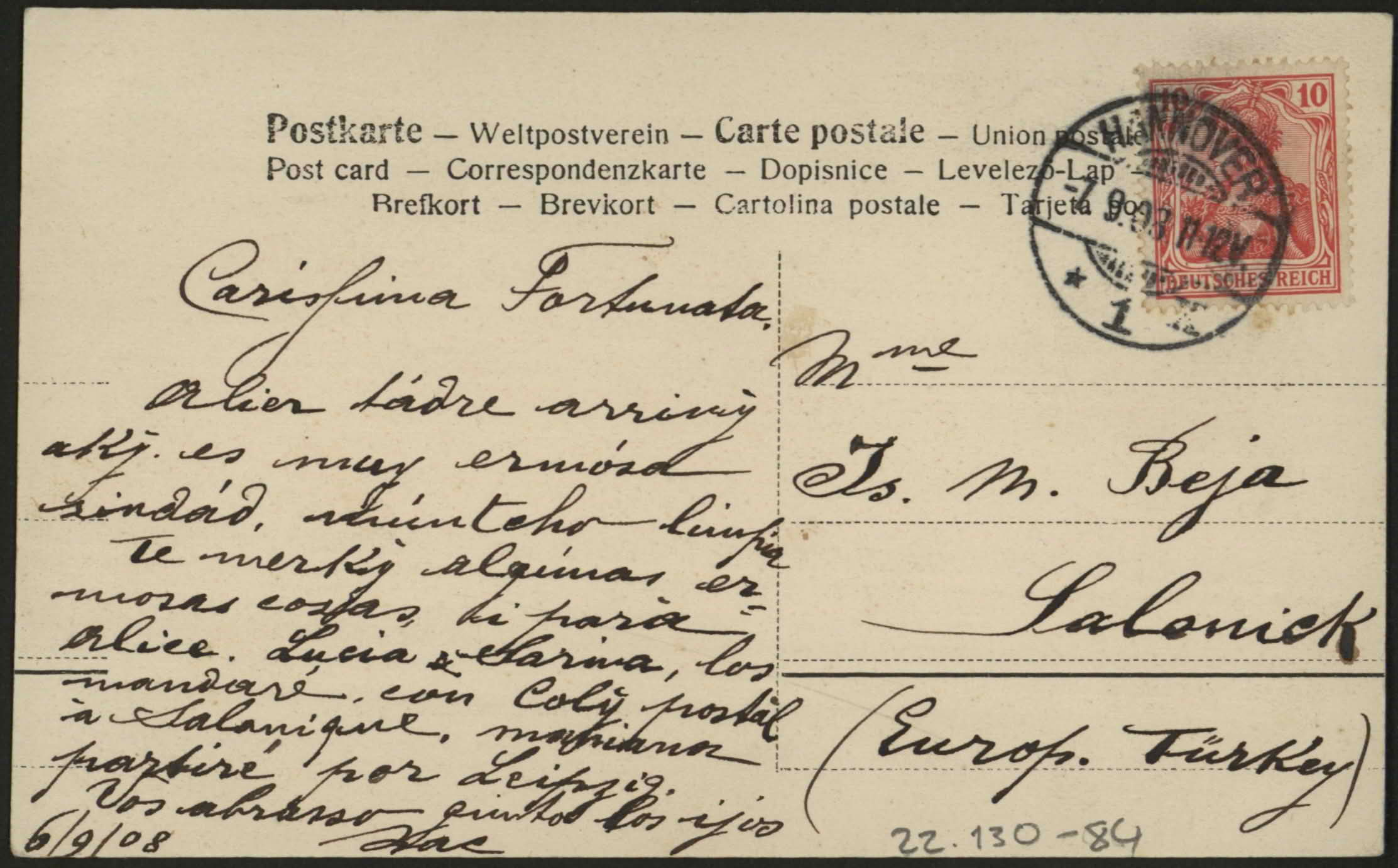 | dc.description | From Isac to Mme. Is. M. Beja, Salonick, Europ. Tuerkey. "8 Sept. 908, Isac". | |