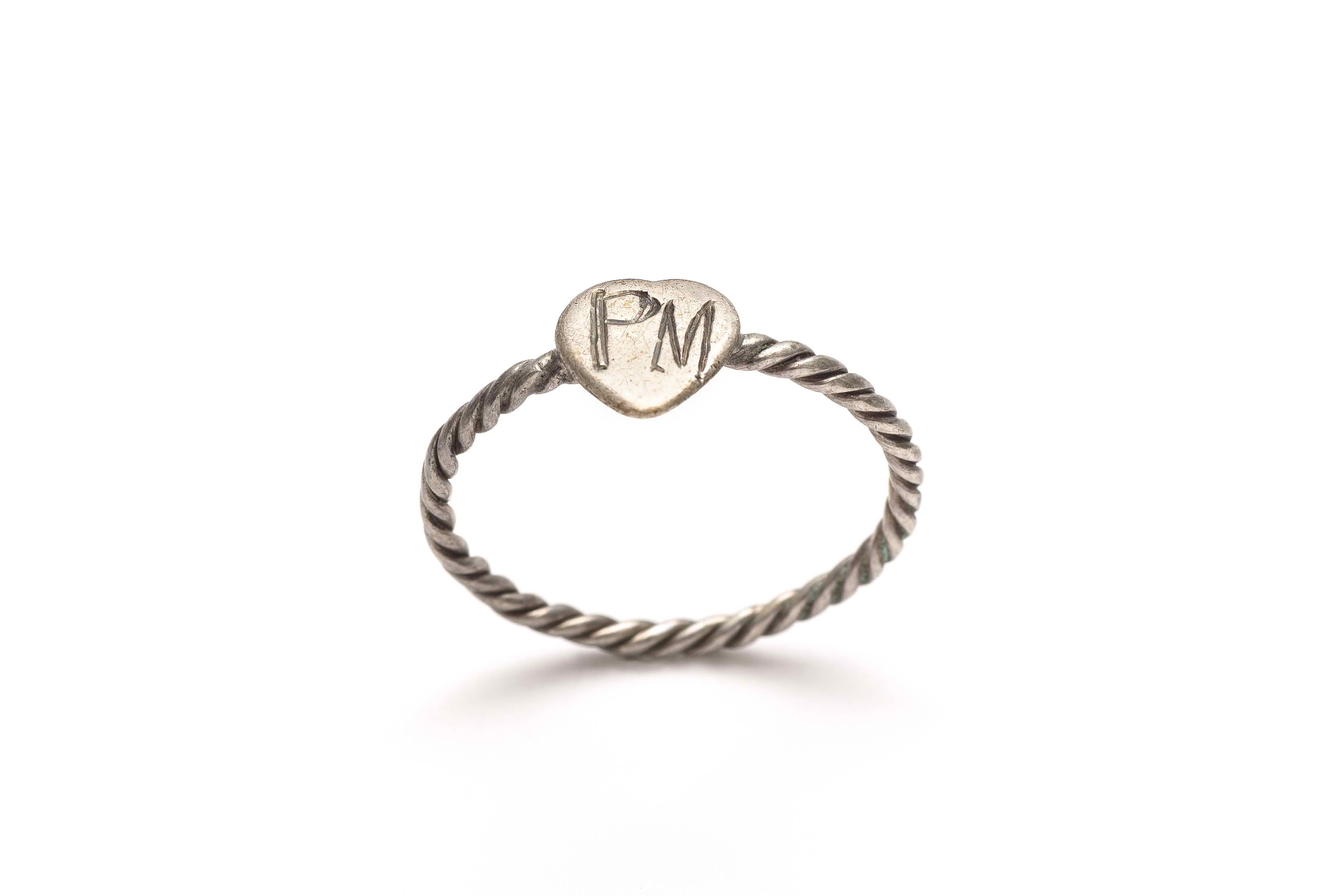 Silver ring, made of twisted wire, with a heart-shaped platelet engraved with "PM", from Salonica.