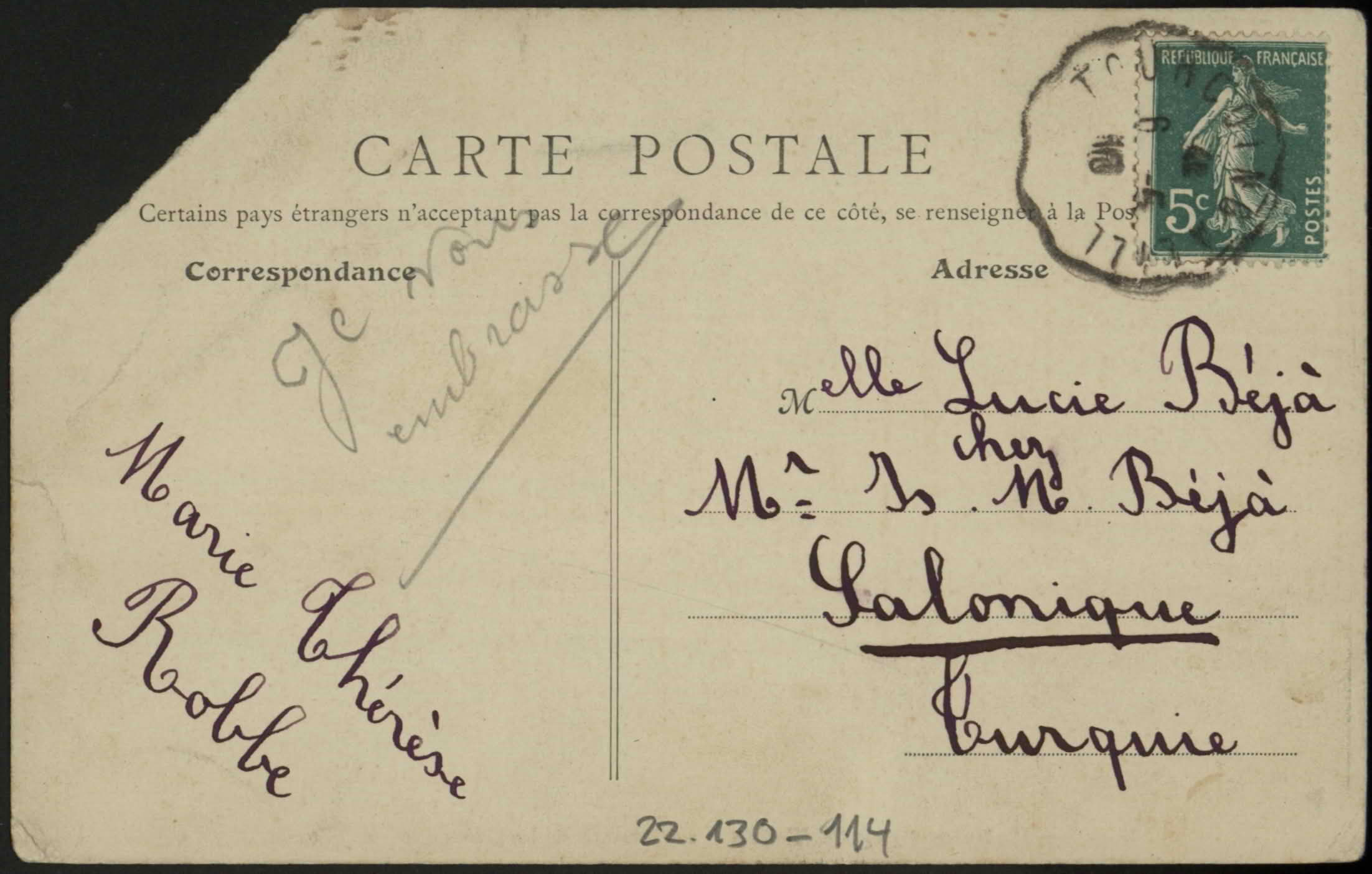 From Isac to Signora Lucia di Is. M. Beja, Salonicco, Turchia. "Carissima Lucia, Te escrivi el otro dia, te enformo que esto muy bueno malgrado la canseria. Bezas alos caros ijas Alfredo, Sarina, Alberto & Irmica. De assilano vos mandare regalos te abuas fo tu papa Isac, 8/5/910". "Oy le escrivy carta ala gruta" (on front side).