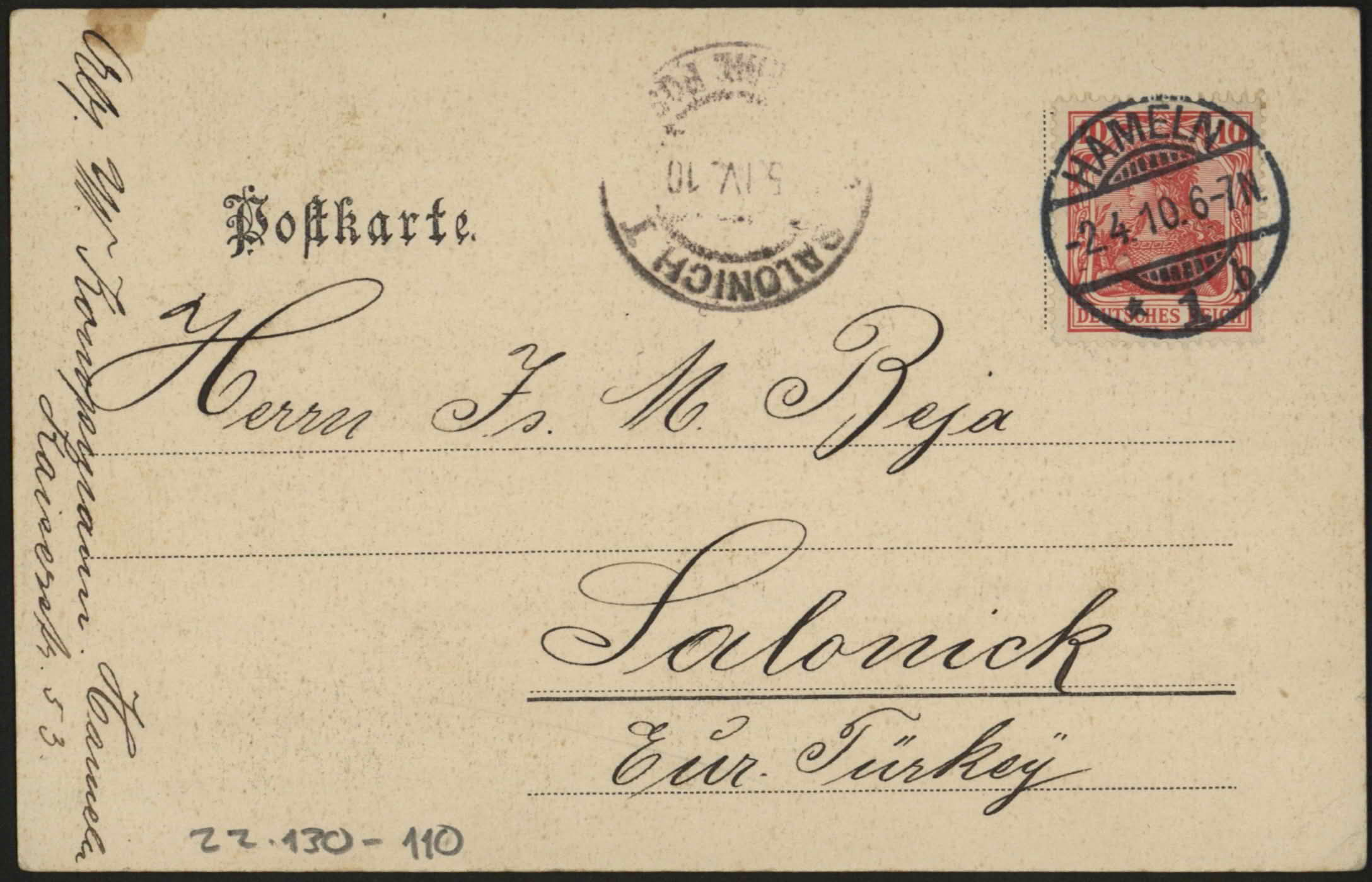 From Isac to Signora Is. M. Beja, Salonicco, Turchia. "4/5/910, mi truvo in perfetta salote, mi confermo telegramma oggi, Cordial, Isac".