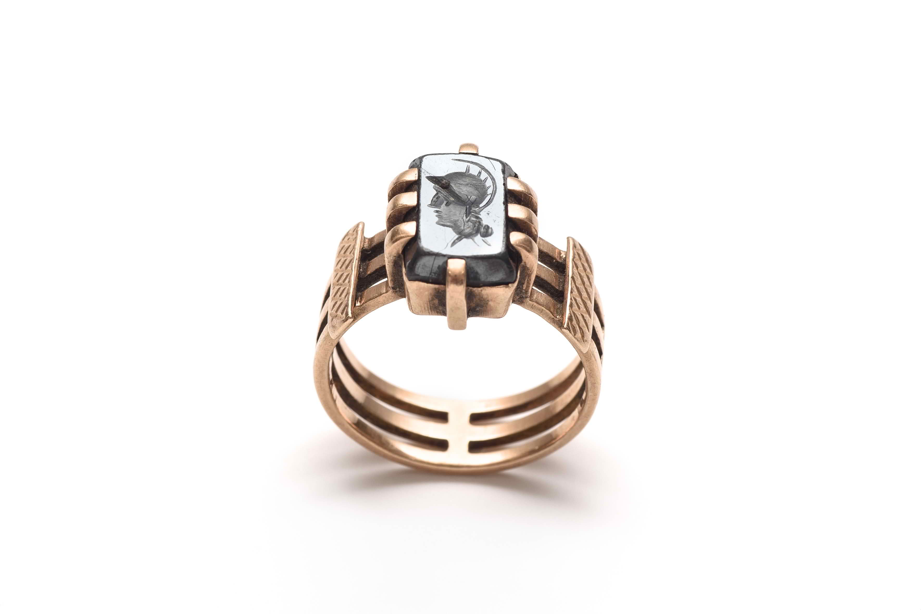 Gold ring, with black diamond, intaglio of an ancient Godess in profile, made of three linked gold bands.