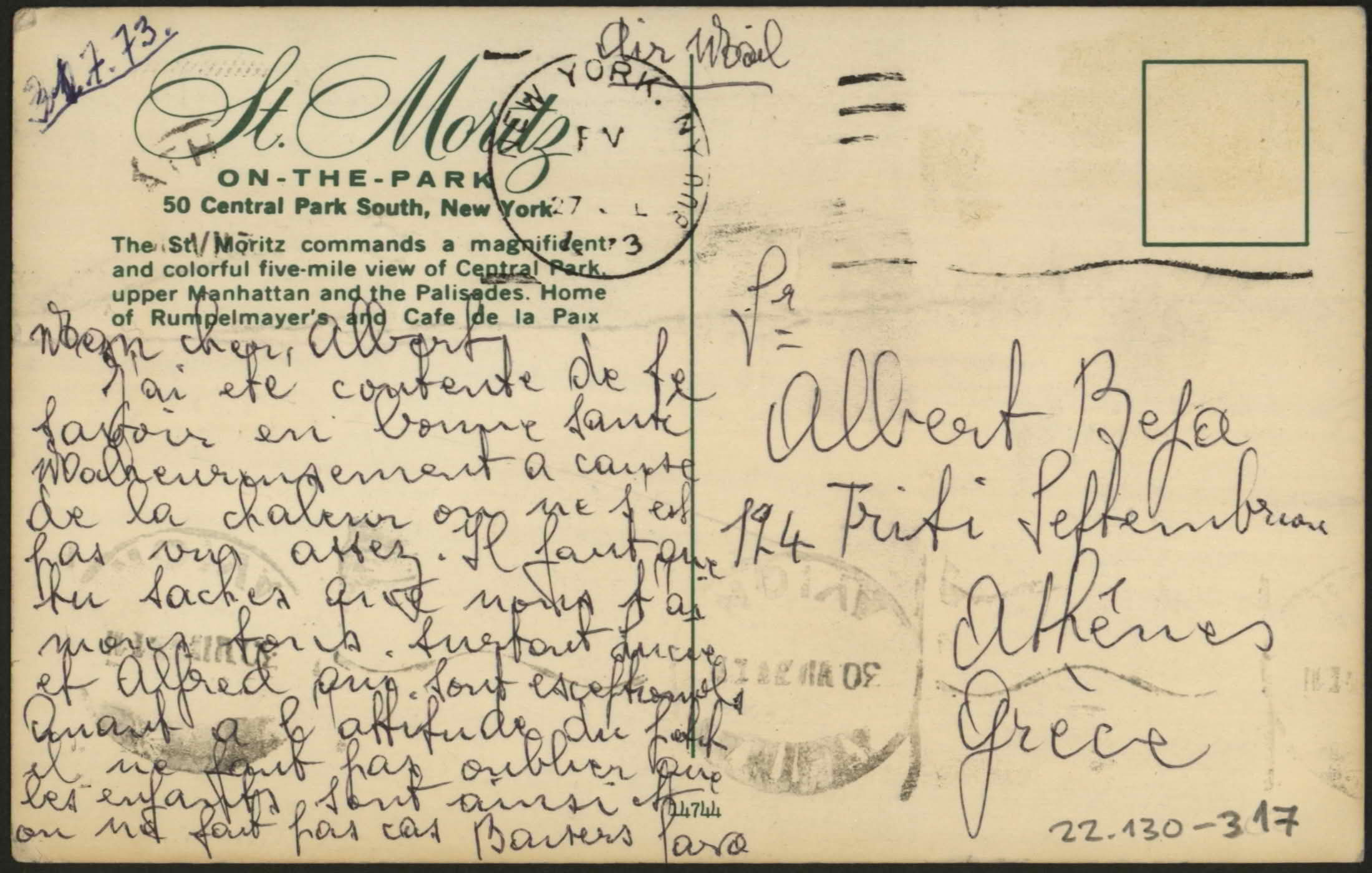 From Sara to Albert Beja, 124 Triti Septembriou, Athenes, Grece. "31.7.73. Mon cher Albert, J'ai ete contente de se savoir en bonne sante. Malheureusement a compte de la chaleur on ne s'est pas vus assez. Il faut que tu saches que nous s'aimons tous. Surtout Lucie et Alfred qui sont exceptionable. Quand a l'attitude du petit il ne faut pas oublier que les enfants sont ainsi. On ne fait pas …, Sara".