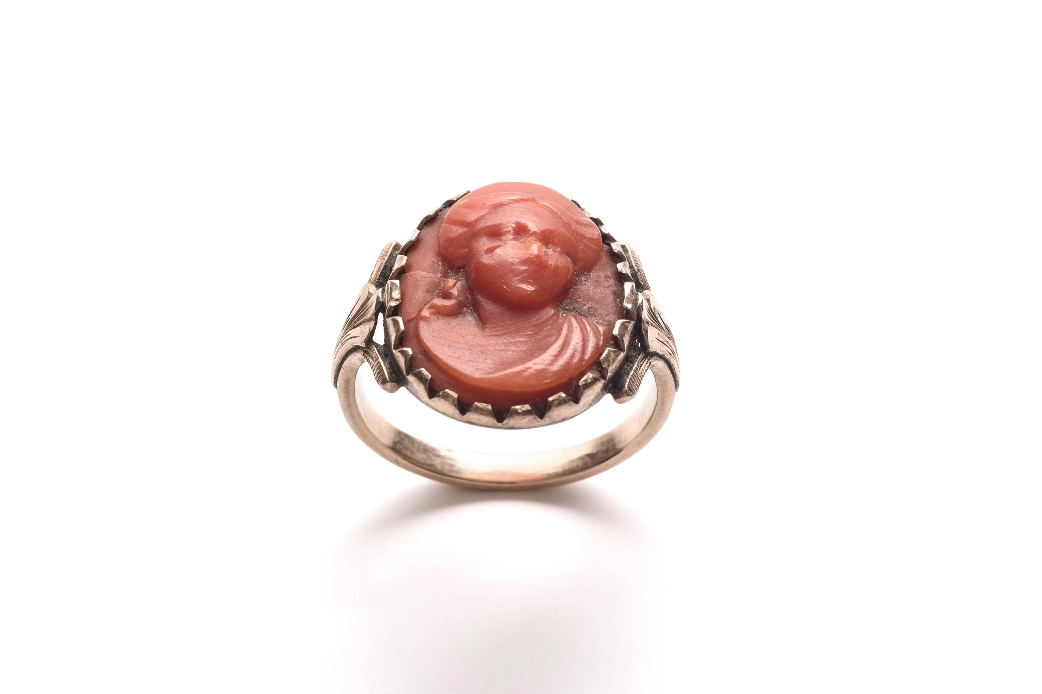 Woman's gold ring, large oval bezel set with coral engraved with female bust in relief, shanks decorated with leaves.
