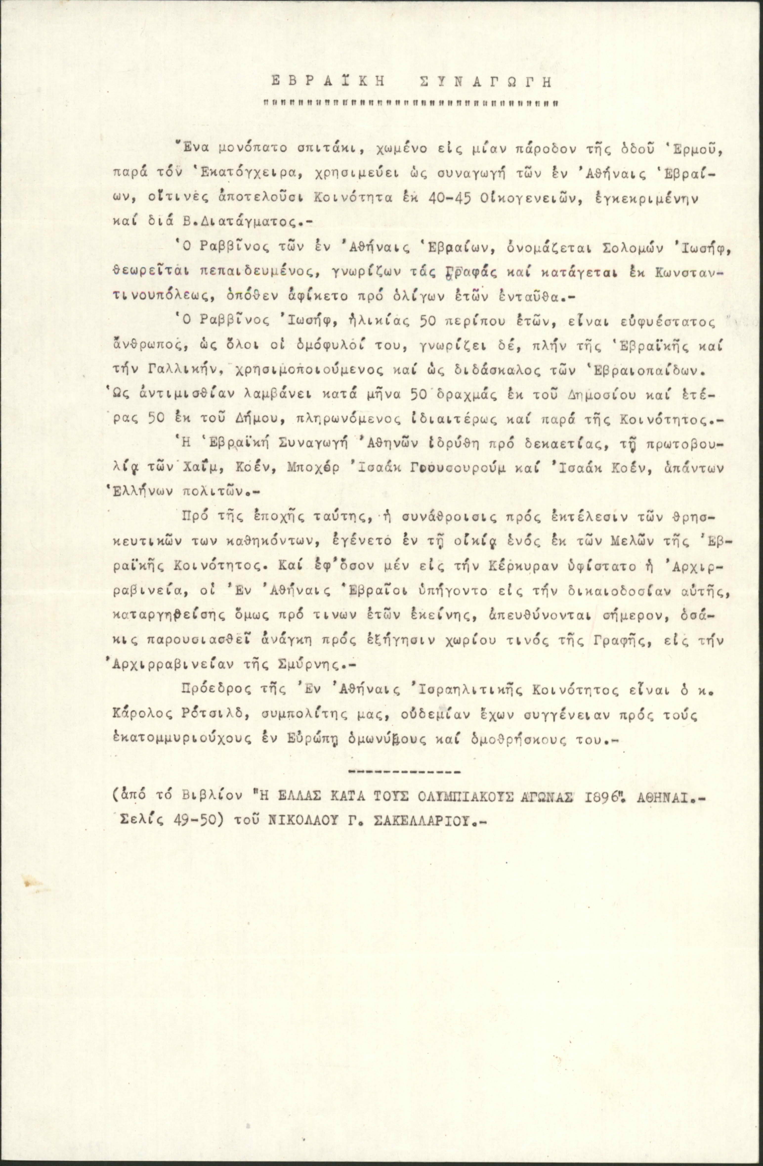| dc.description | Type-written sheet regarding the first synagogue of the Jewish Community of Athens, located in Ivis Street, copied from the book "Greece during the 1896 Olympic Games", by Nikolaos G. Sakellariou. | |