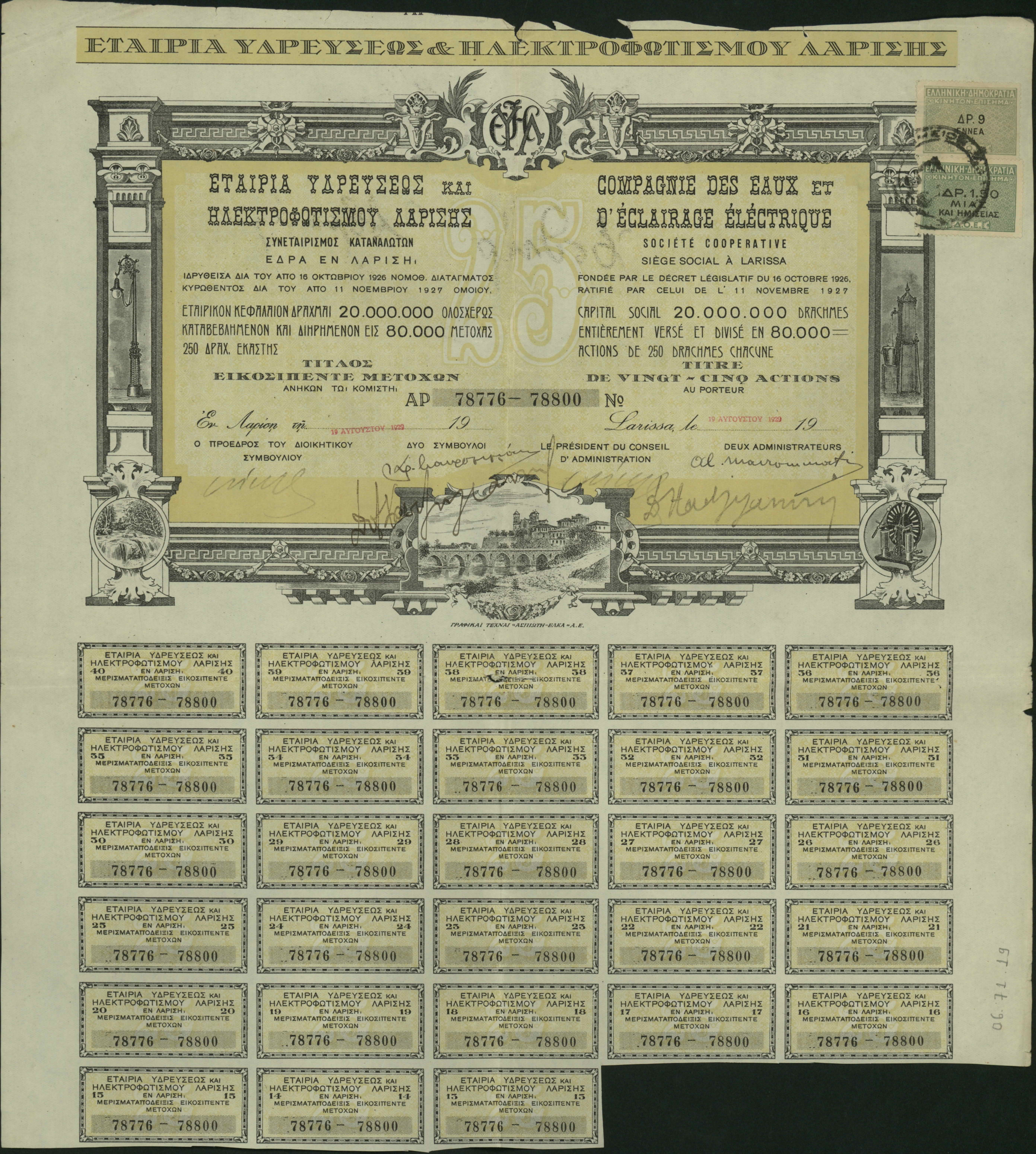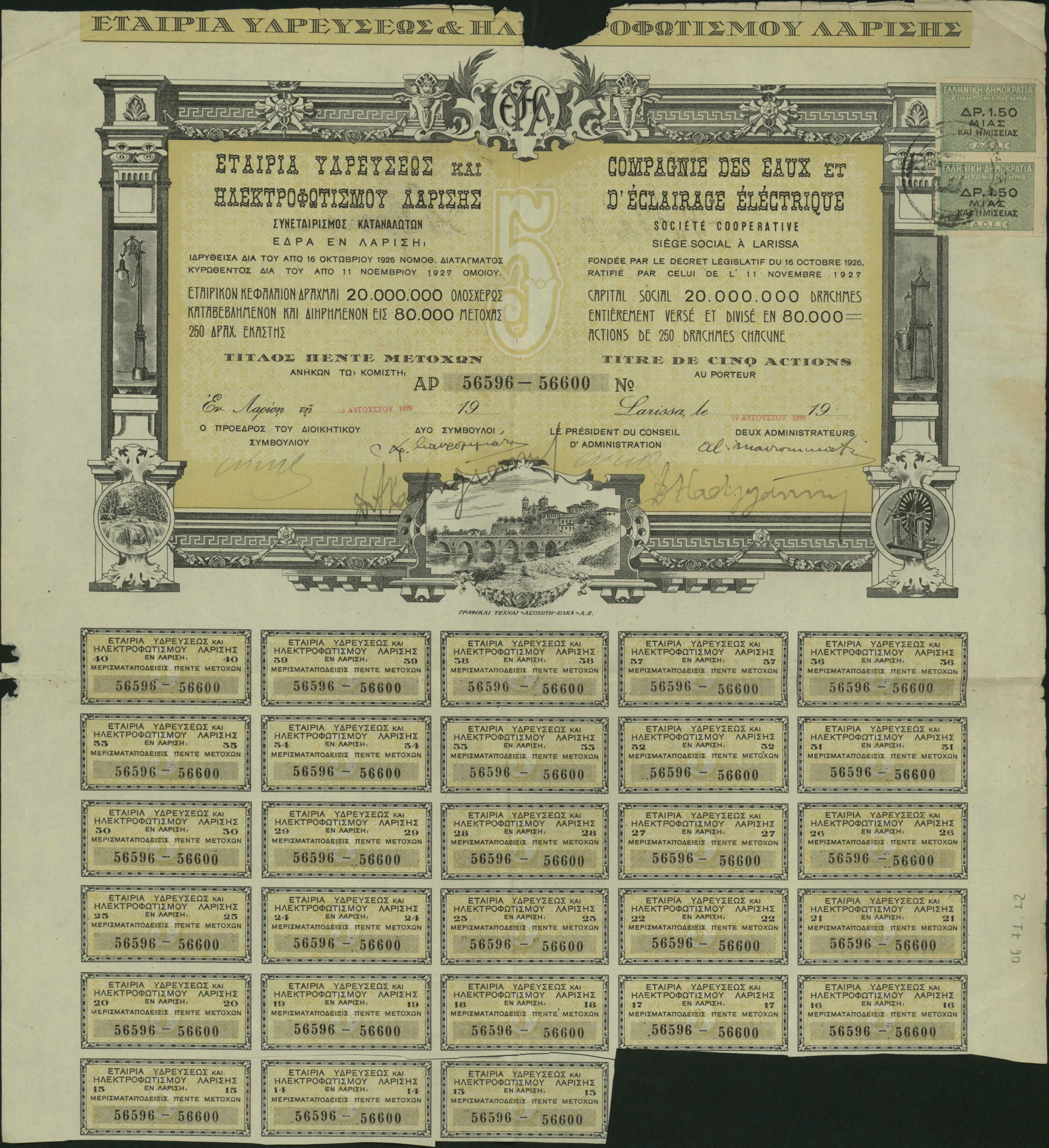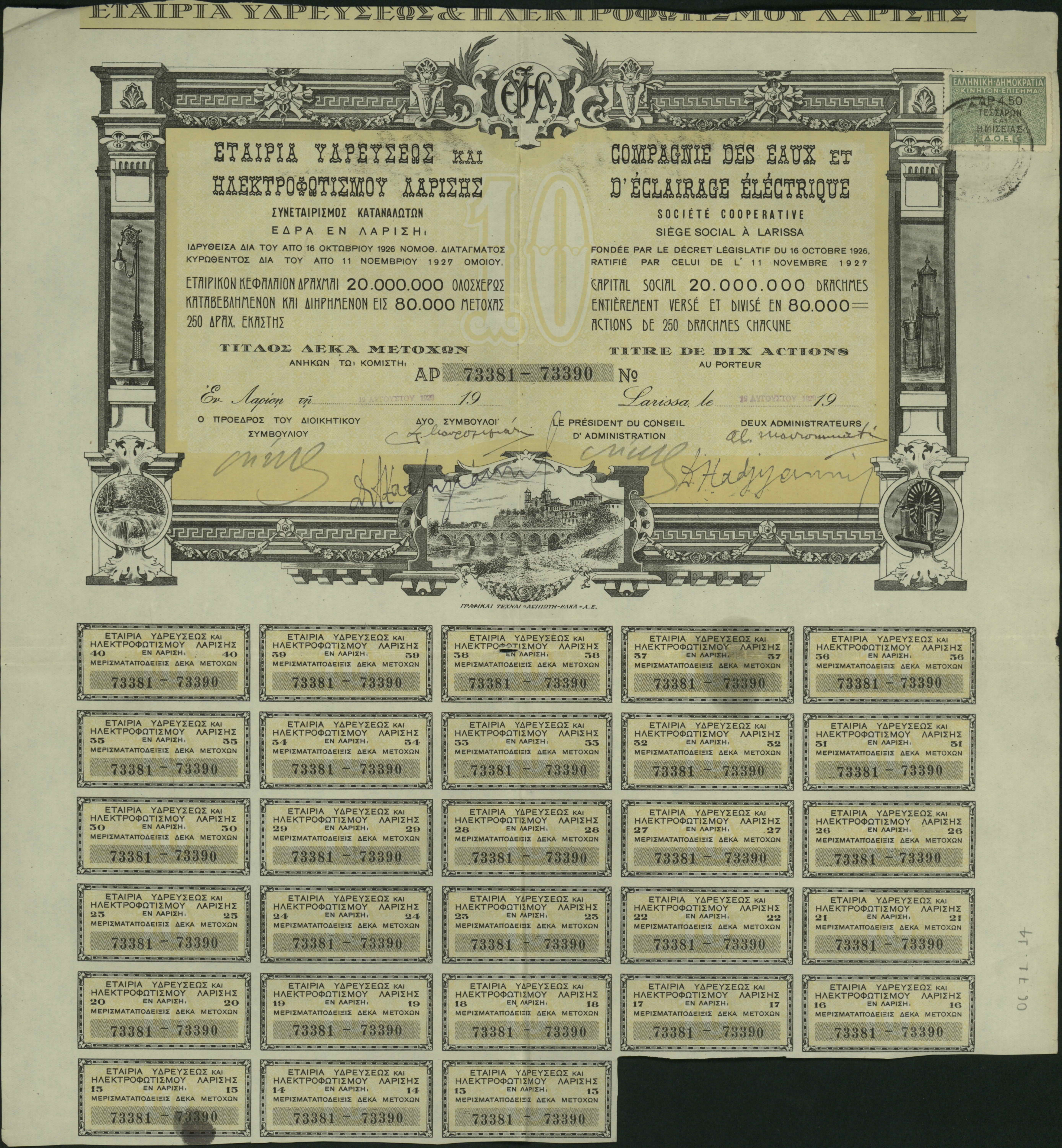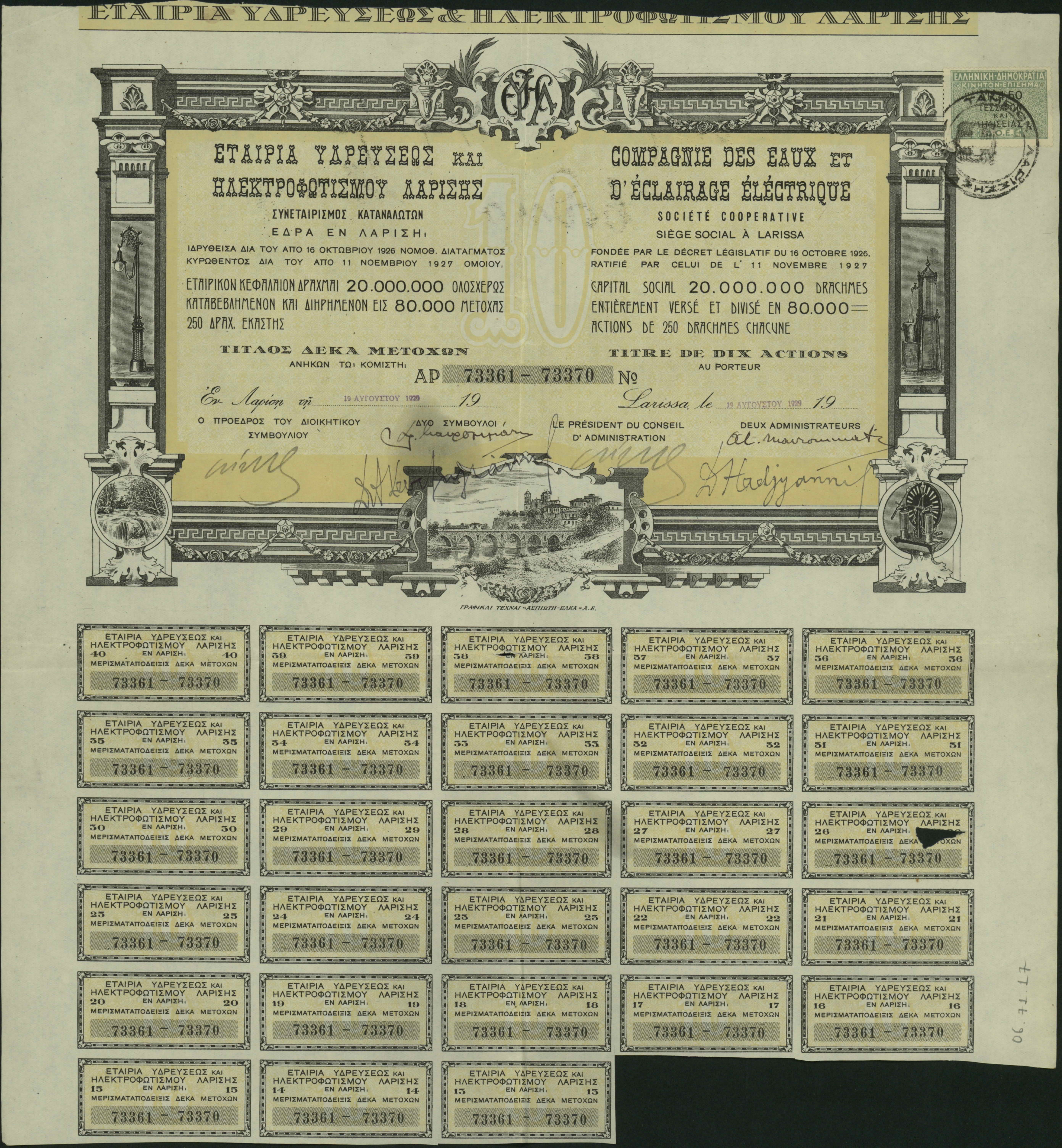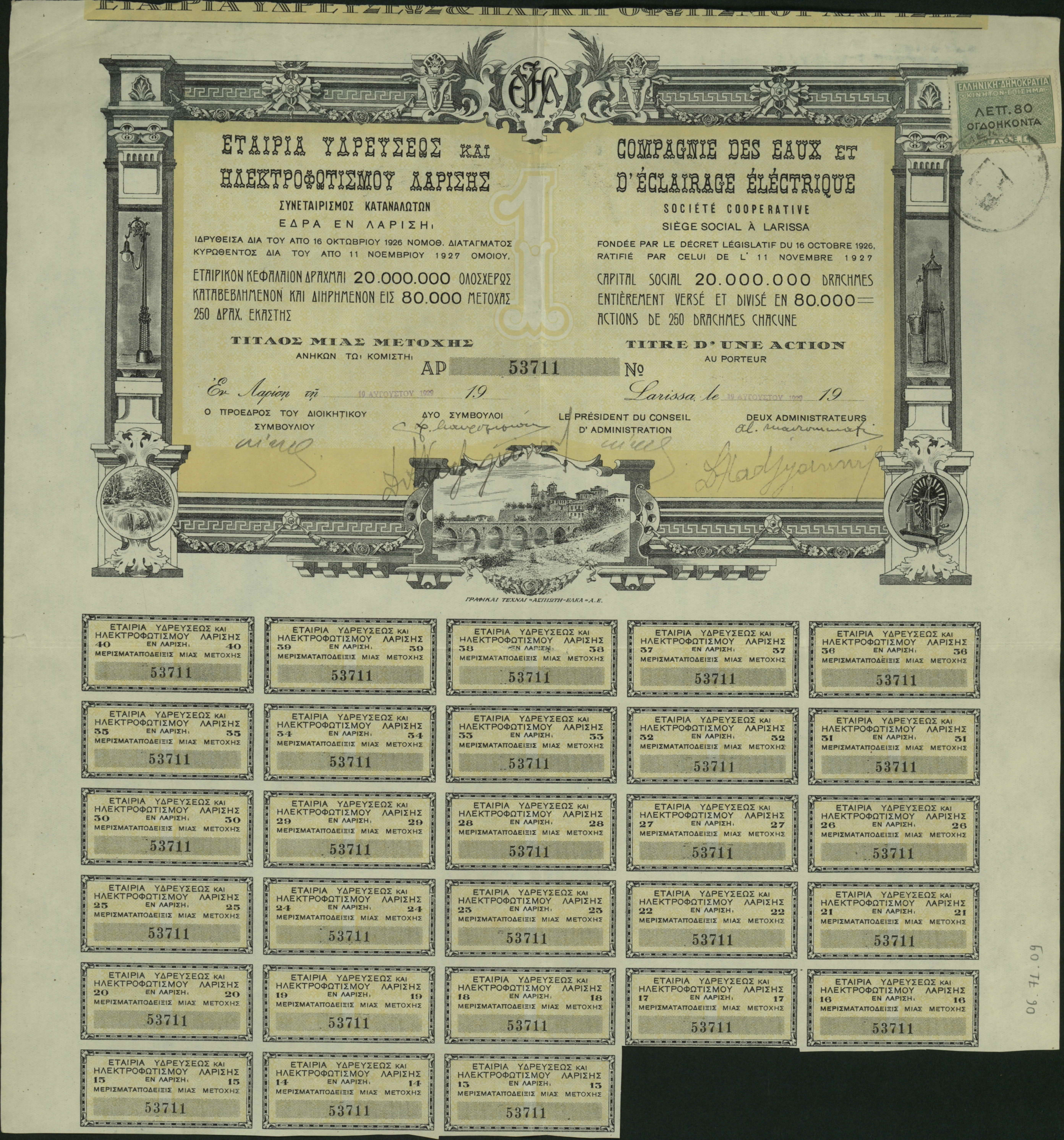 Stock certificates and a share, issued by the Company for Electric Power and Water Supply in Larissa, with coupons.