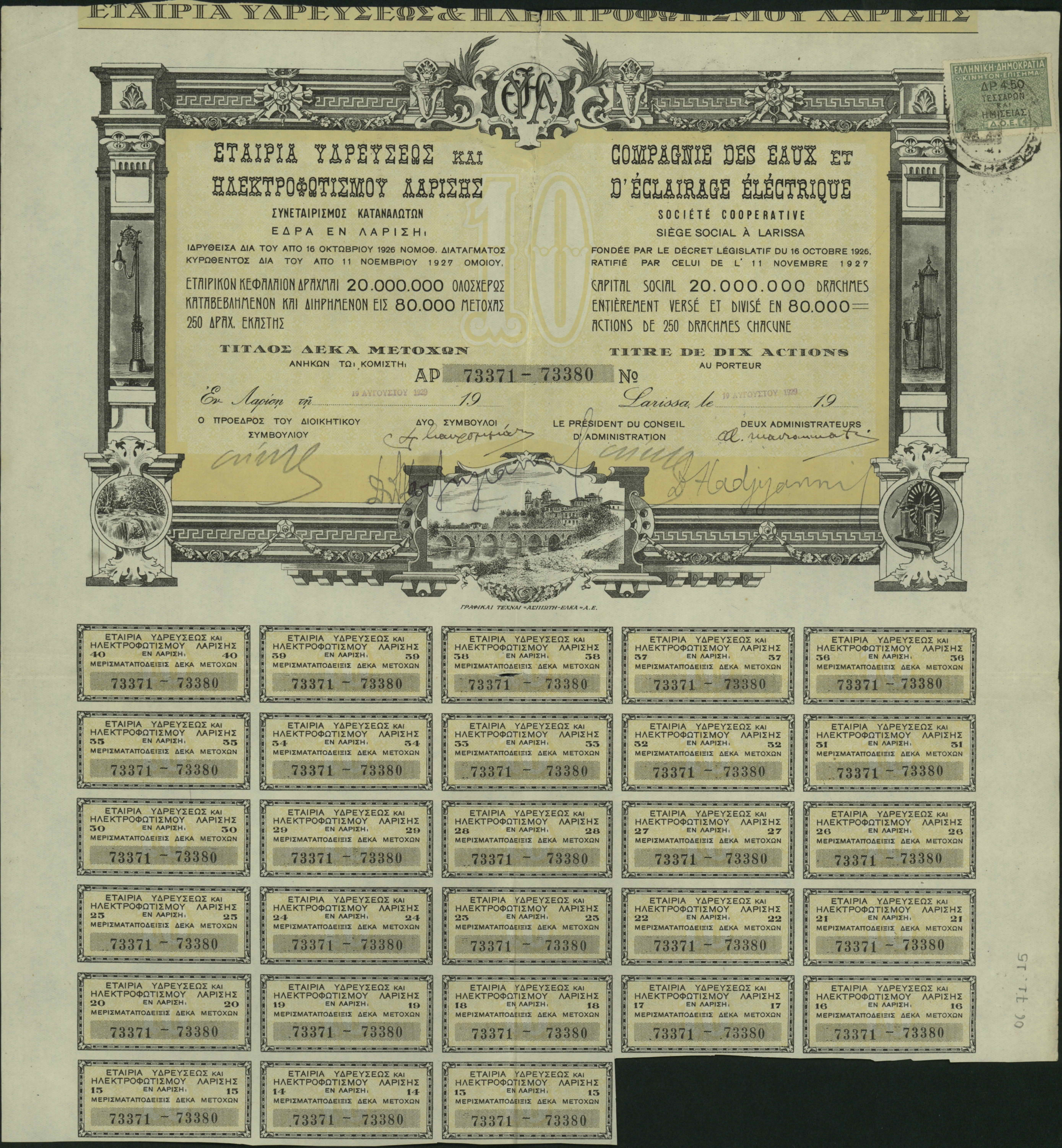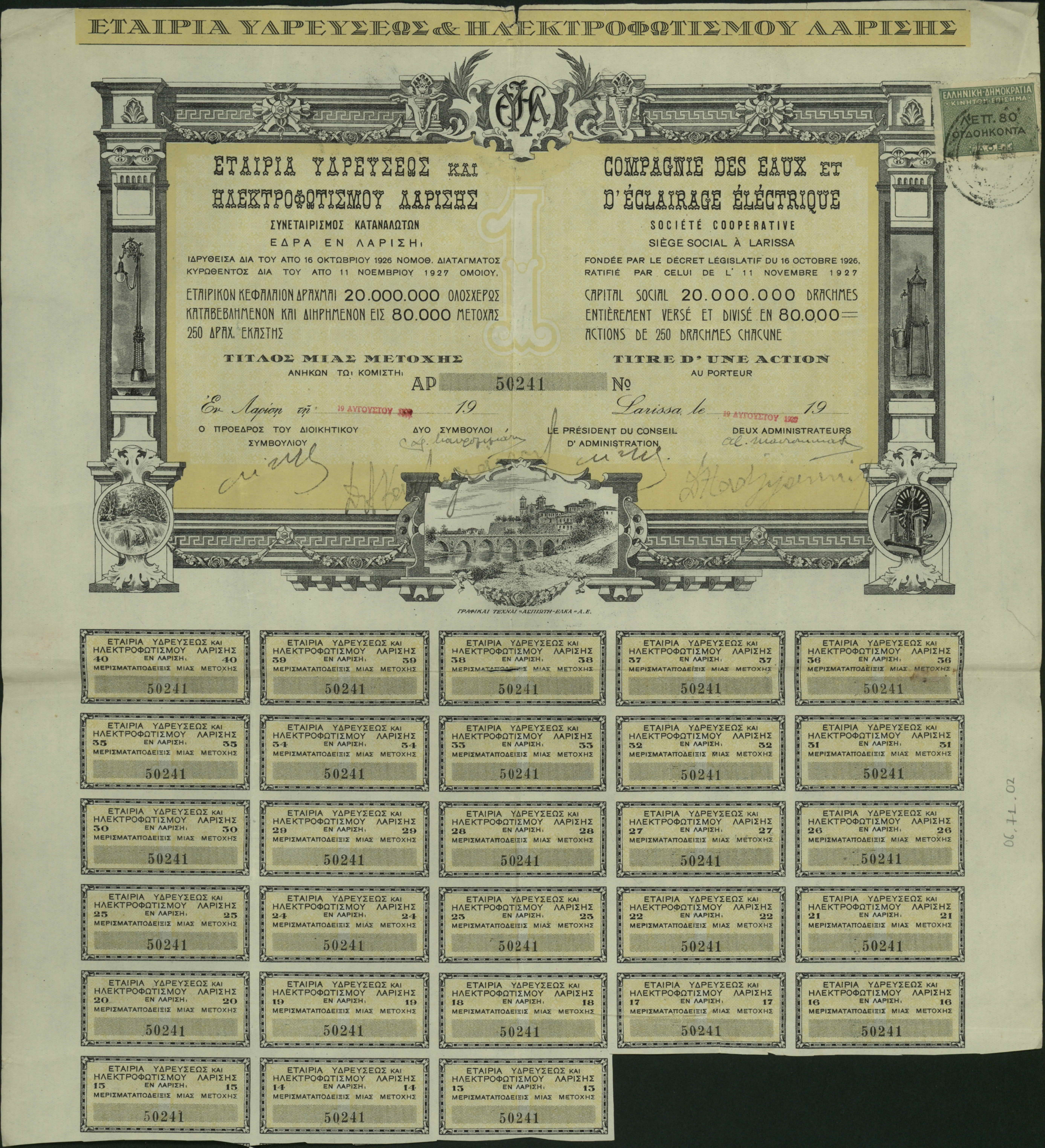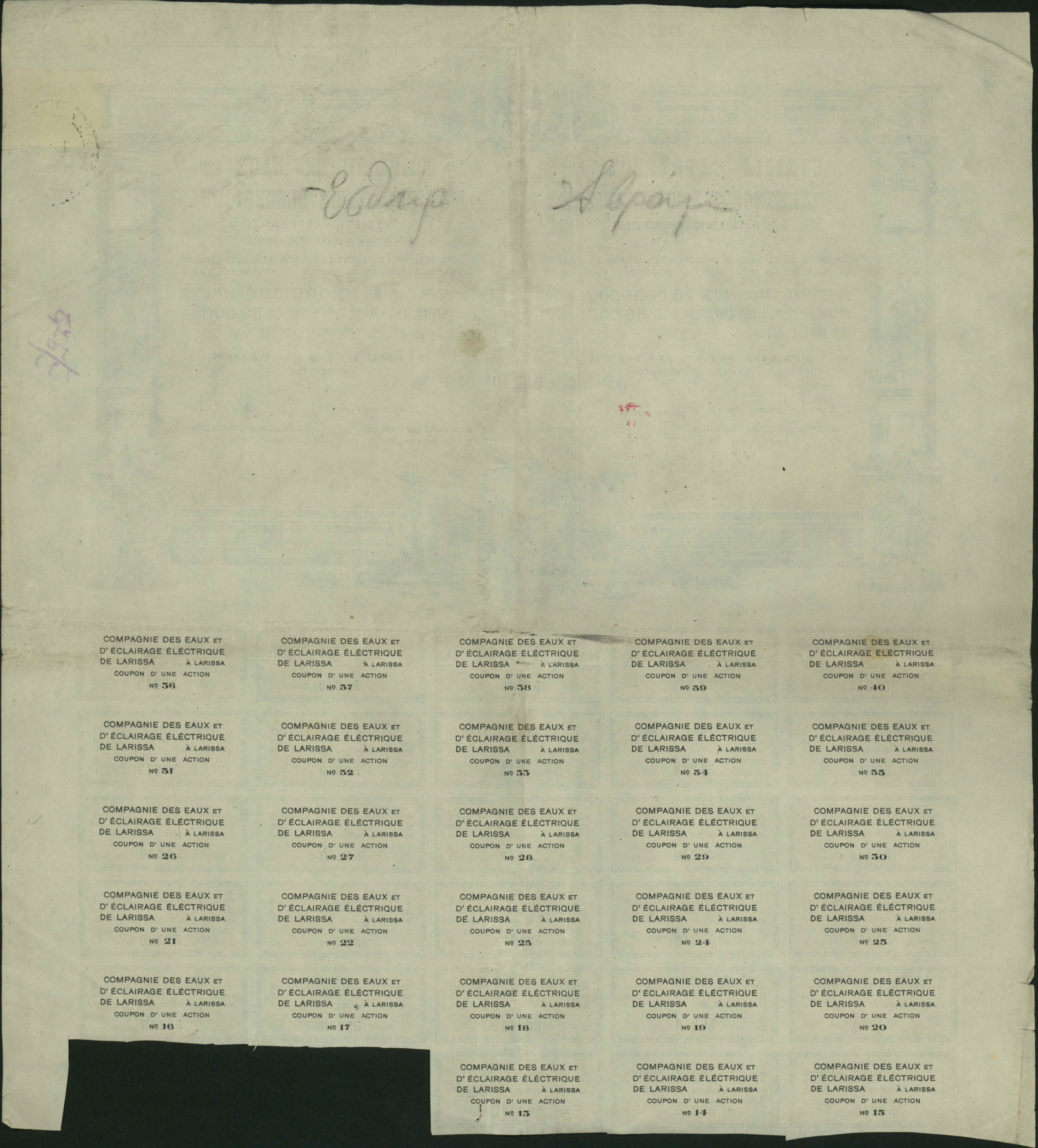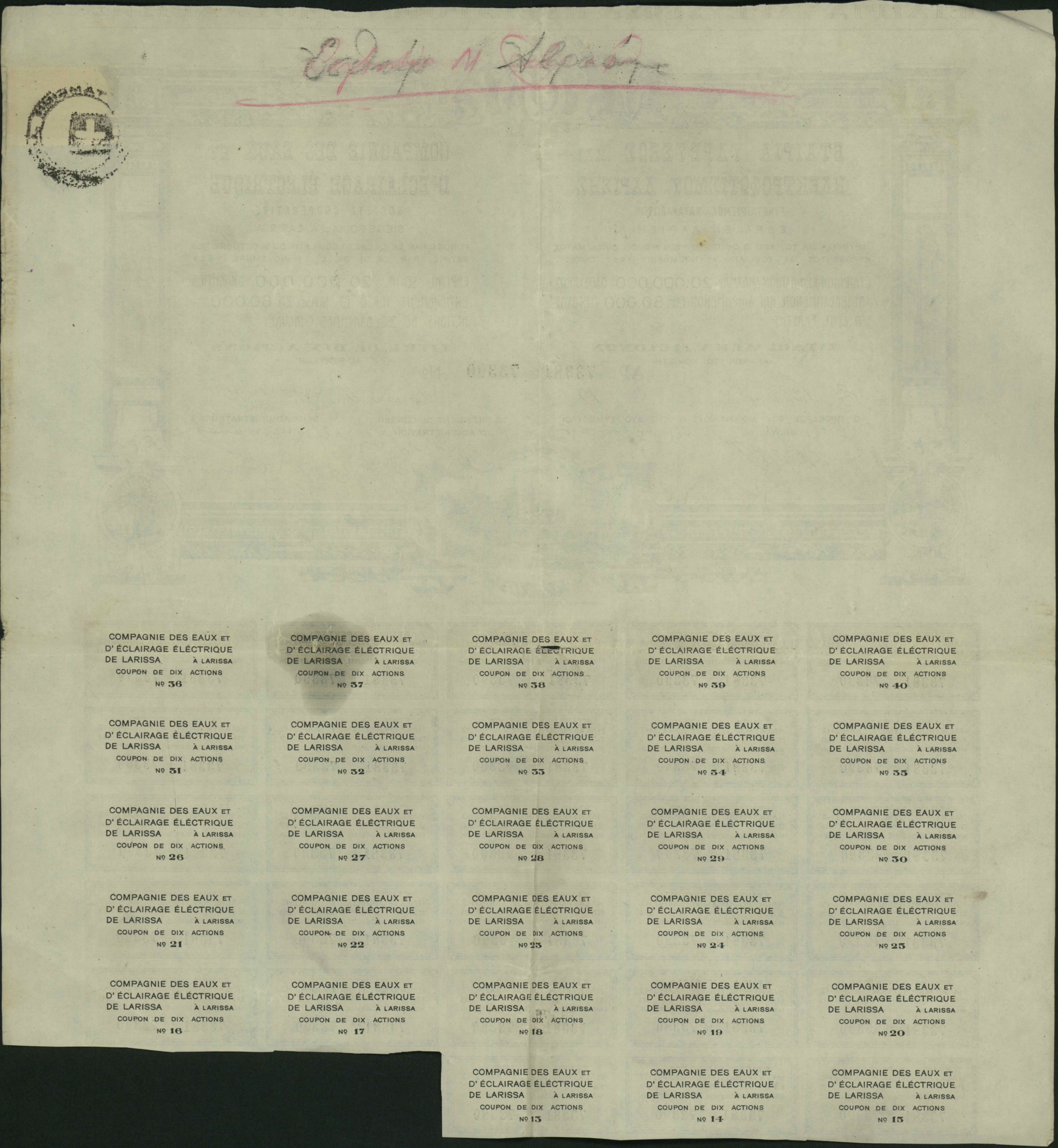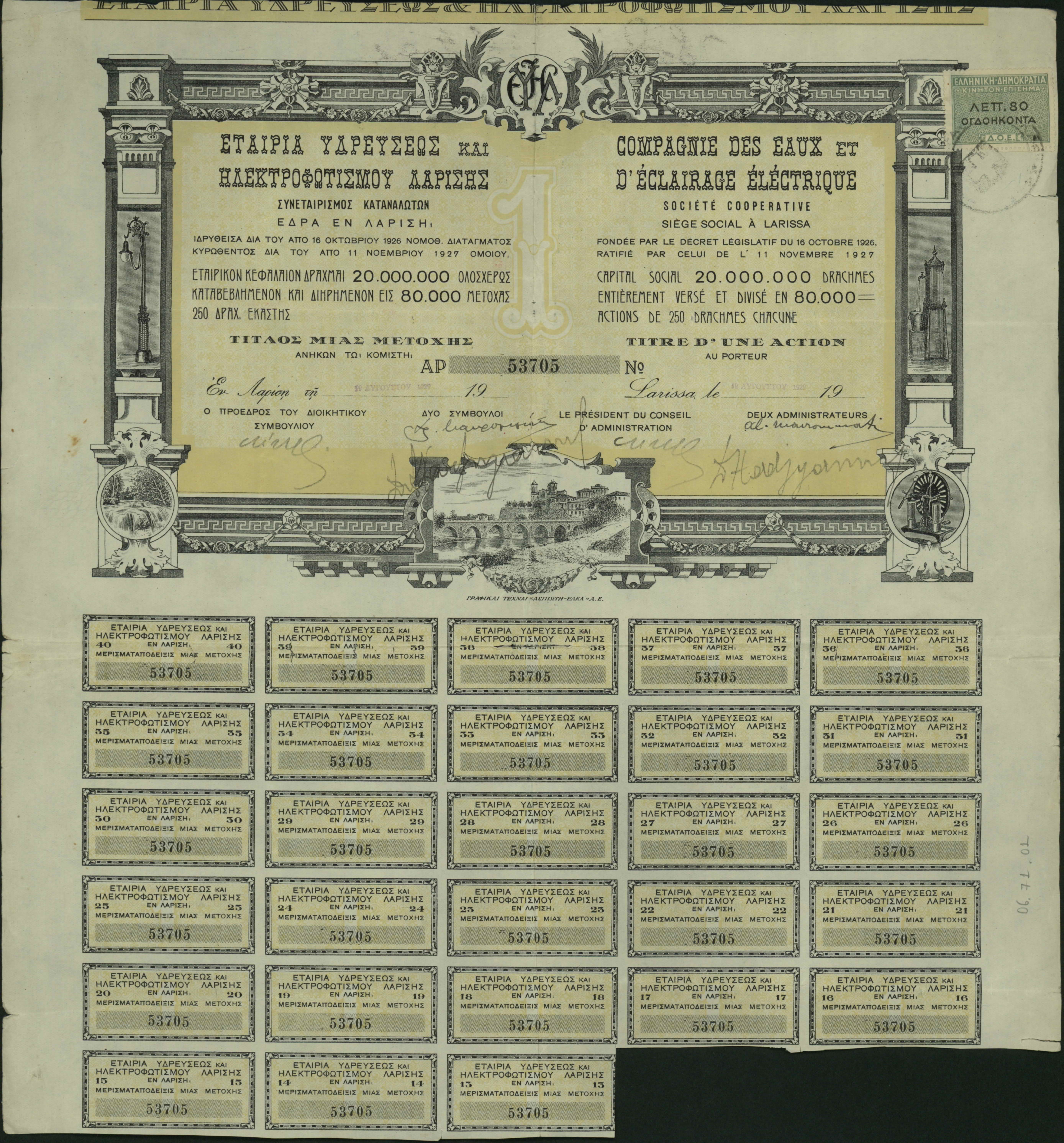 Stock certificates and a share, issued by the Company for Electric Power and Water Supply in Larissa, with coupons.
