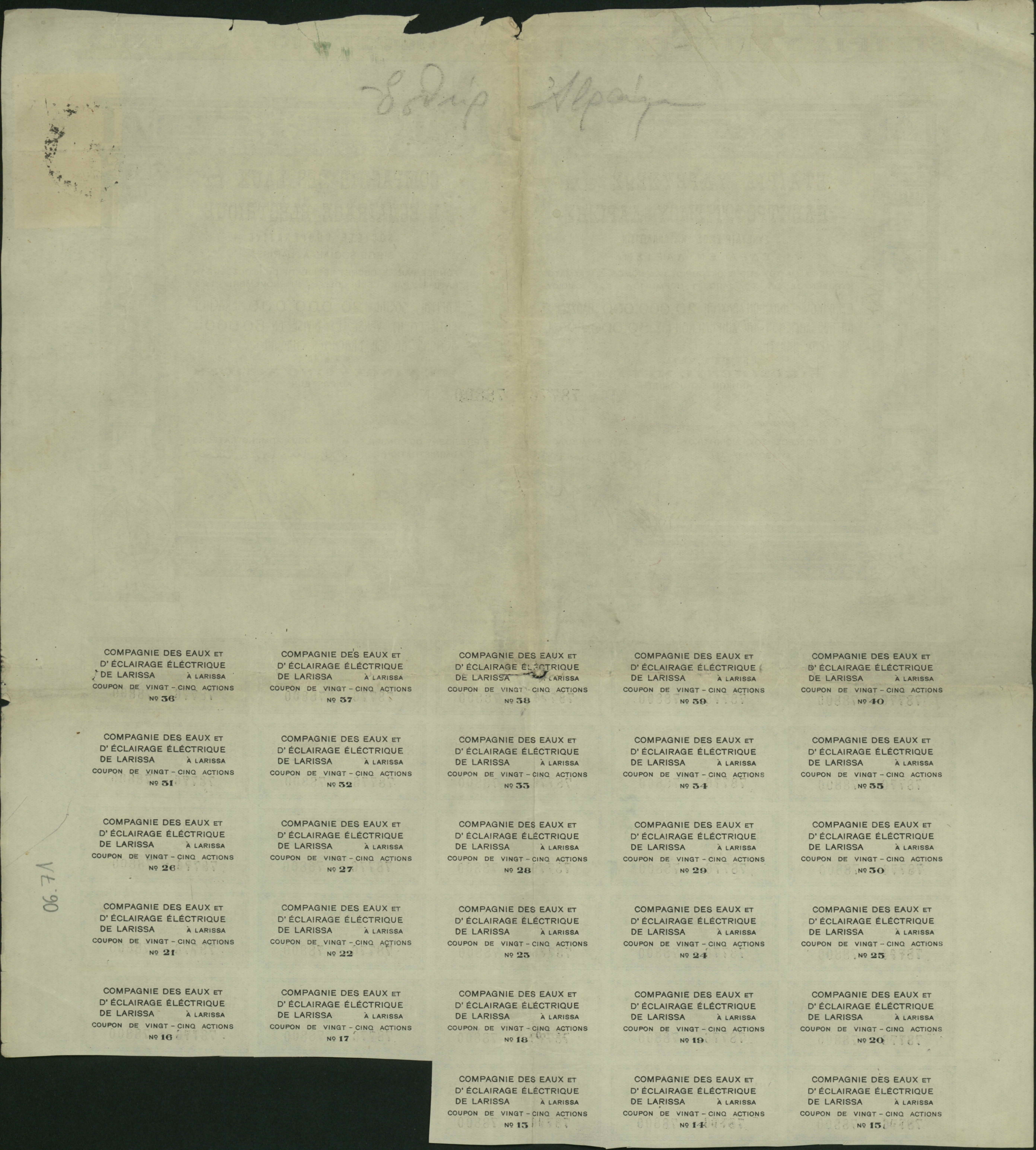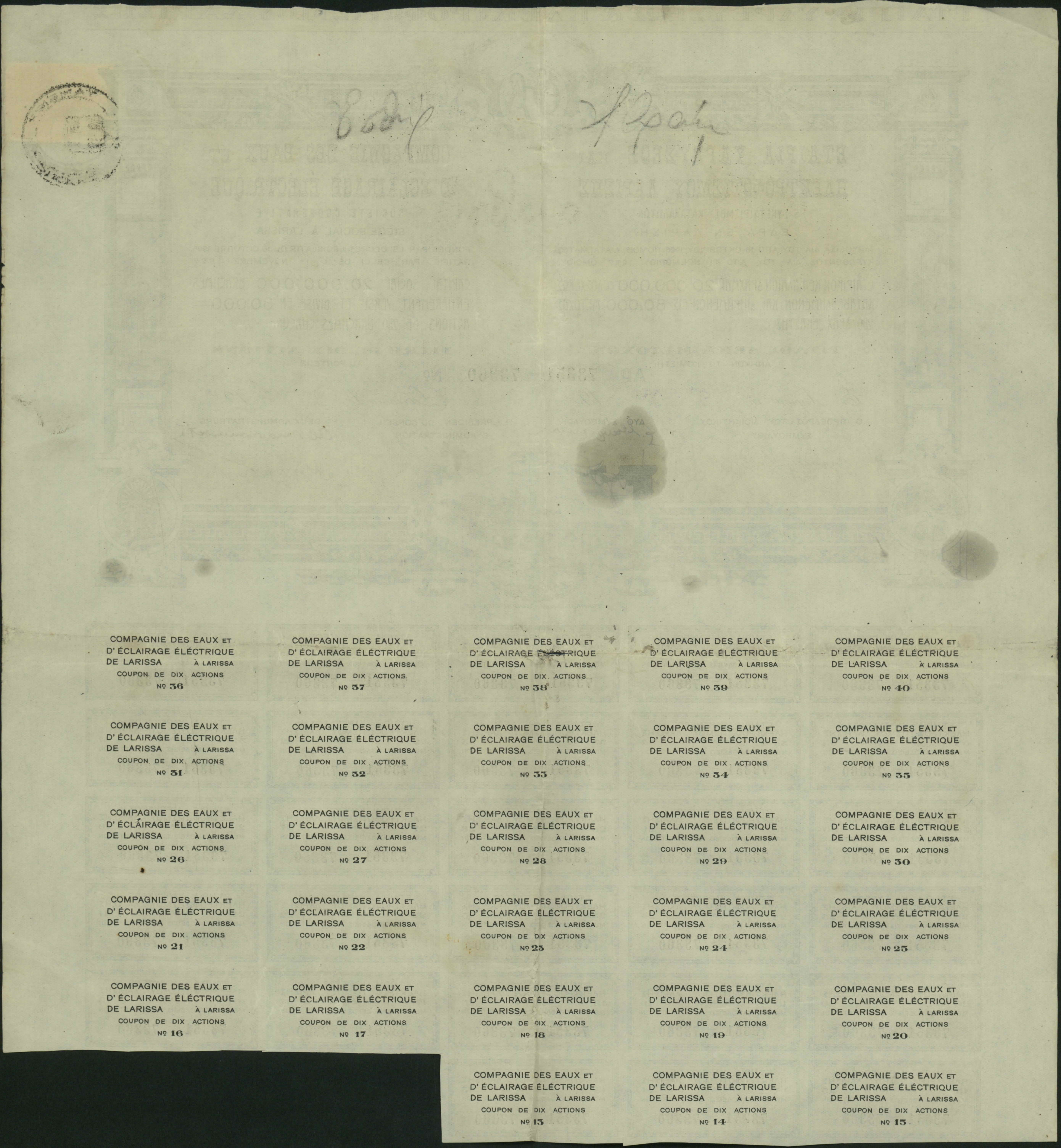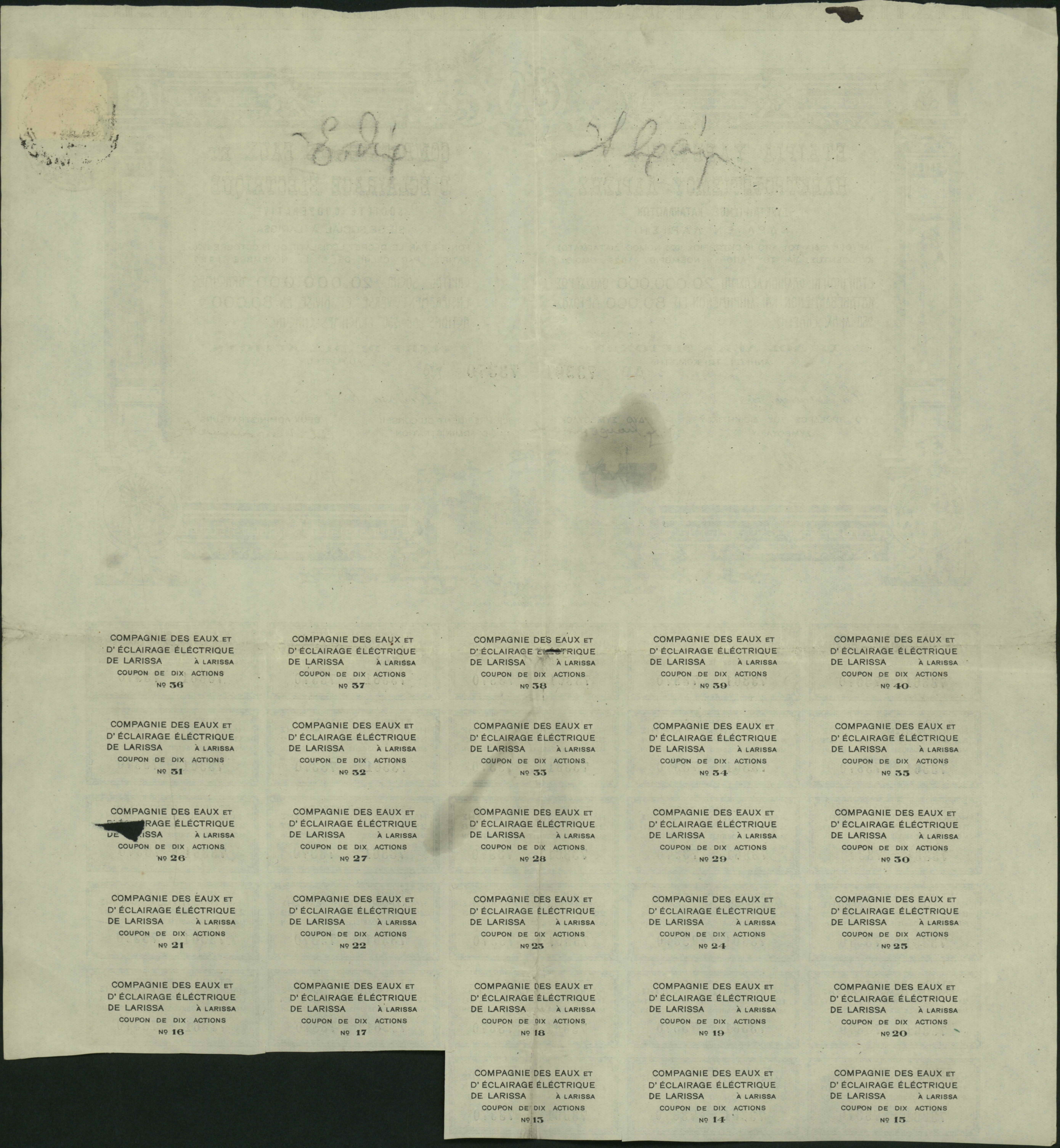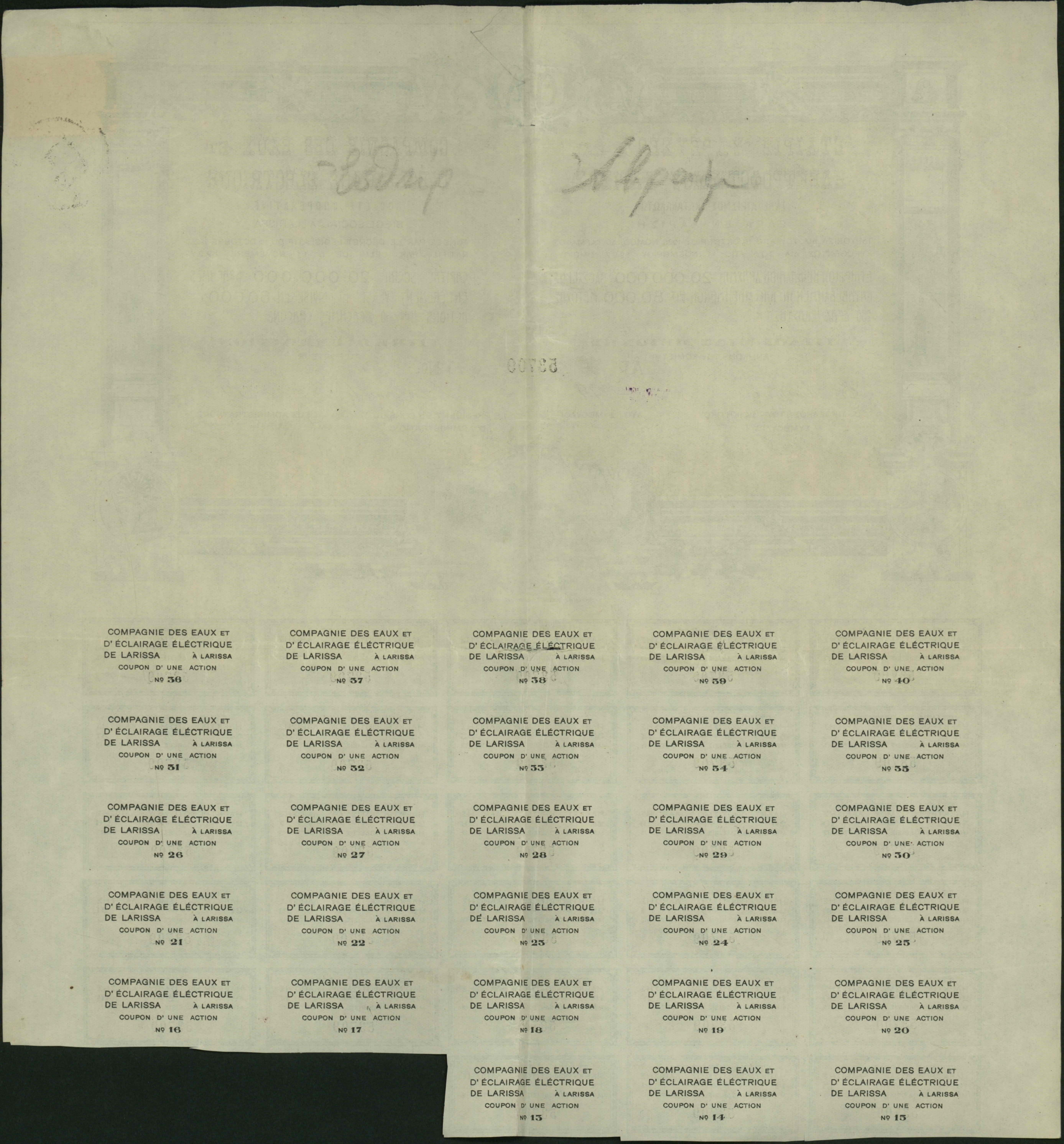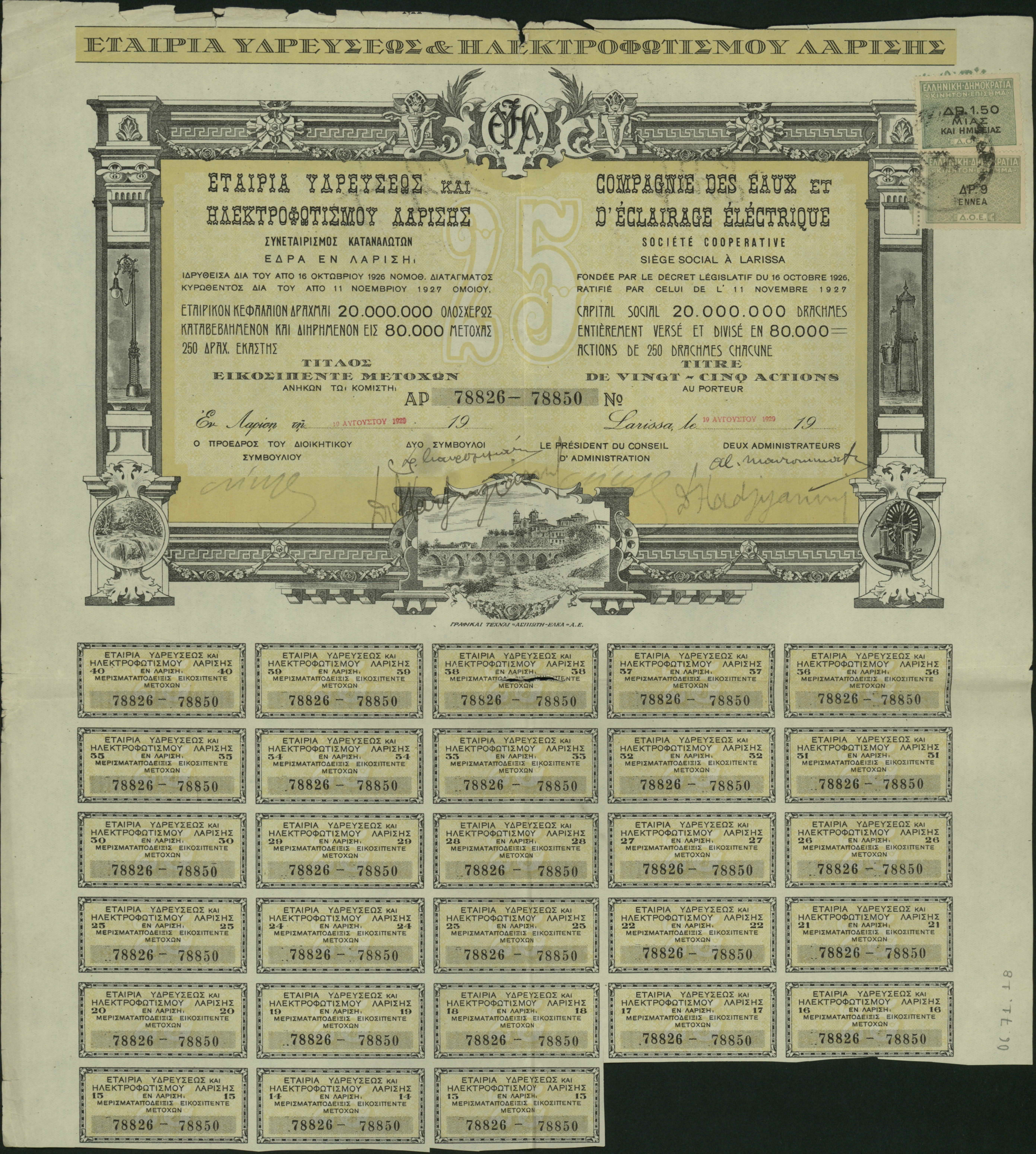 Stock certificates and a share, issued by the Company for Electric Power and Water Supply in Larissa, with coupons.