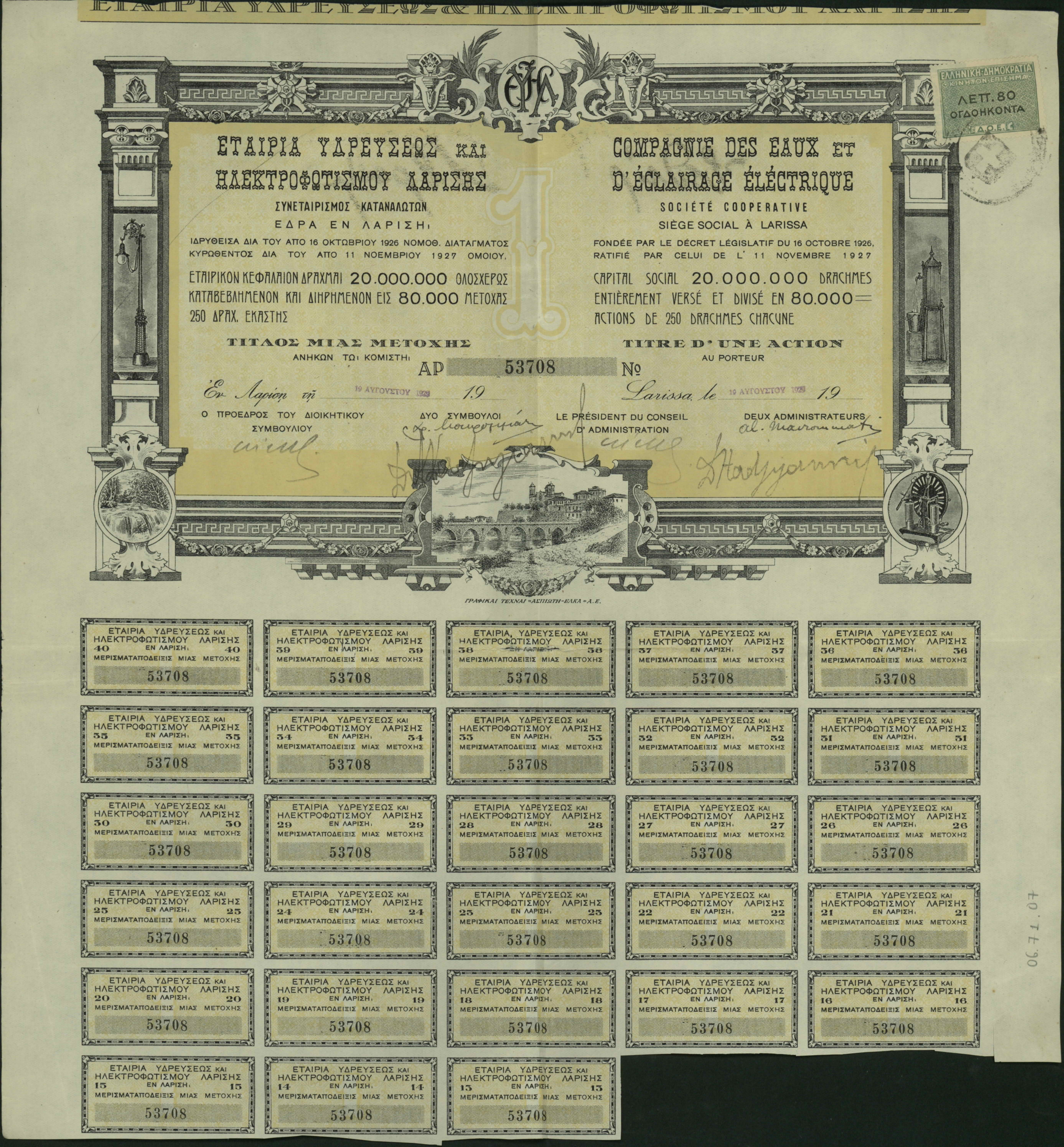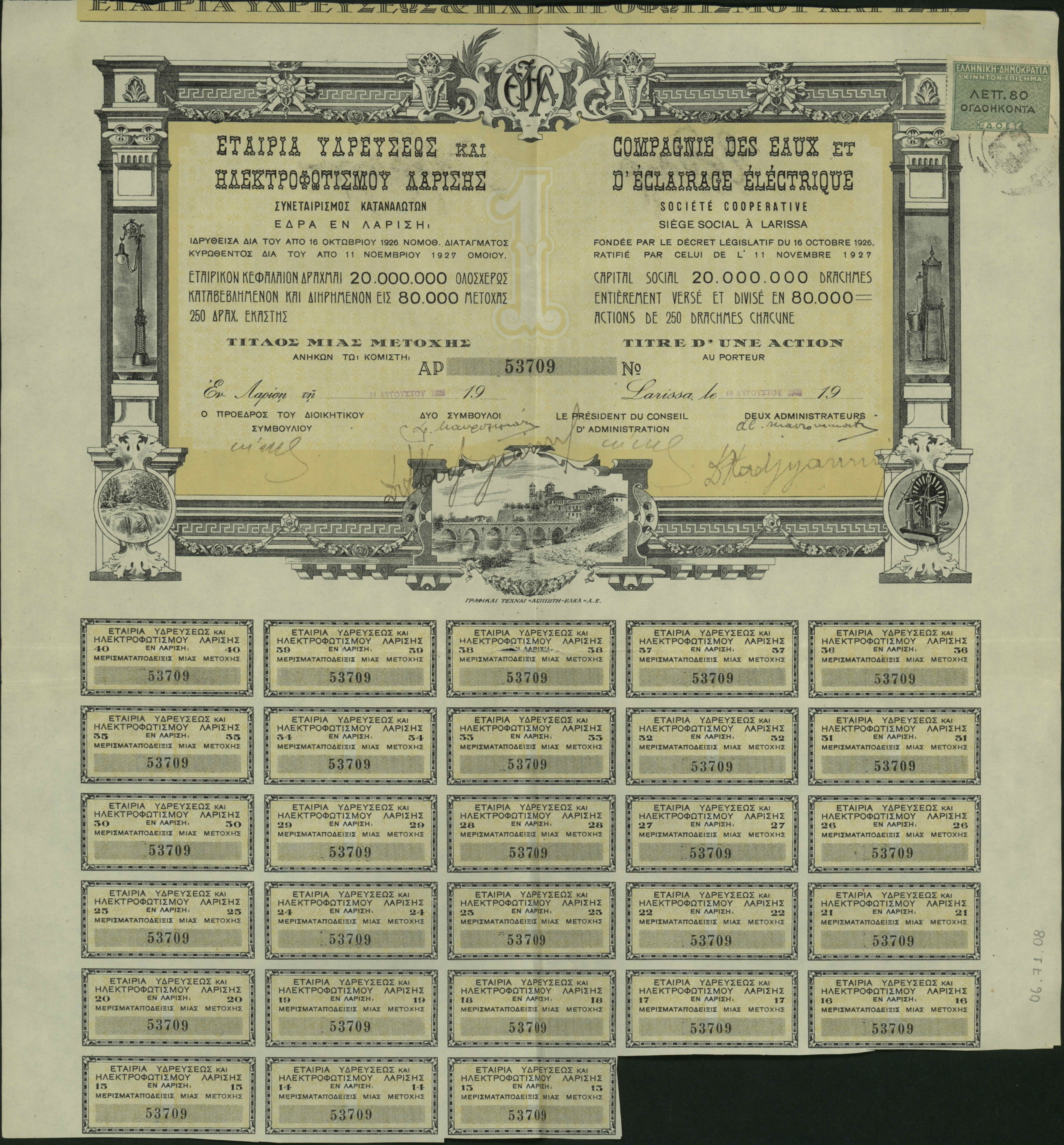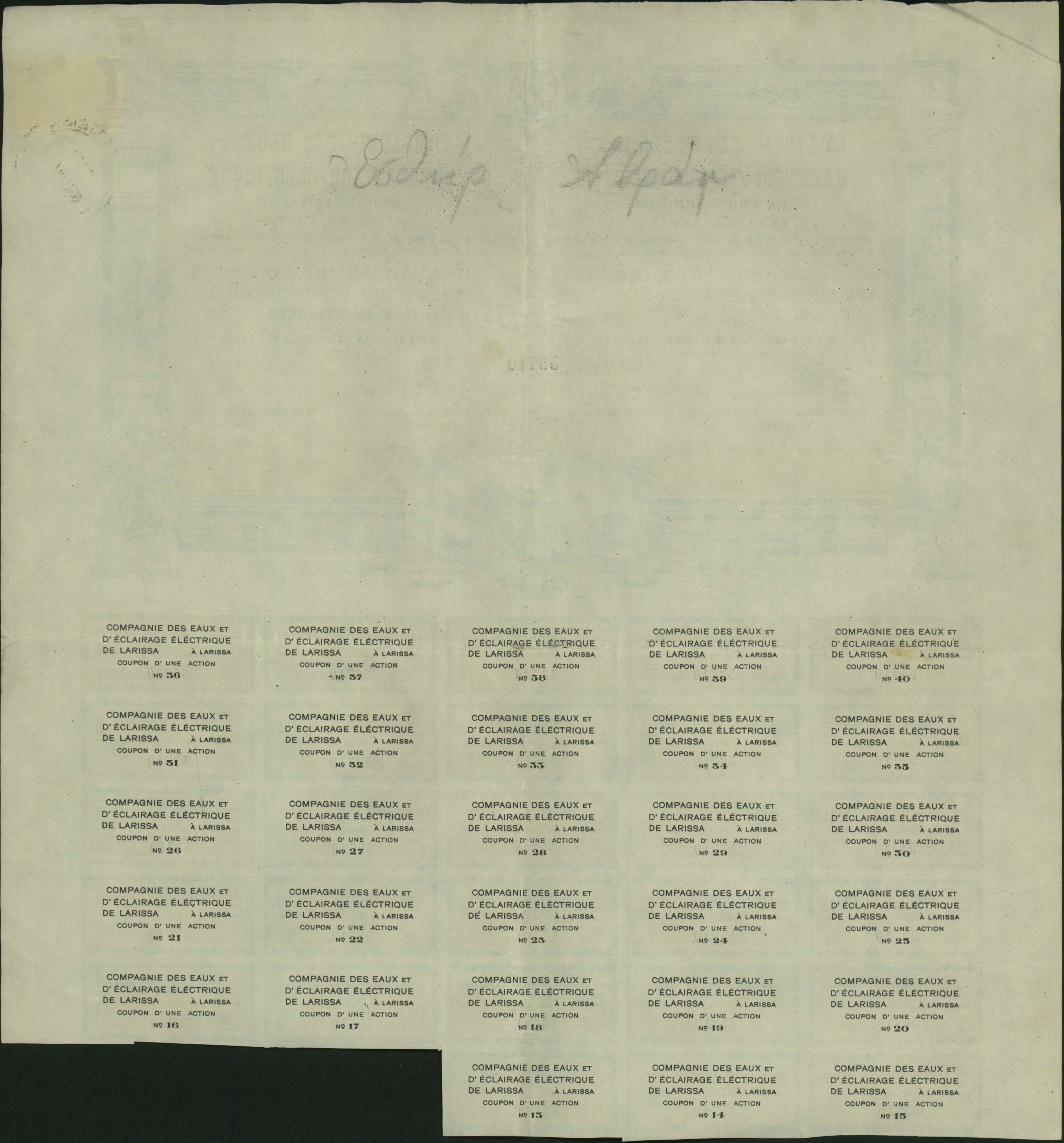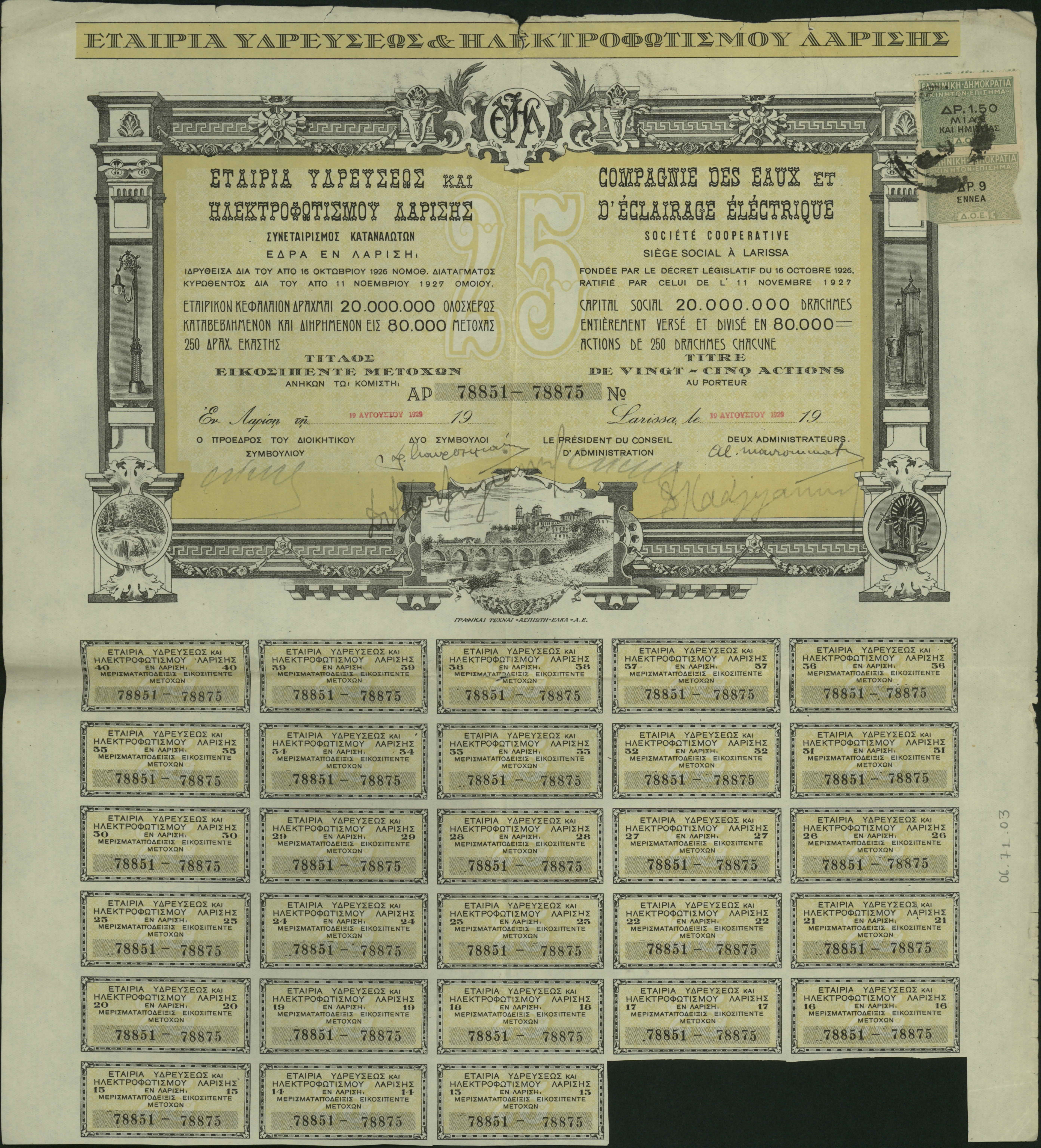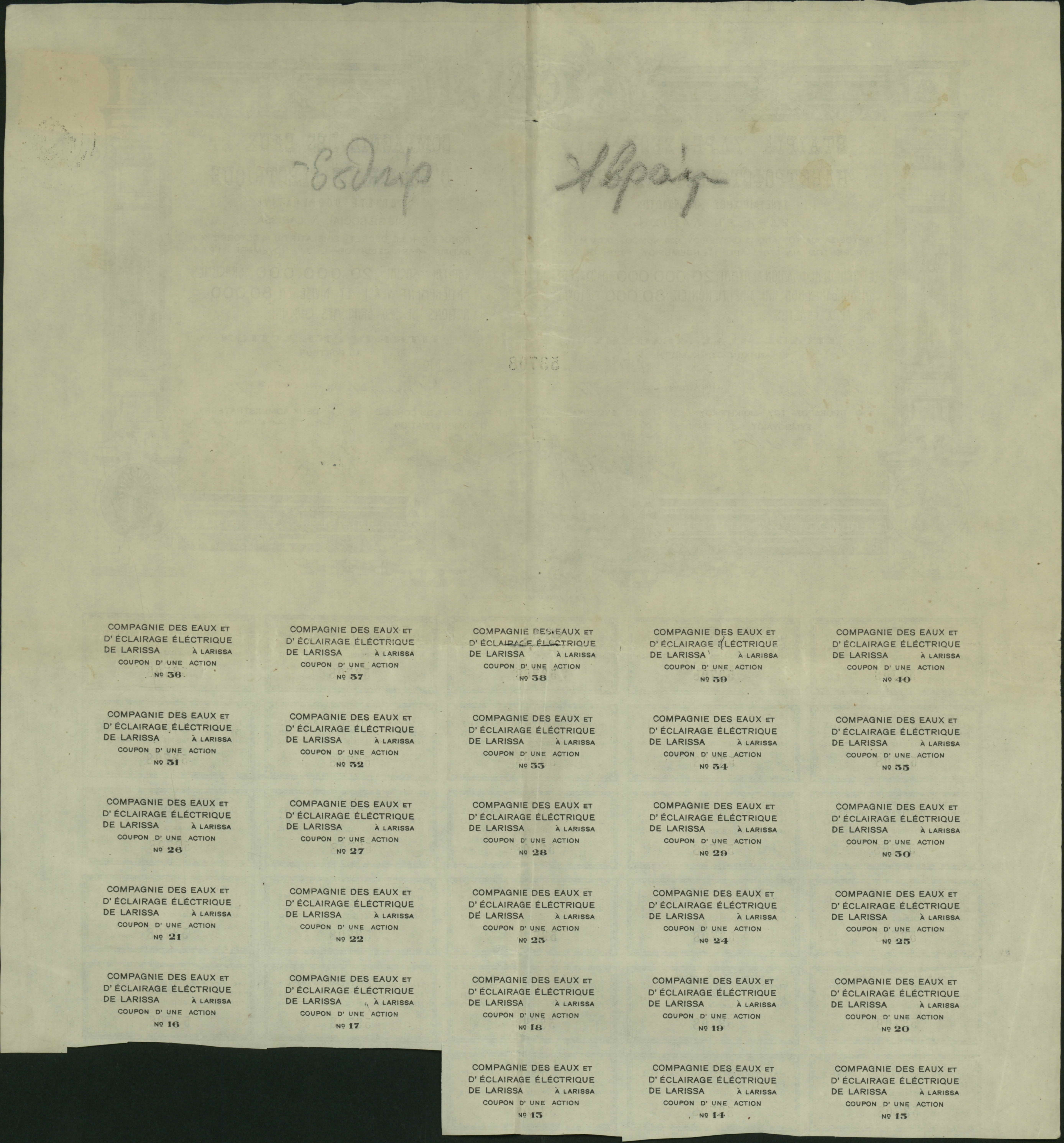 Stock certificates and a share, issued by the Company for Electric Power and Water Supply in Larissa, with coupons.