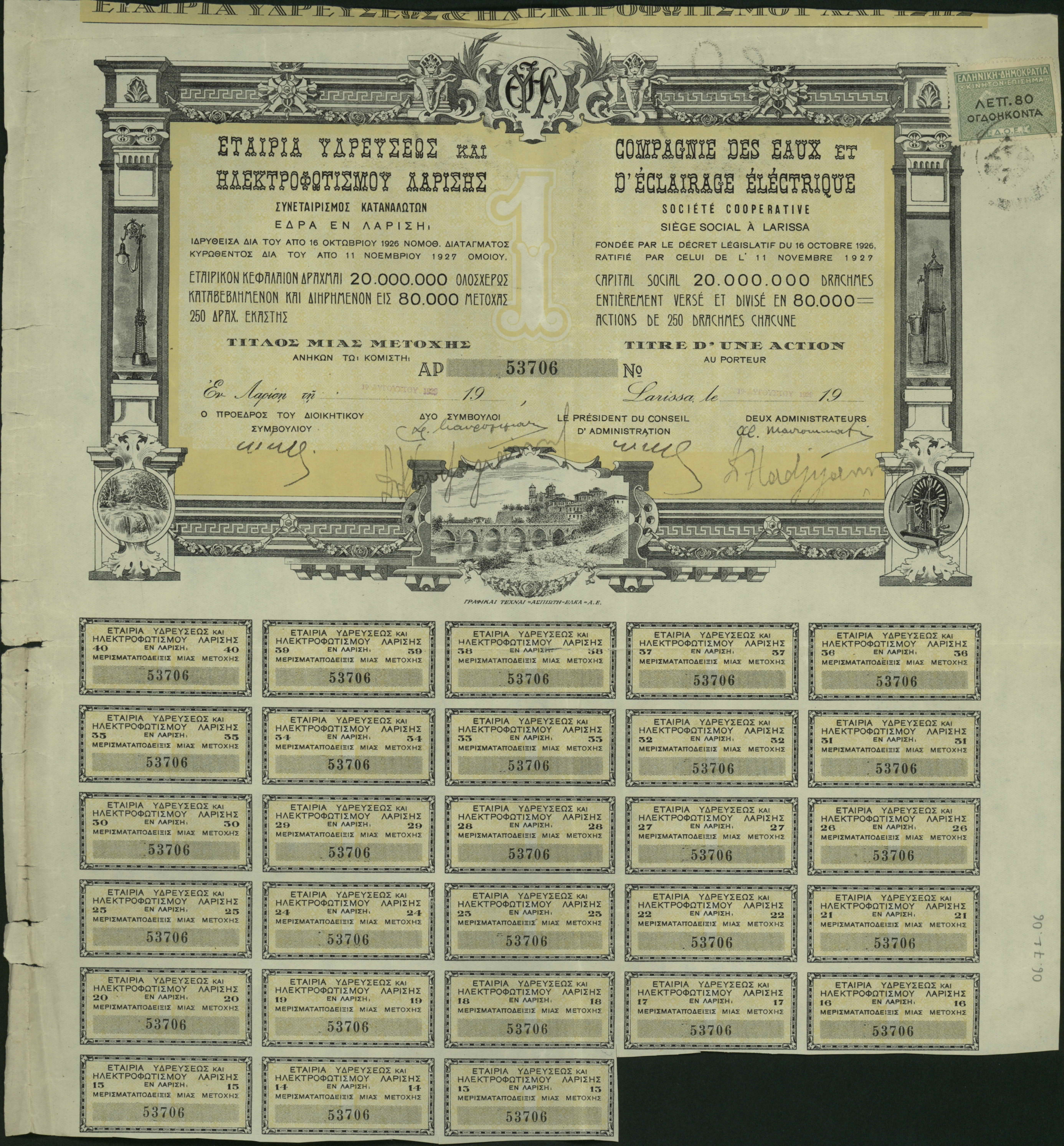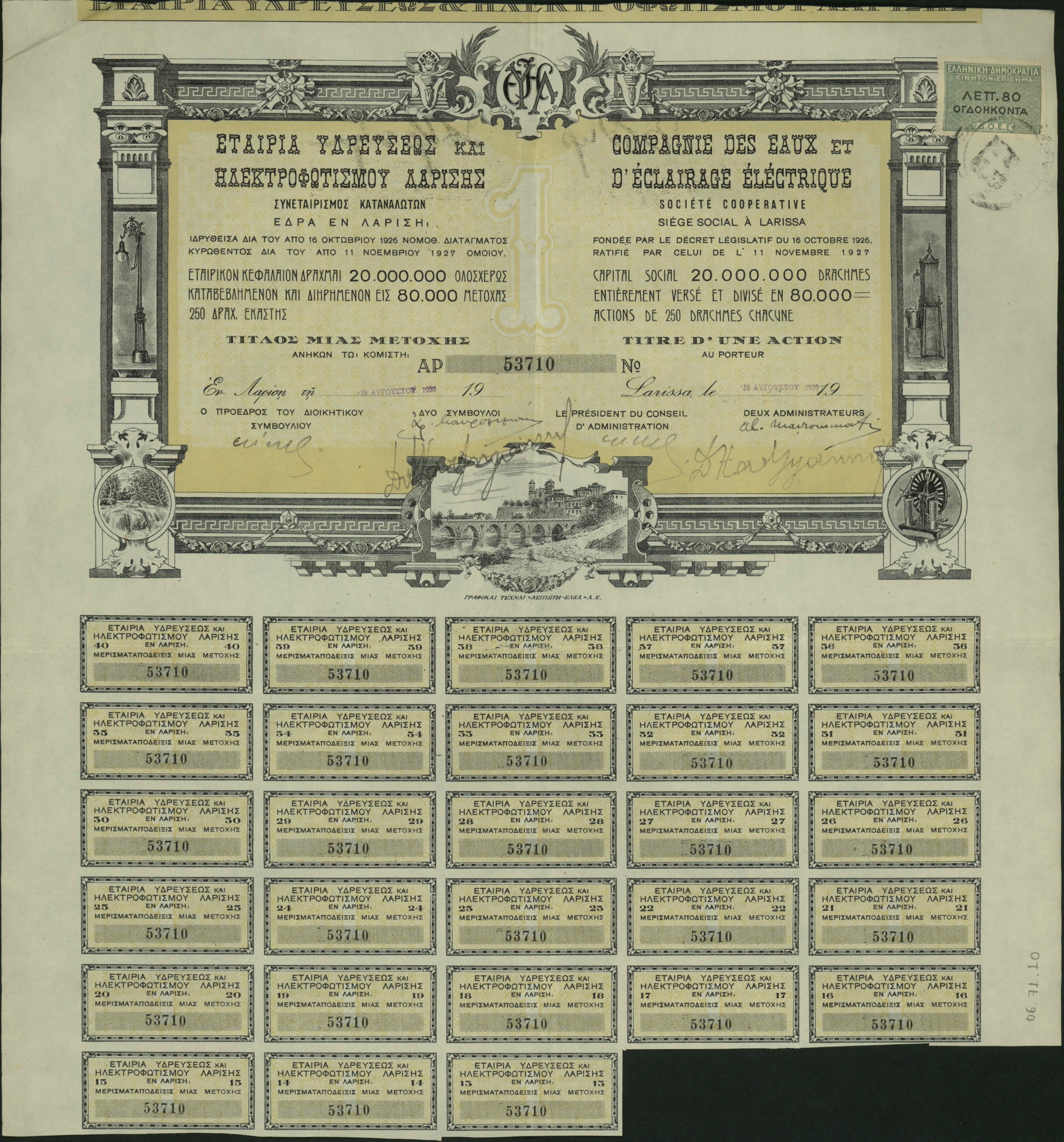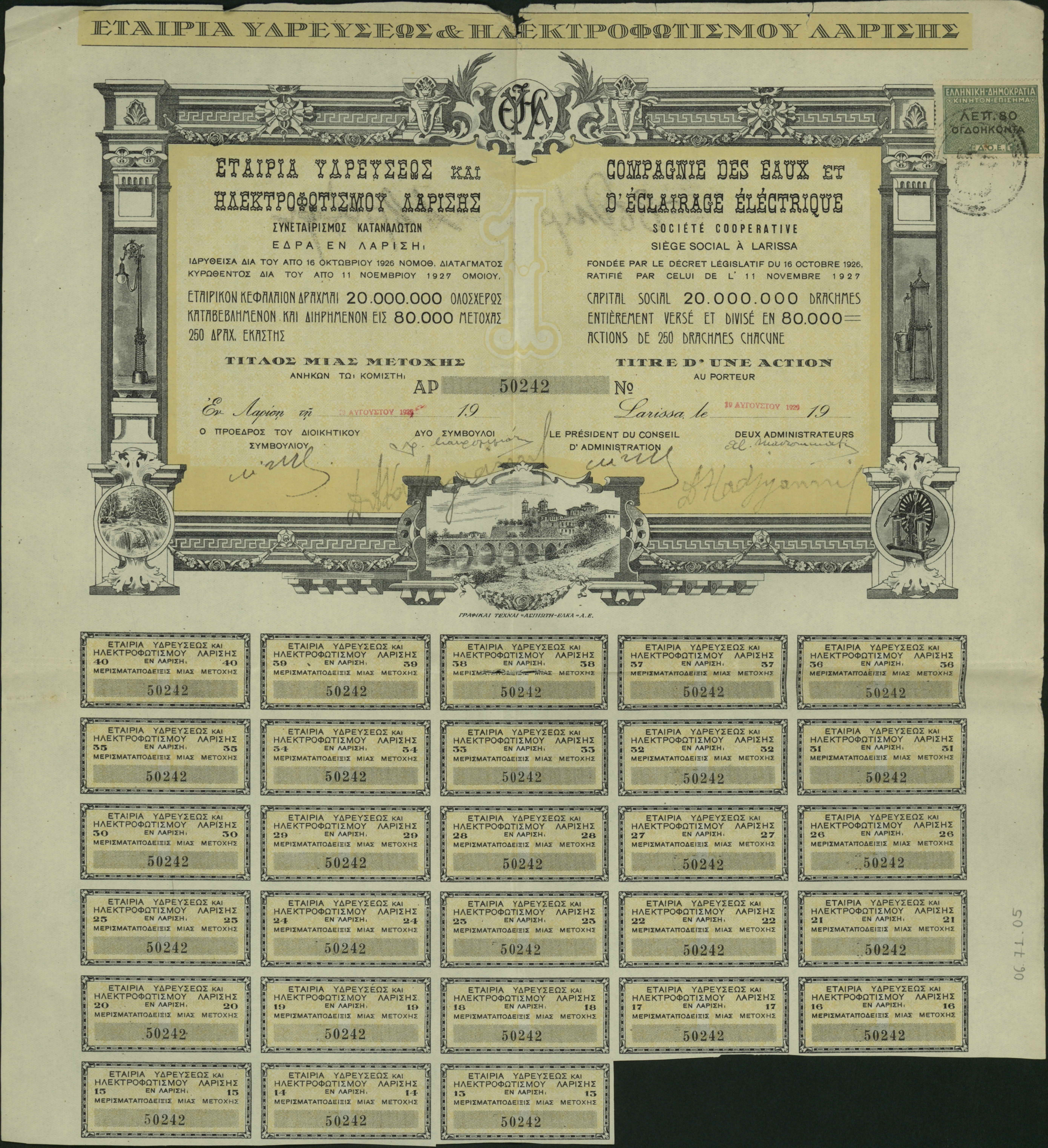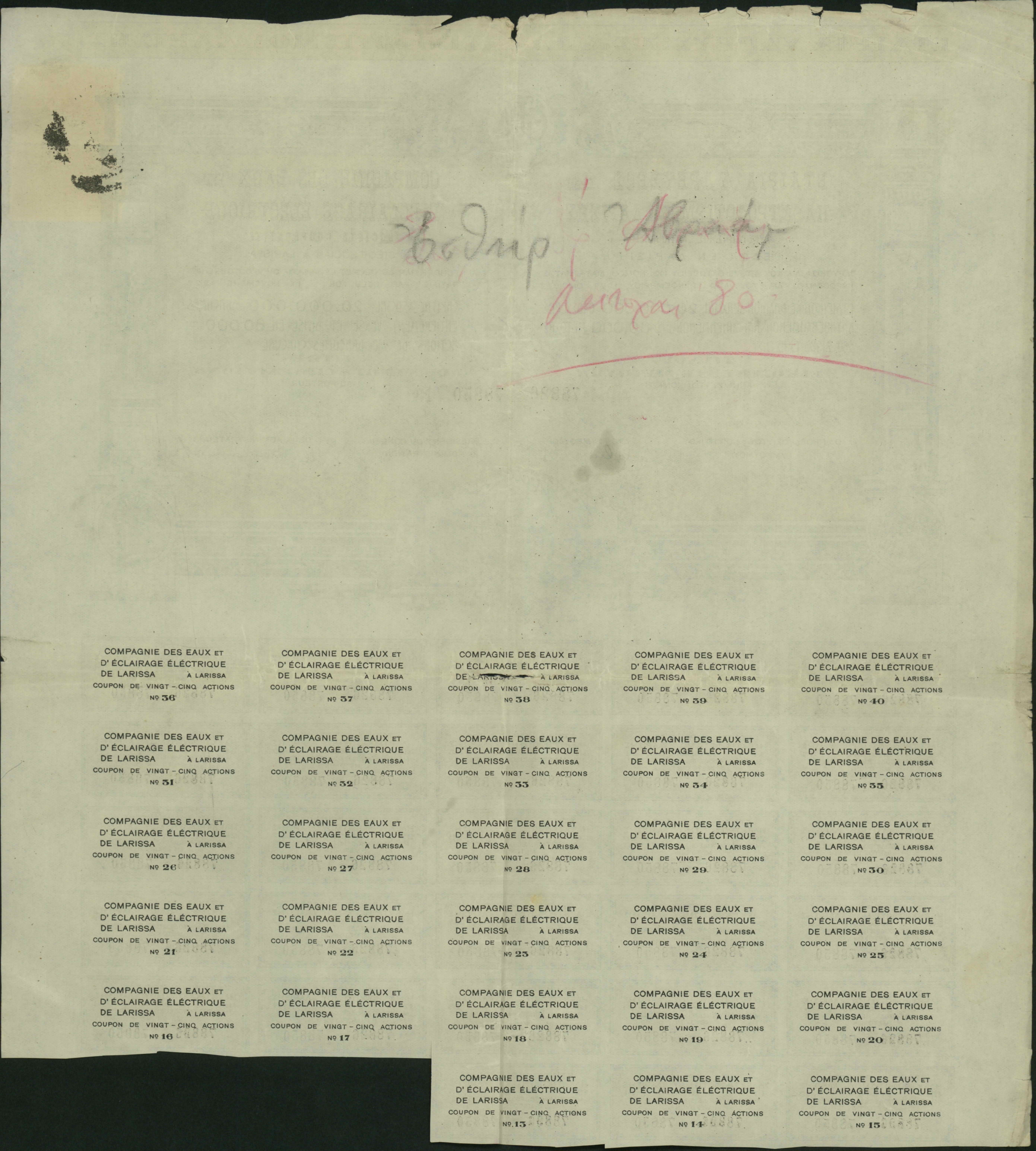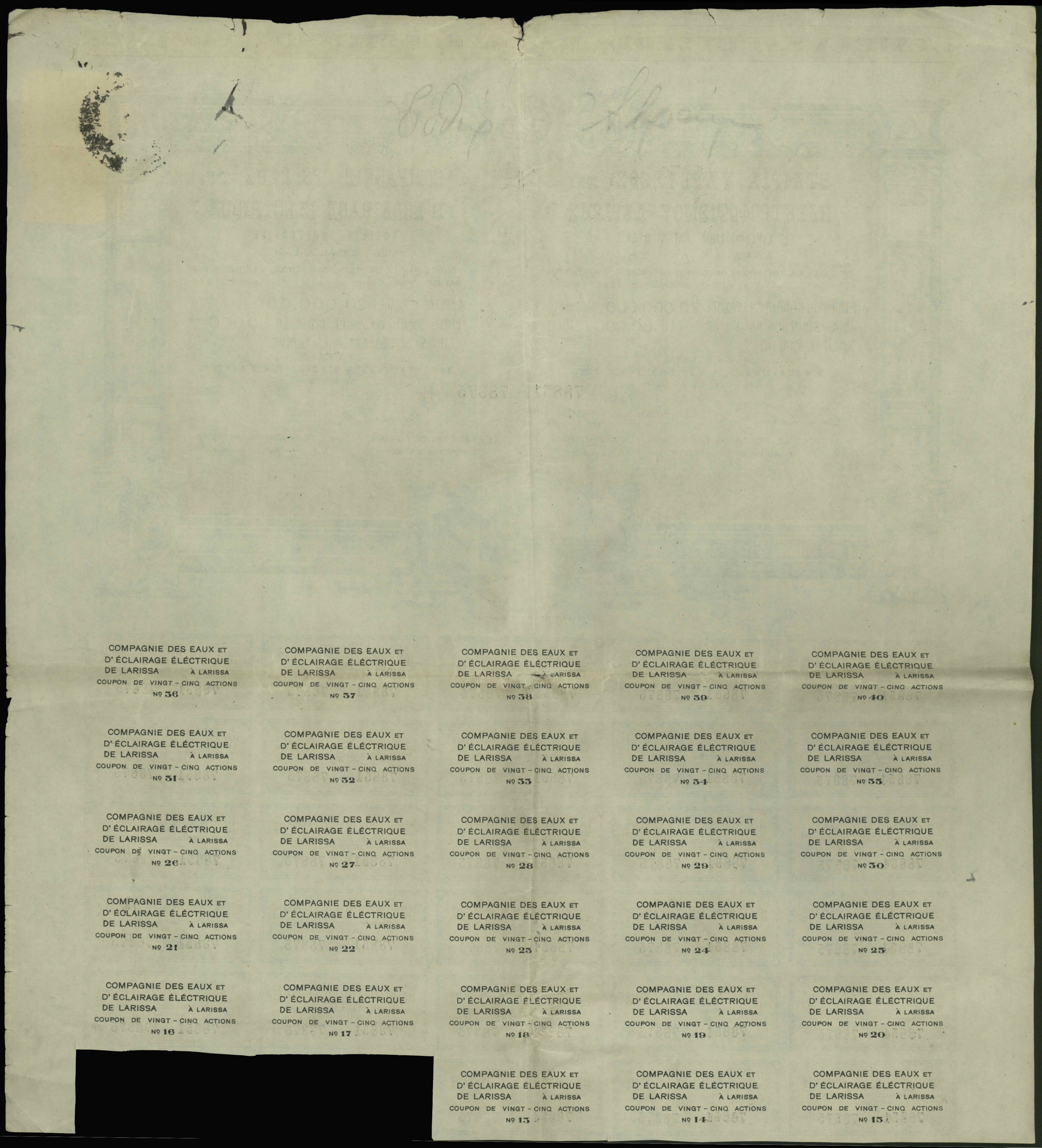Stock certificates and a share, issued by the Company for Electric Power and Water Supply in Larissa, with coupons.