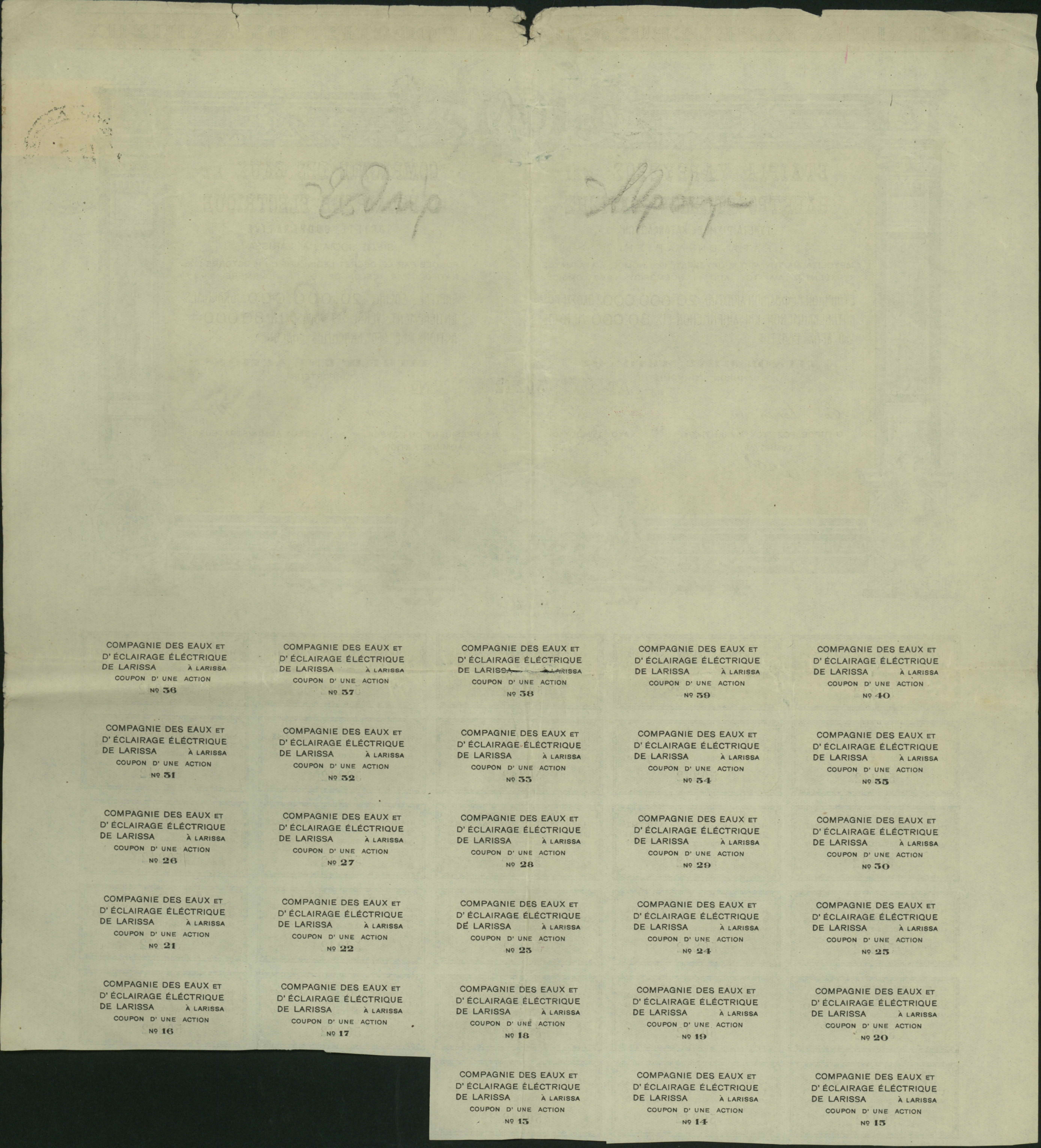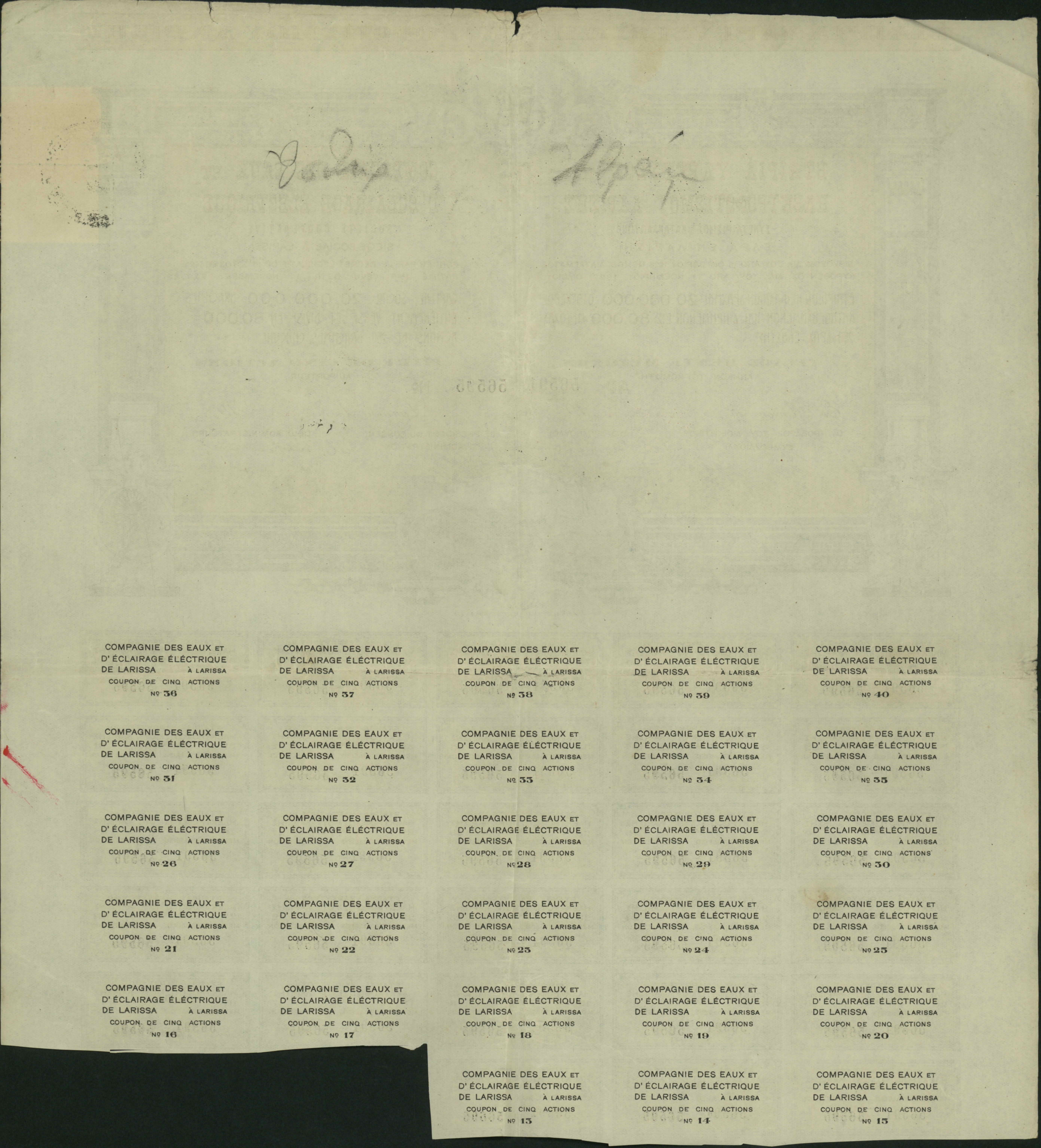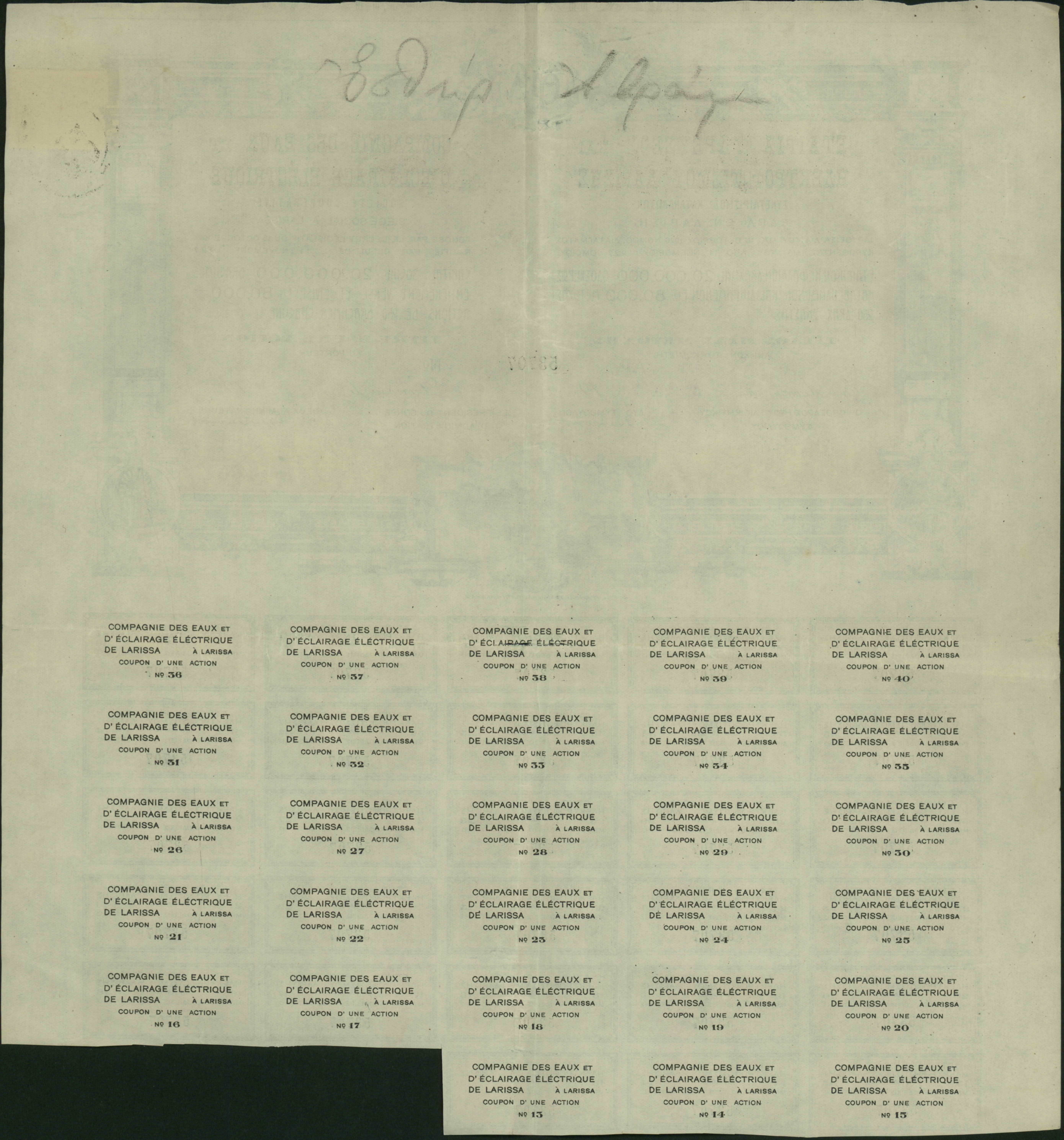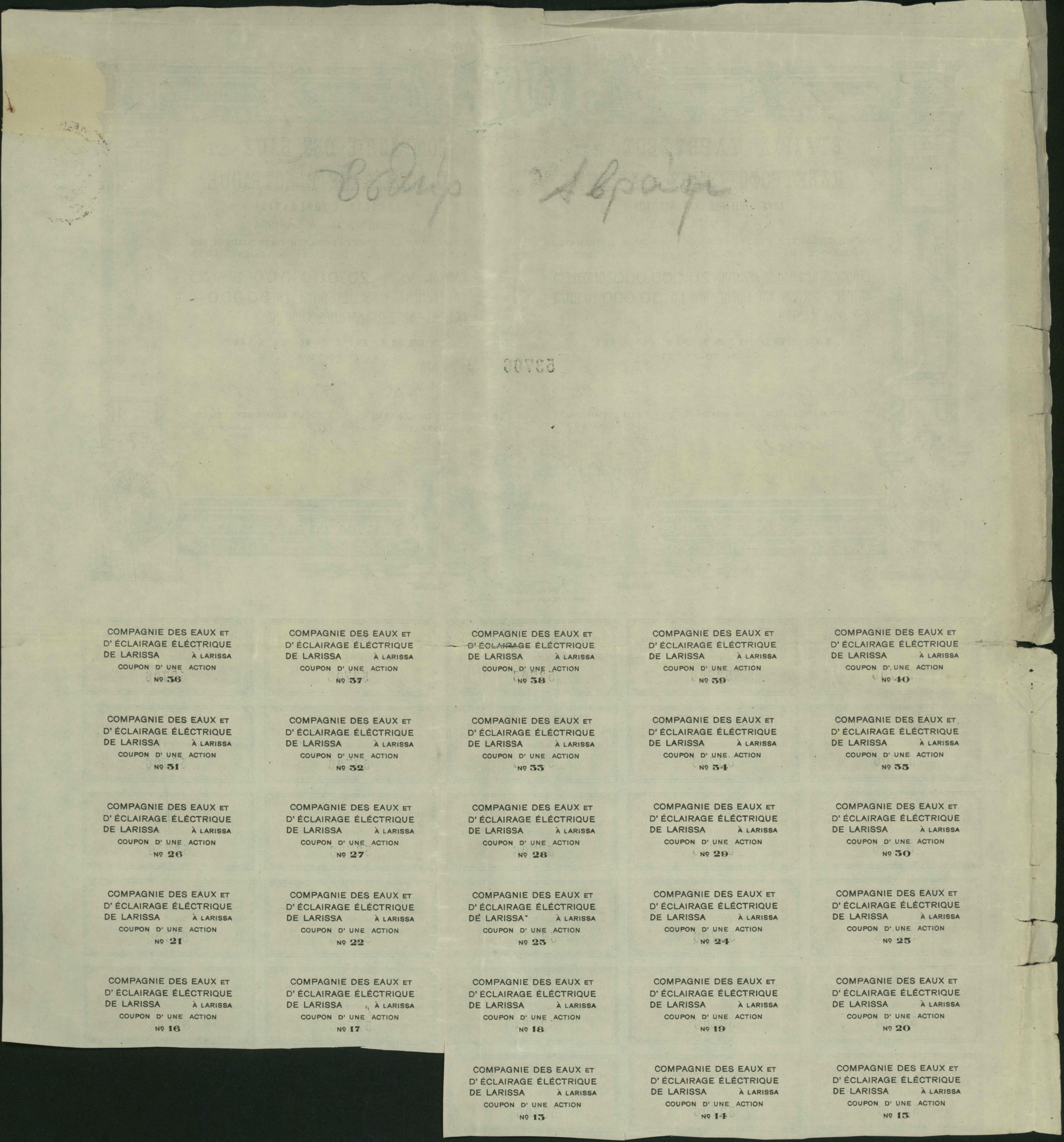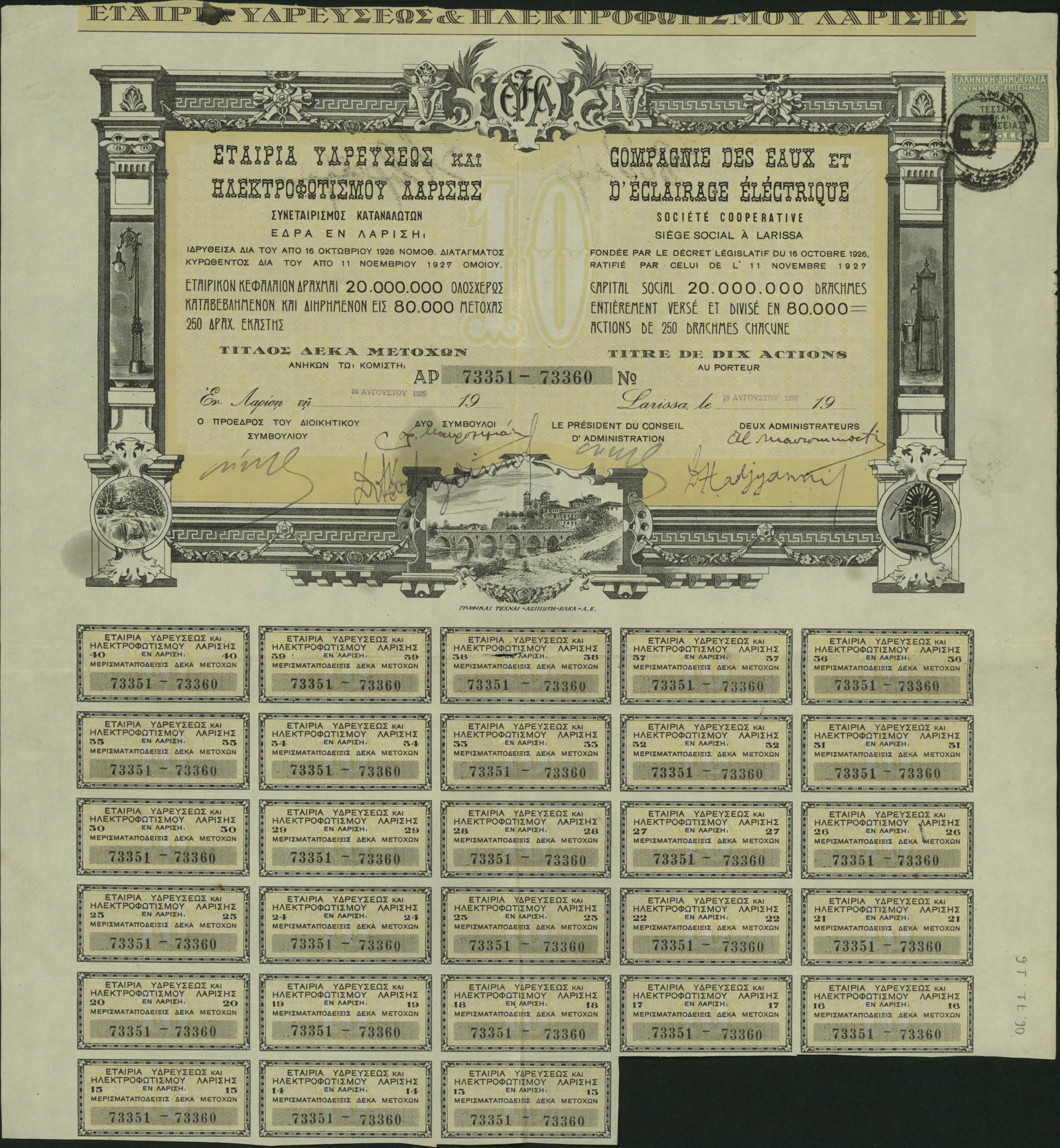 Stock certificates and a share, issued by the Company for Electric Power and Water Supply in Larissa, with coupons.