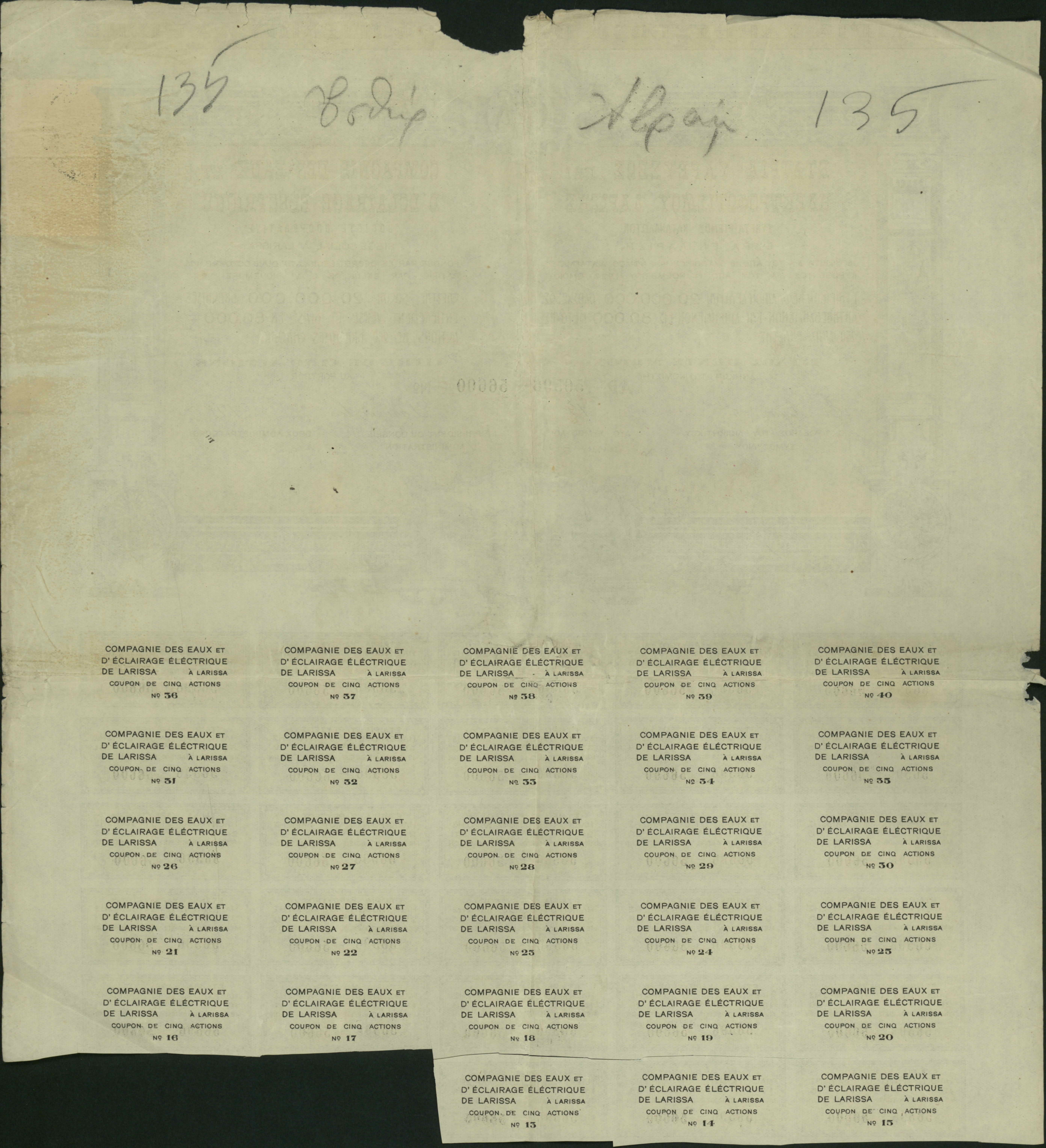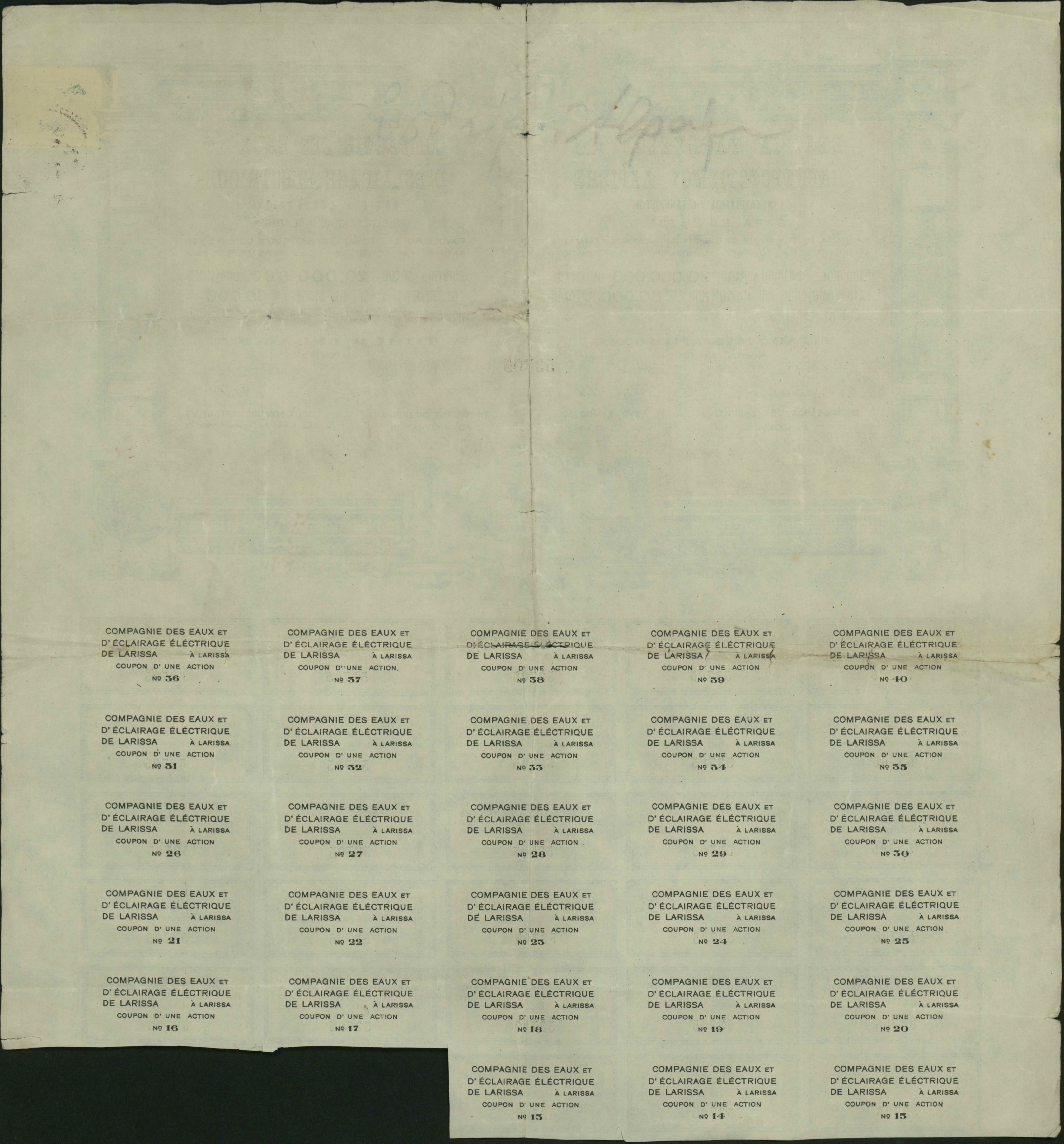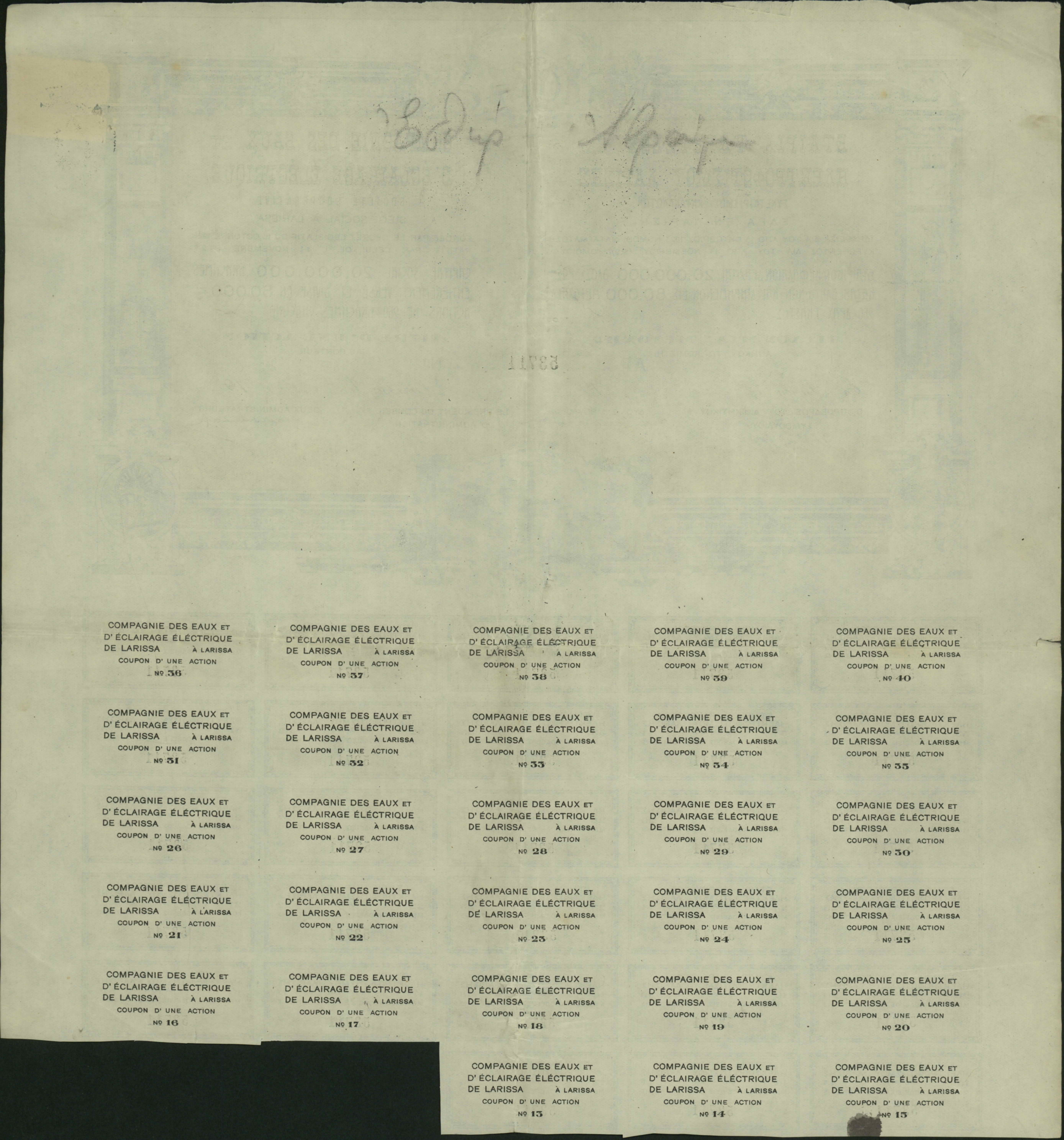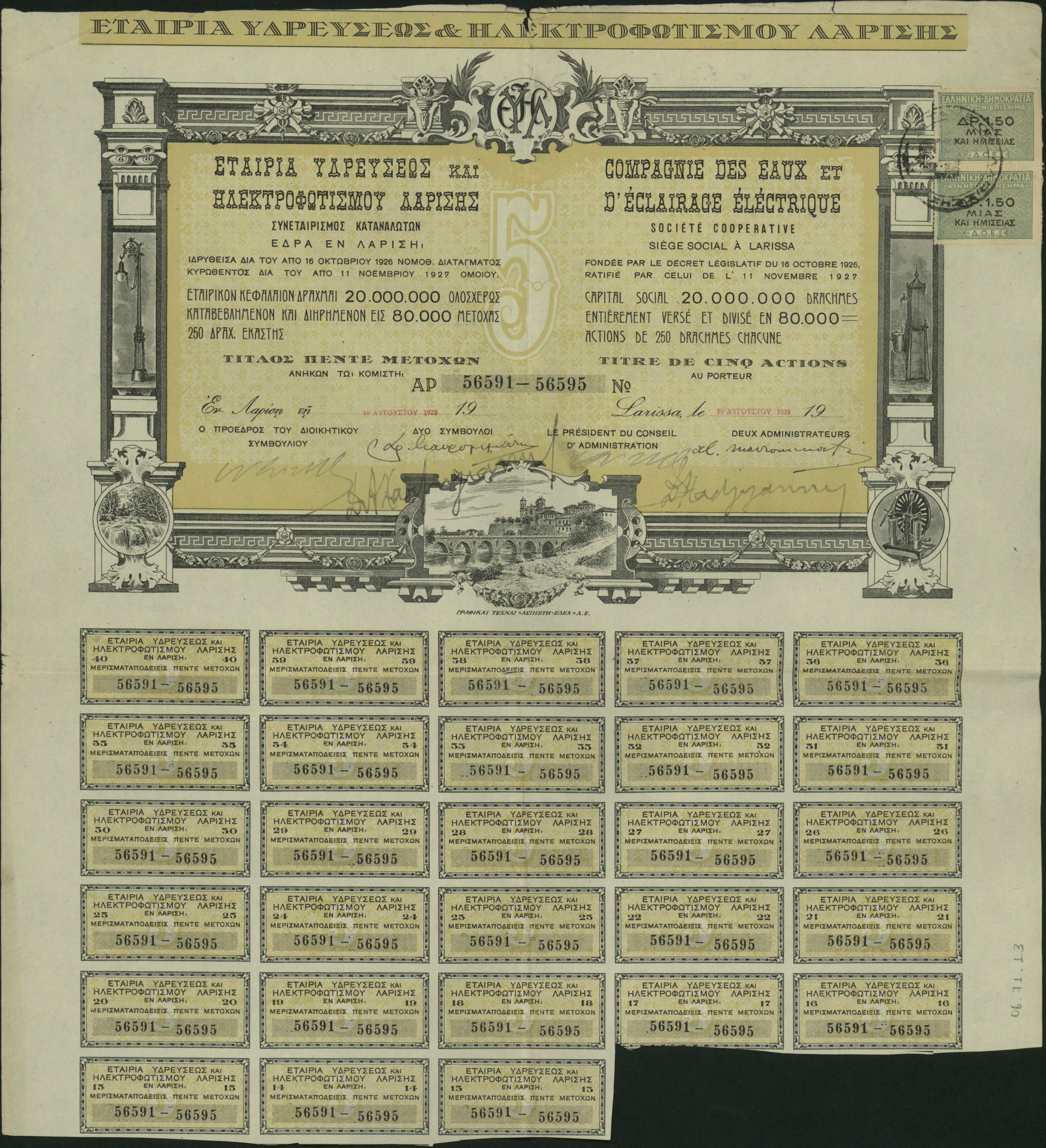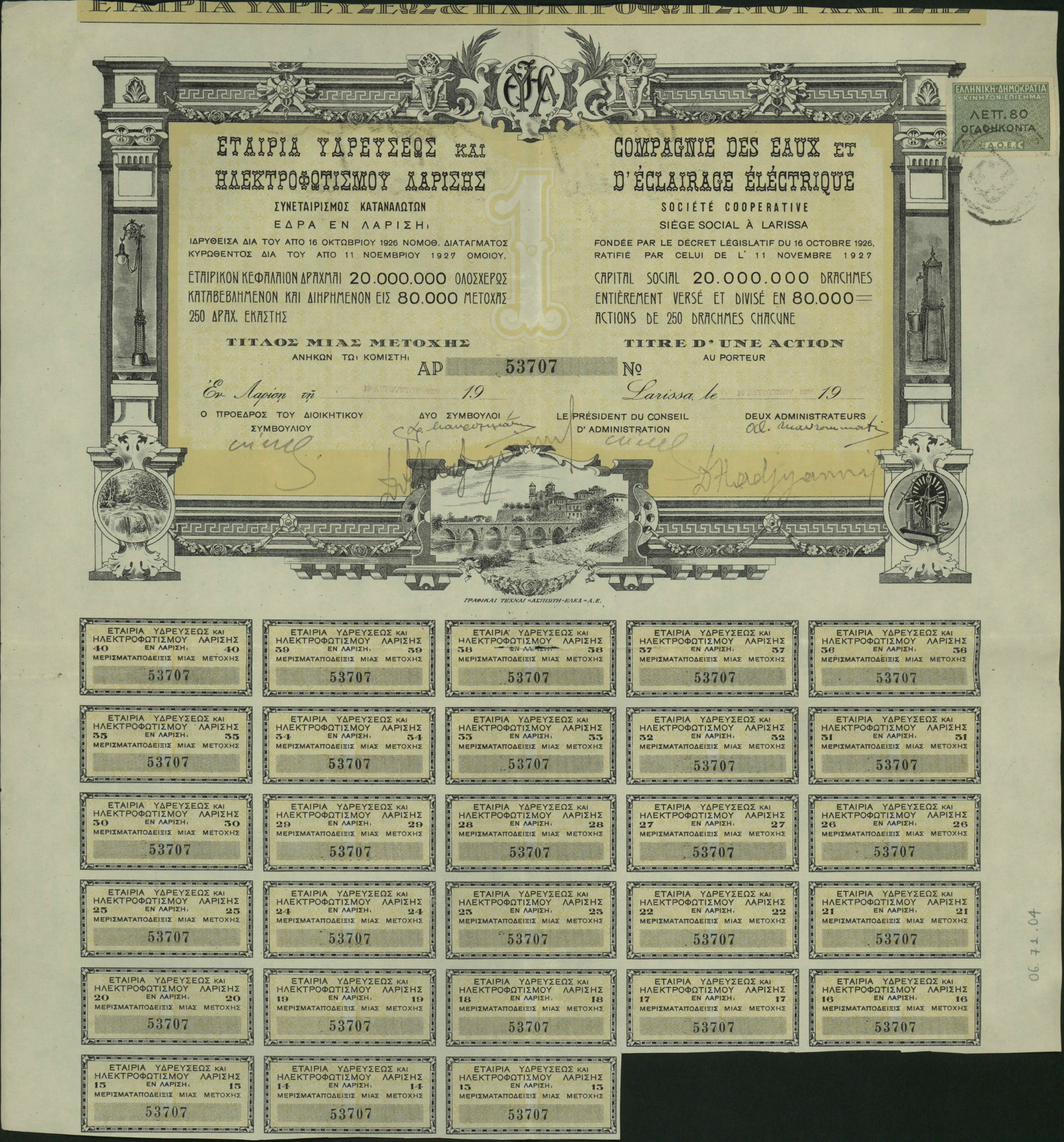 Stock certificates and a share, issued by the Company for Electric Power and Water Supply in Larissa, with coupons.