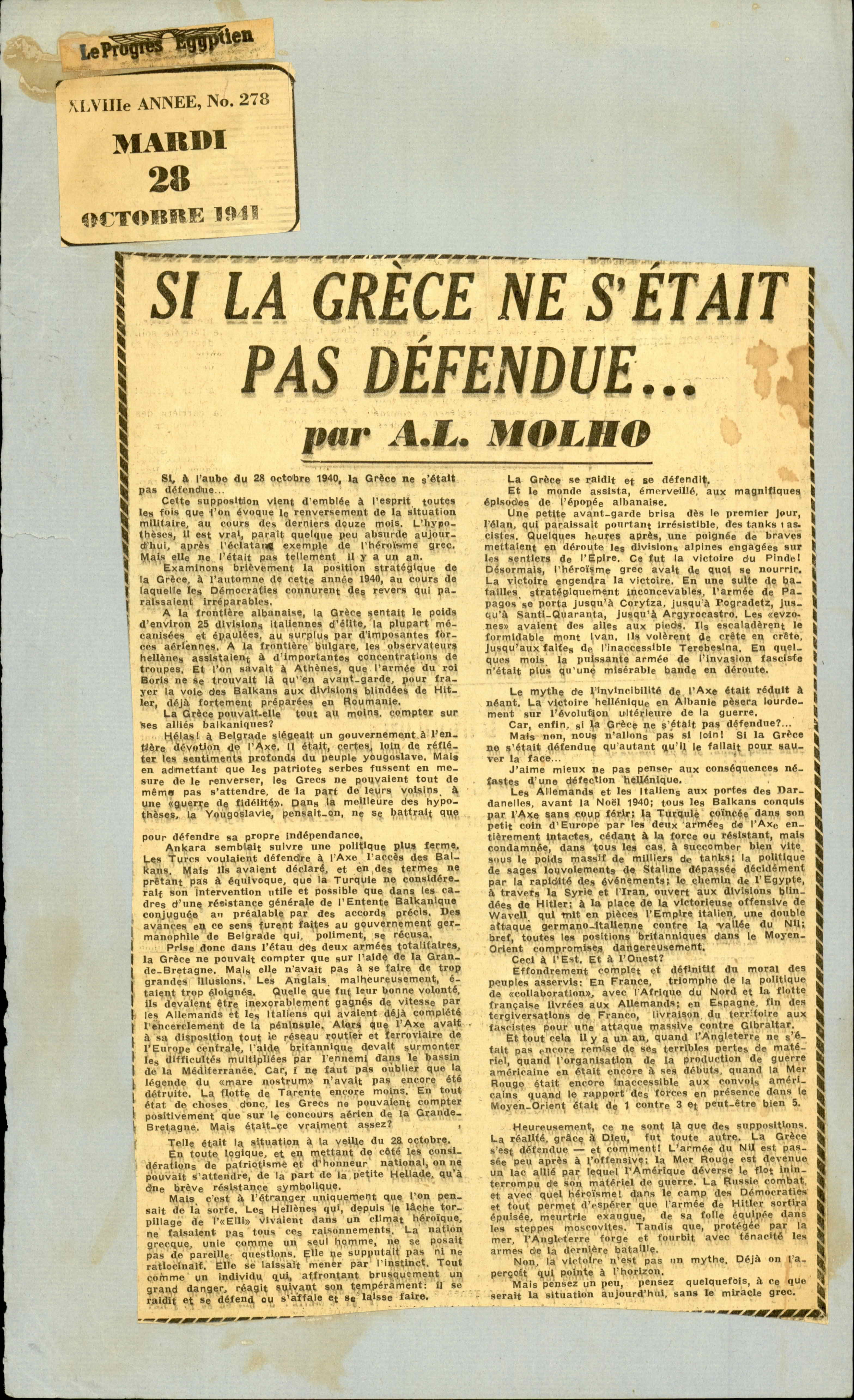 "Le Progrès Égyptien" newspaper clipping, attached on paper, with article titled "Si la Grèce ne s'était pas Défendue" by A.L. Molho, No. 278, October 28th, 1941.
