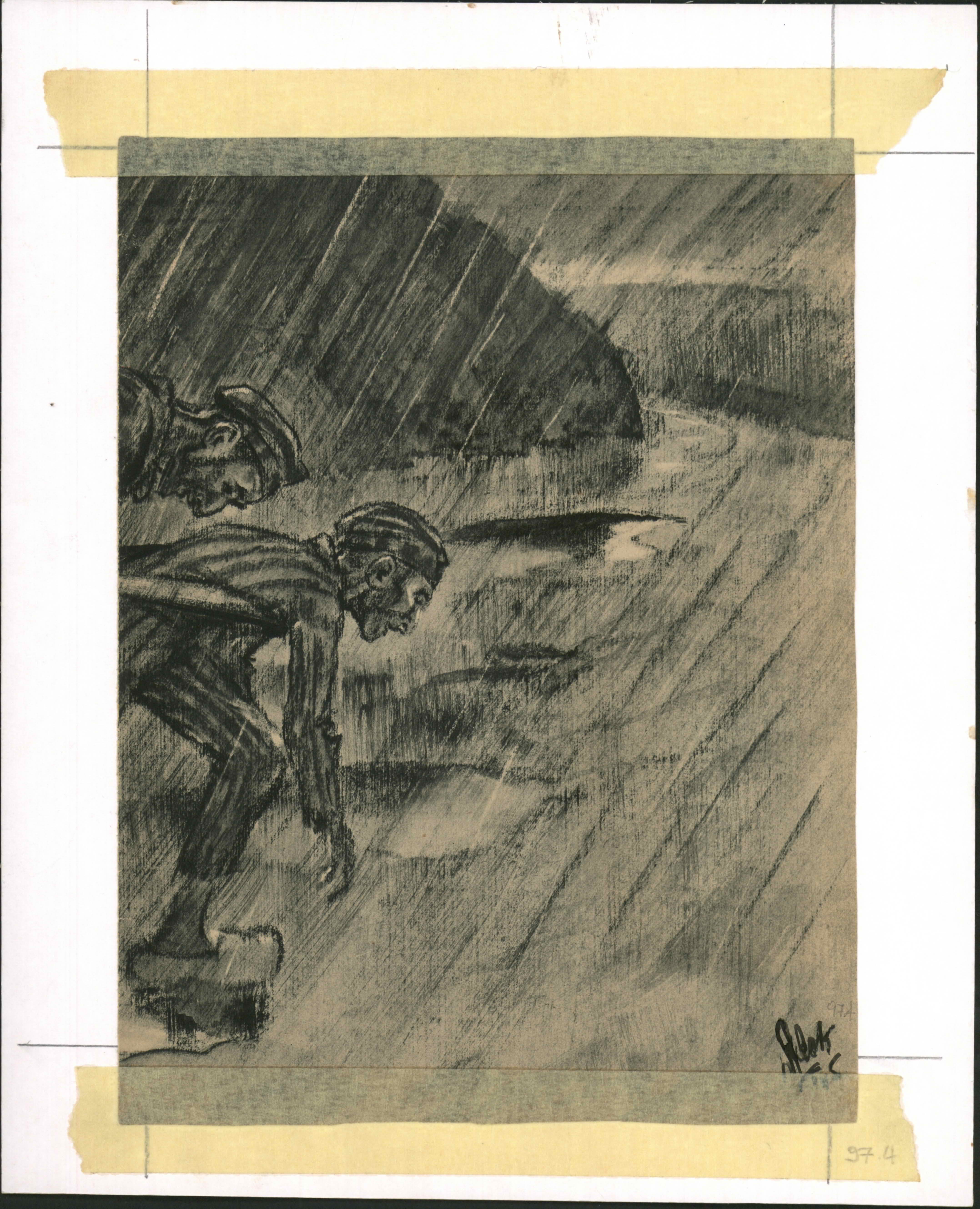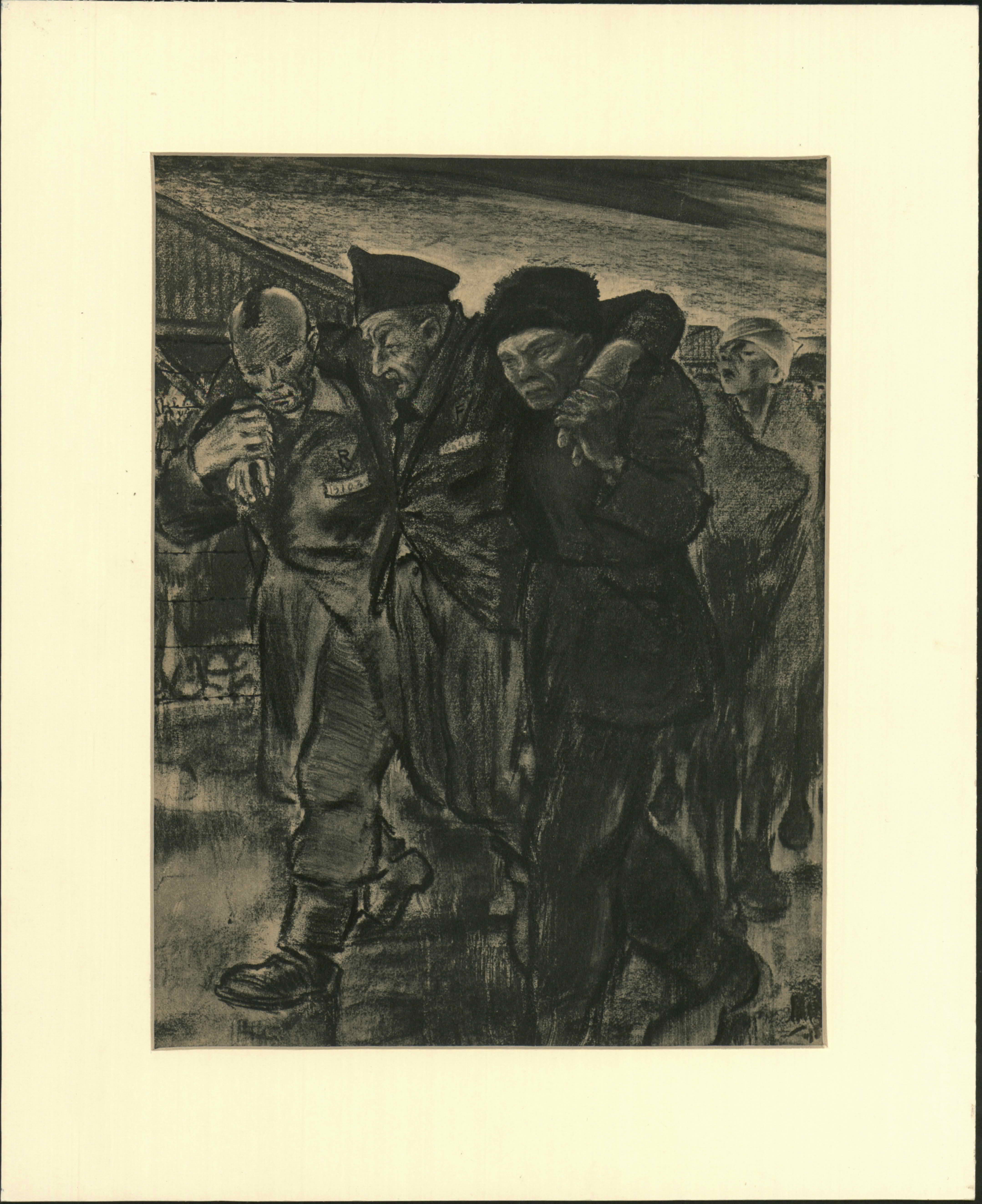 Drawing in charcoal, on both sides of paper, made by Alex Kurlianski in Auschwitz camp.