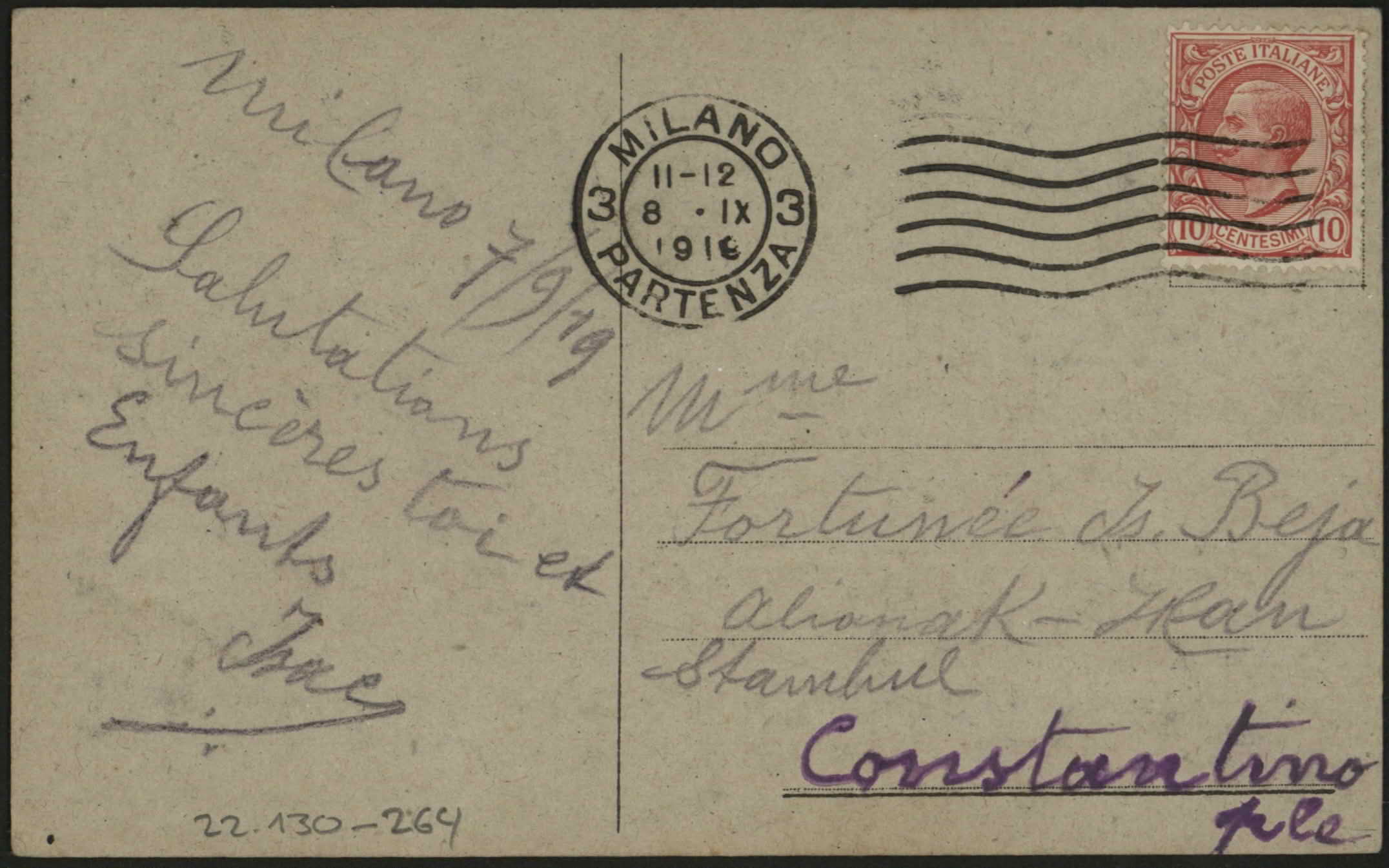 | dc.description | From Isac to Madame Fortunata Is. M. Beja, Constantinople, Alianak - Han 22.23. "Con mis sinceros anguros par la nueva anada. I los ijos, tu Isac, 21/9/919". "21/9/919" (on front side). | |