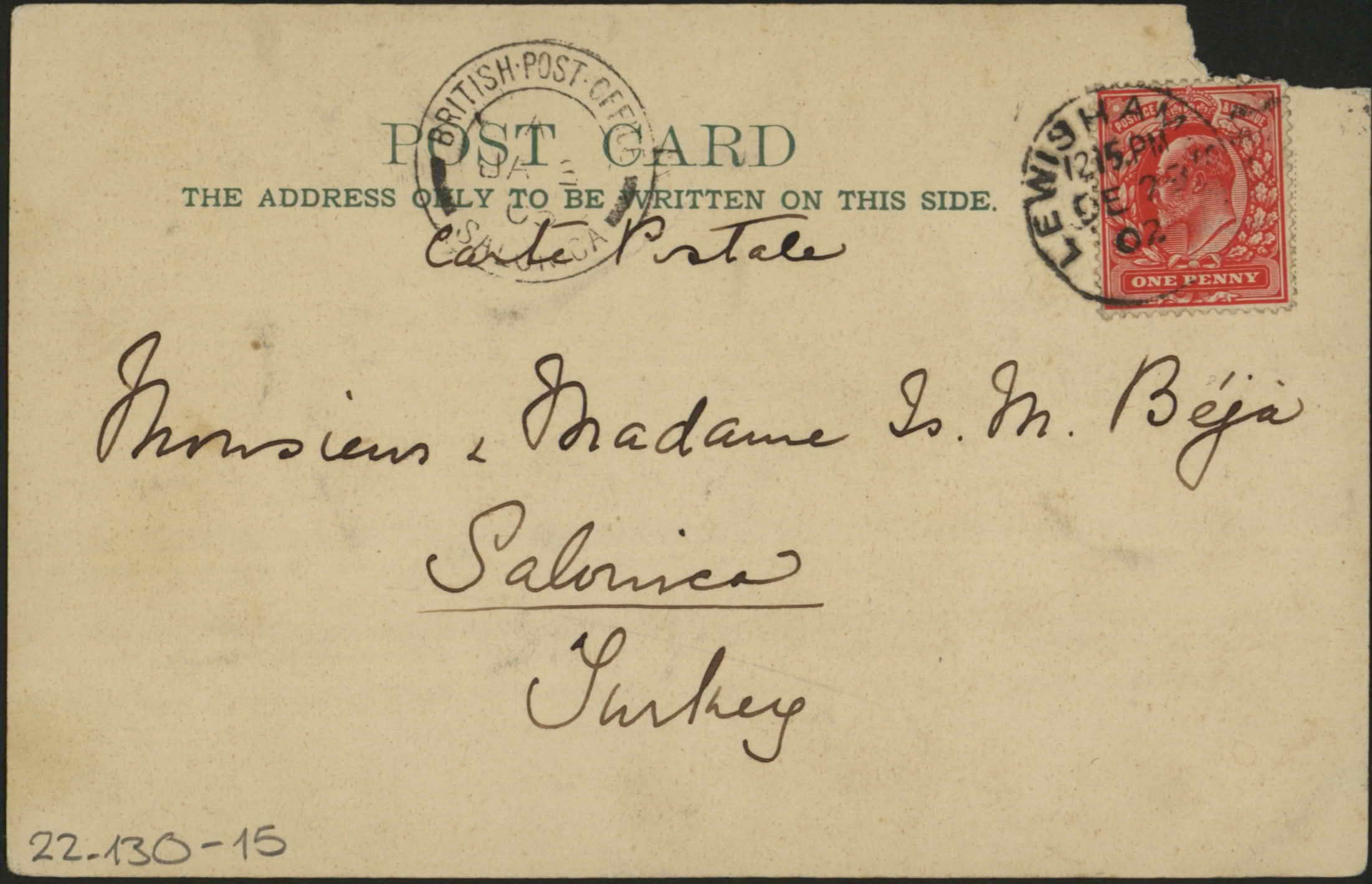 From Mr. Salberg to Monsieur & Madame Is. M. Beja, Salonica, Turkey. "Best wishes for a very happy New Year. … Salberg."