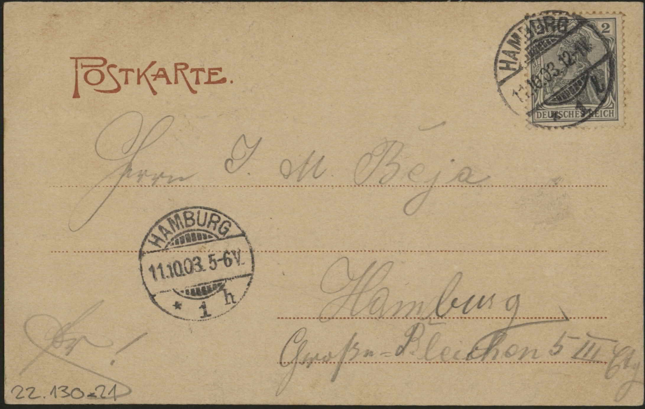 From M.T. to Herrn I. M. Beja, Hamburg, Grosser Bleichen 5 III "… herzlichen Gruessen ..., M.T. - Bon souhait et prosperite, cher cousin Matha (?)"