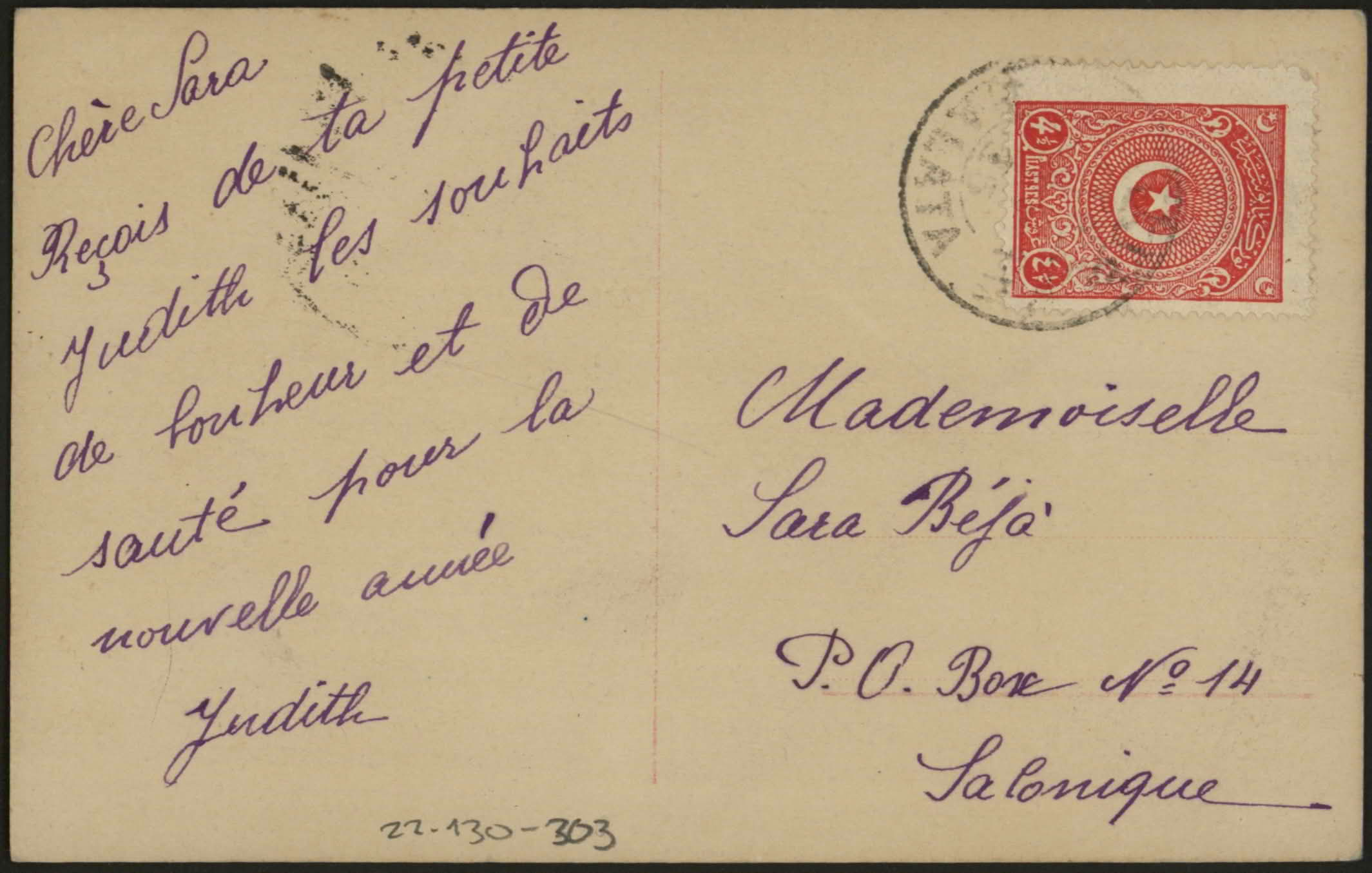 From Monsieur A. Capelouto & Treves, Mersine, and Ergas to Monsieur Is. M. Beja, Agent, Salonique, Turquie. "Mes sinceres salutations, Ergas". "Envoyez-moi des journaux locales a Mersine a cette adresse. Monsieur A. Capelout & Treves".