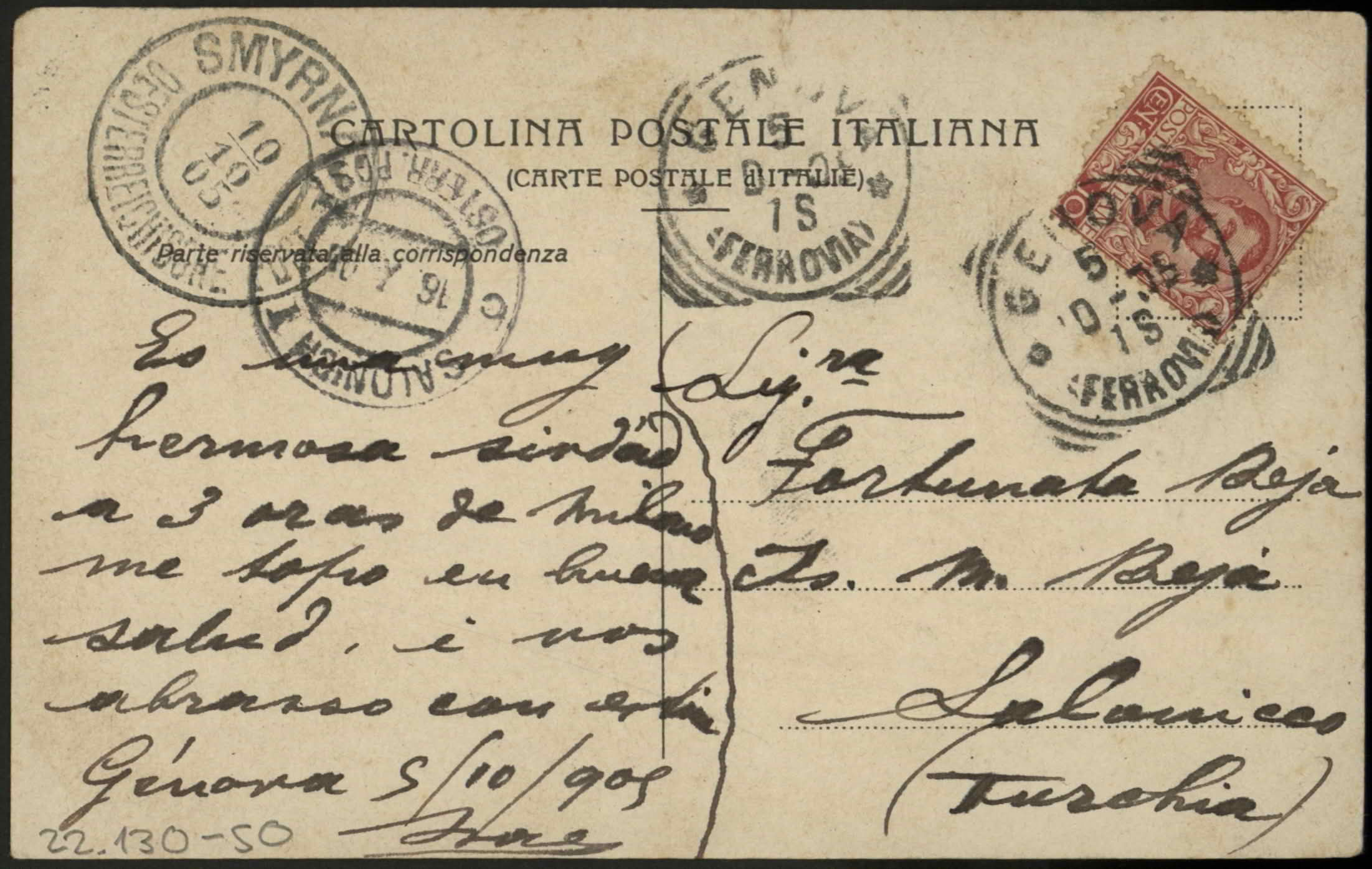 Photograph of "Lederfabrik Hueni Co., Friedrichshafen." From I. Leuthold - Hueni to I. M. Beja, Salonich, Tuerkei. "Besten Dank fuer Ihre freundliche Gratulation zum Jahreswechsel die wir aufs Waermste erwidern. … war letztes Jahr mit dem Hamburger Vergnuegungsdampfer 'Meteor' in Konstantinopel - Smyrna - Athen. Leider ging er nicht nach Salonich, das nach Ihrer Karte sehr schoen sein muss. Vielleicht kommt man doch einmal nach Salonich. Freundlich gruessend Ihr ergebener I. Leuthold = Hueni in Firma Hueni.