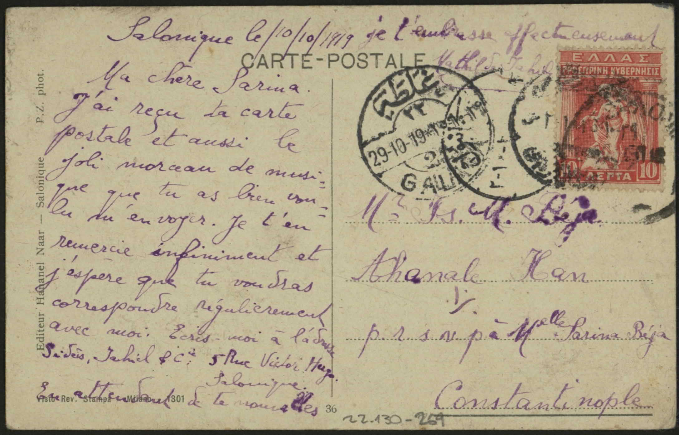 To Monsieur Isaac M. Beja, Alianak Han No. 22, Stamboul, Constantinople. "J'ai parfaite sante. … porteur de la … remettra le ... d'Isaac. Recu lettres. Vous embrasse tous. … Le 31 Decembre 1920. Bonne annee 1921."