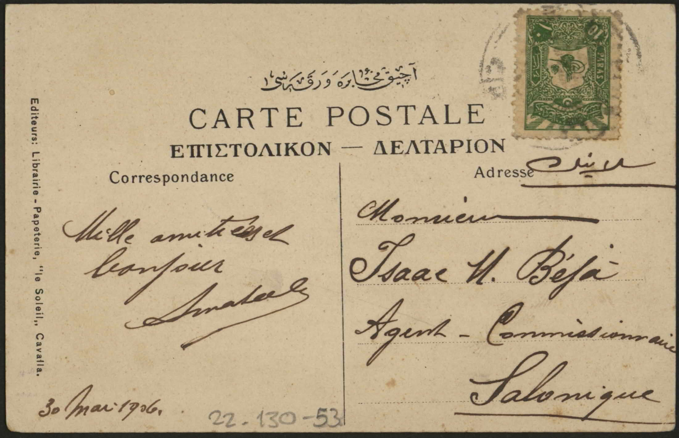 From J. H. Portway to Monsieur Is. M. Beja, Agent, Salonique, Turkie. "Monday evening. Arrived here all right after a fairly comfortable journey about 8 o'clock, leave early tomorrow morning. I find from letters from Leeds (?) that there has been a further advance in the price of wool. Kind regards from J. H. Portway".