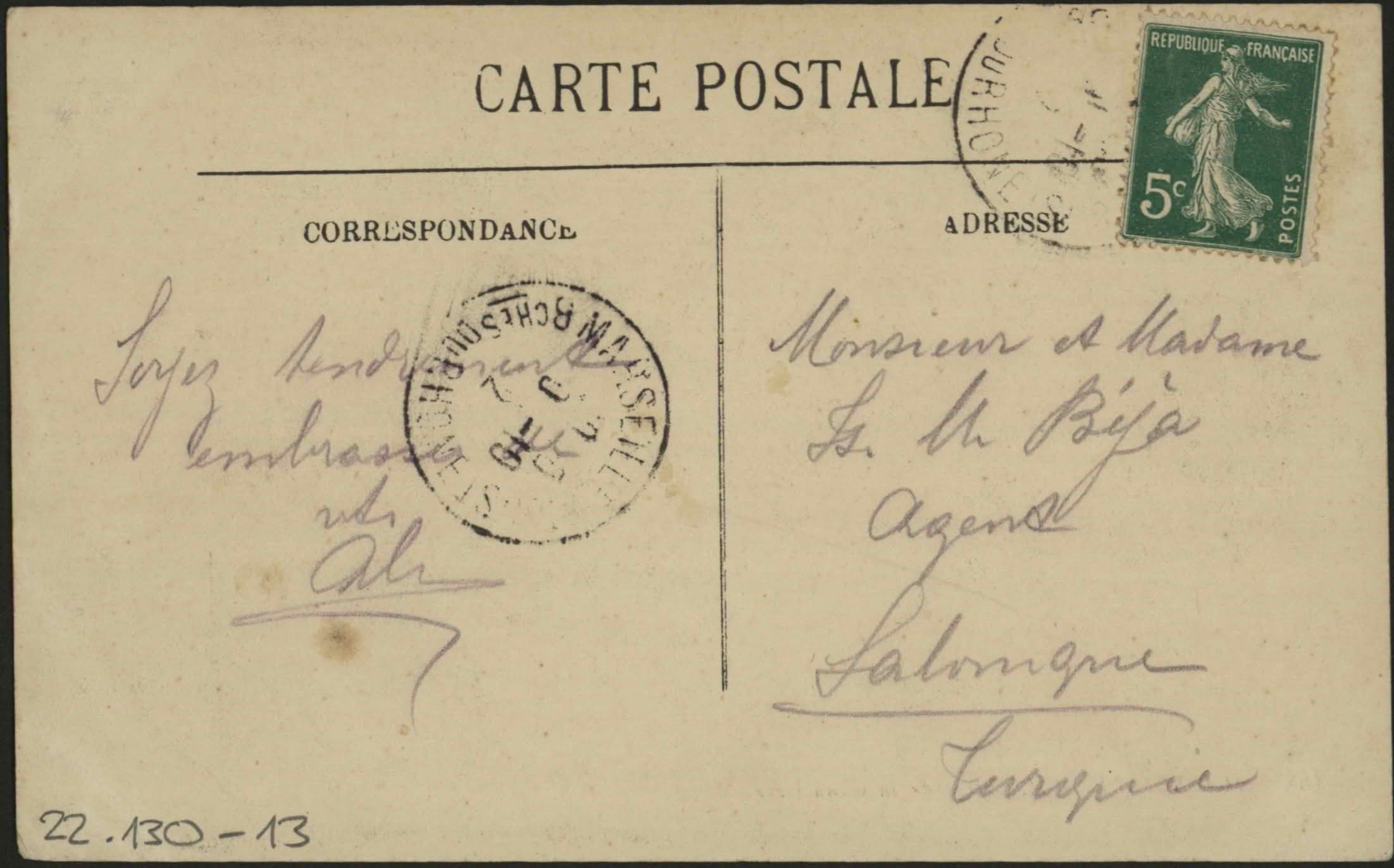 | dc.description | To Monsieur et Madame Is.M. Beja, agent, Salonica, Turkey. "… embrasses de…" | |