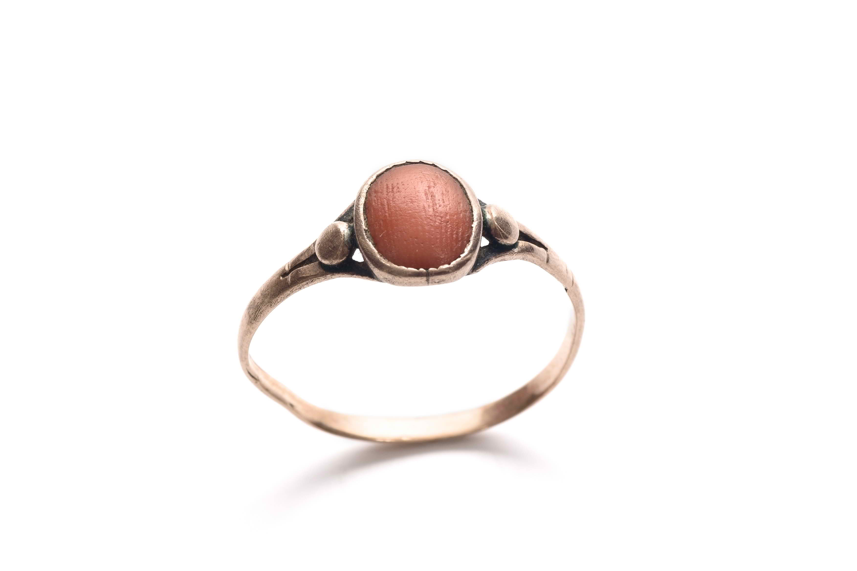 Woman's gold ring, set with oval coral stone in bezel setting, split shanks decorated with small knobs.