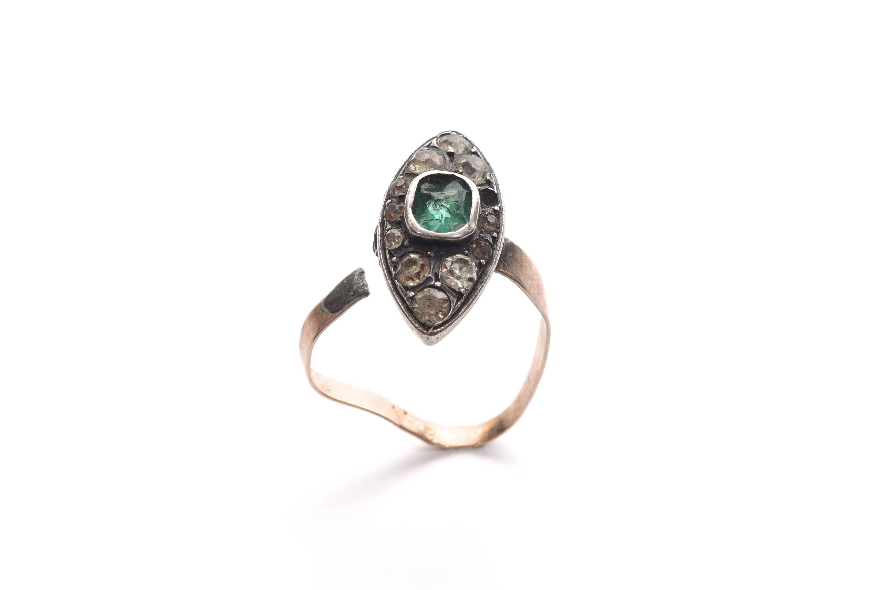 Woman's rose gold ring, with navette-shaped silver bezel set with oval emerald in centre, surrounded by eleven diamonds.