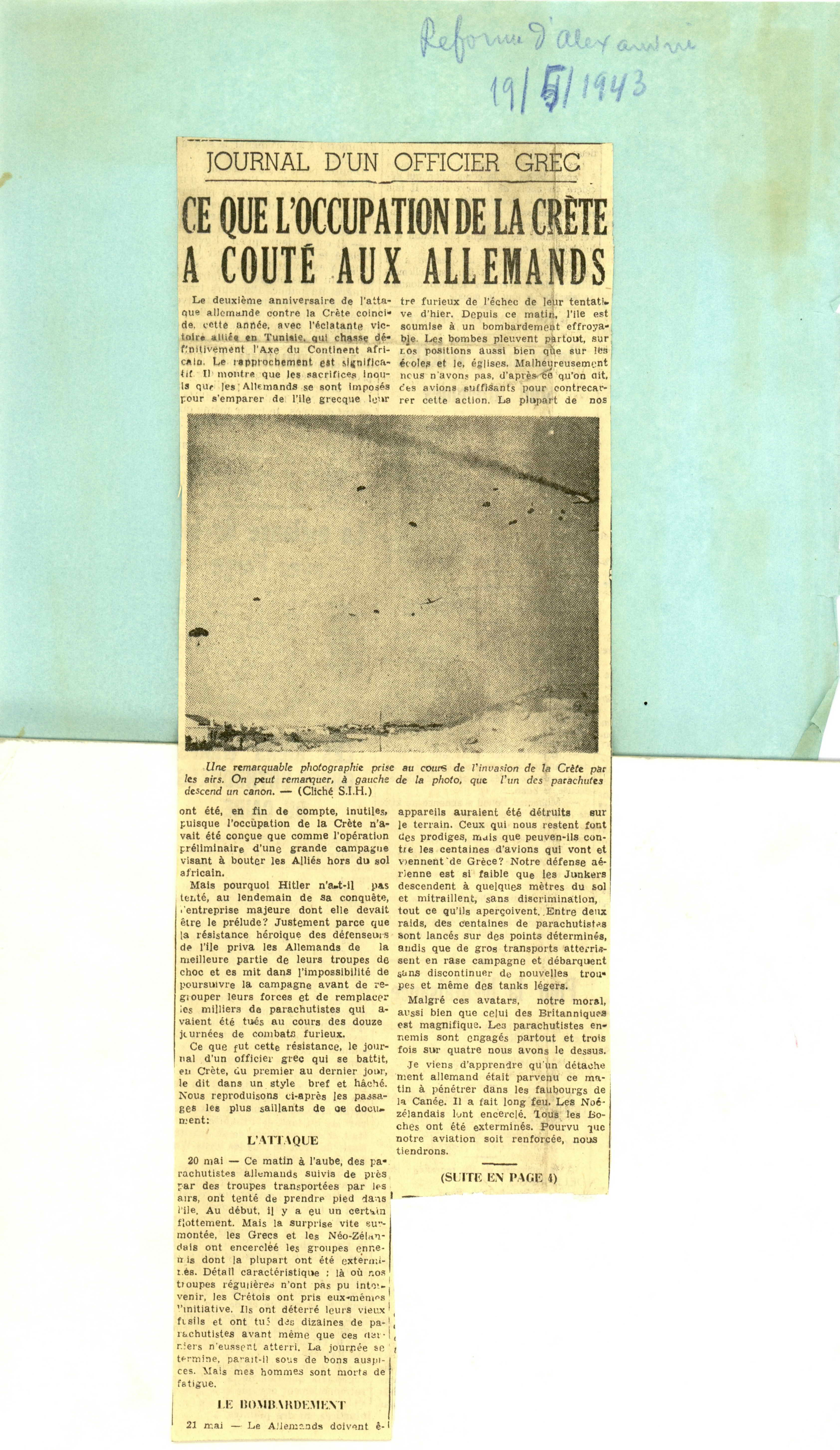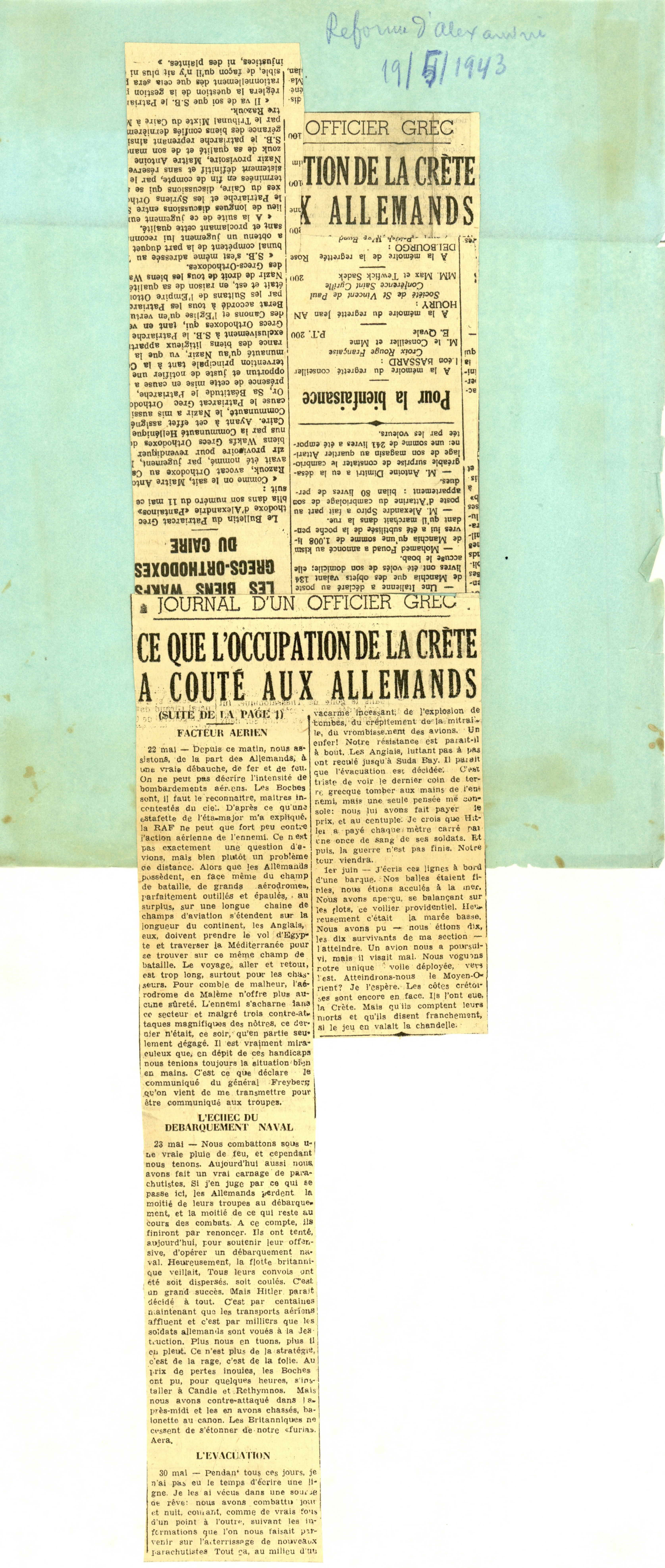 "Le journal d'Alexandrie et la bourse égyptienne" newspaper clipping, attached on paper, with article titled "Journal d'un Officier Grec: Ce que l'occupation de la Crête a coûté aux Allemands", May 19th, 1943.
