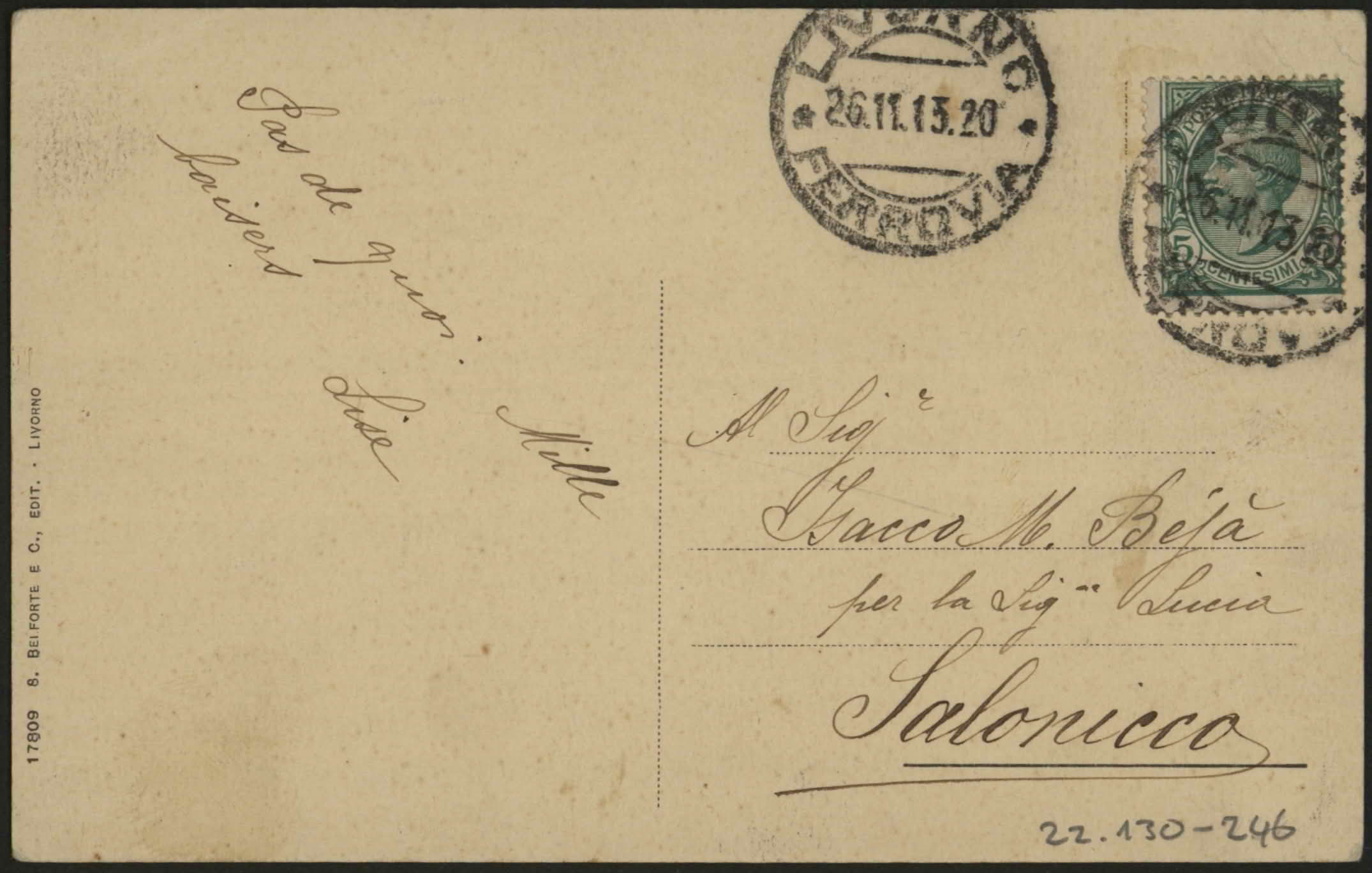 From Matheo to Monsieur Is. M. Beja, Salonique, Grece. "Cher oncle! J'ai recu ta dernier lettre et ai lu avec plaisir les nouvelles que tu me donnais. J'espere que vous continuez tous a bien vous porter. De la maison j'ai de bien meilleures nouvelles, … a commence a sortir cette semaine par beau temps. Je te prie de m'envoyer par ta prochaine le compte que je te rembourserai tout de suite en te priant encore de me dire exactement ce que je devrais t'envoyer tous le mois pour qu'il n'y ait aucune confusion. Bien des compliments a toute la chere famille et a l'occasion de la nouvelle annee commerciale je te souhaite une bonne annee et des bonnes affaires. Embrasse bien les enfants de ma part. Ton devoue Matheo".