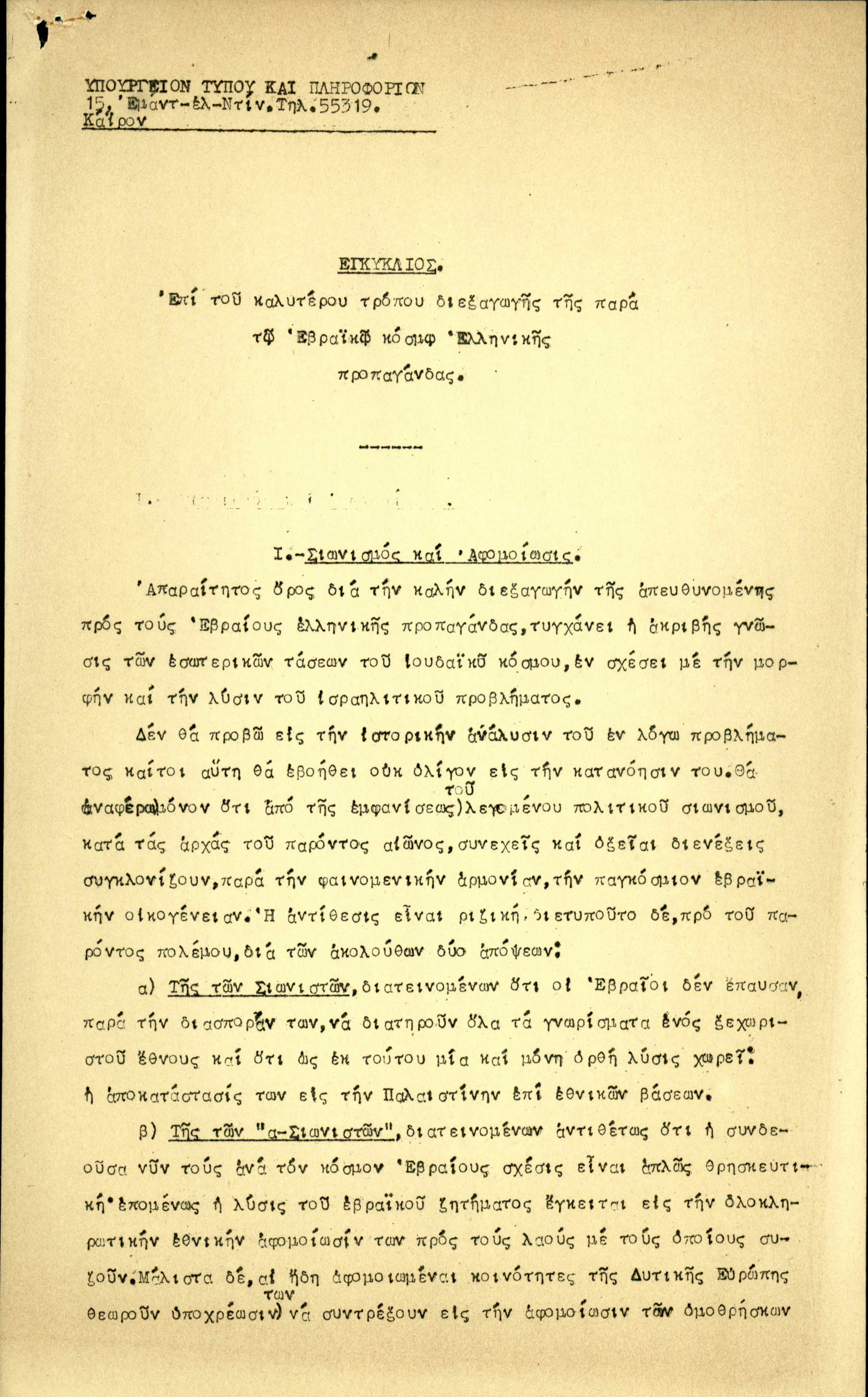 | dc.description | Bulletin titled "Ἐπὶ τοῦ καλύτερου τρόπου διεξαγωγῆς τῆς παρὰ τῷ Ἑβραϊκῷ Ἑλληνικῆς προπαγάνδας" ("On the best way to carry out anti-Jewish Greek propaganda") issued by the Greek Ministry of Press and Information, by G. Kartalis, September 3rd, 1944. | |