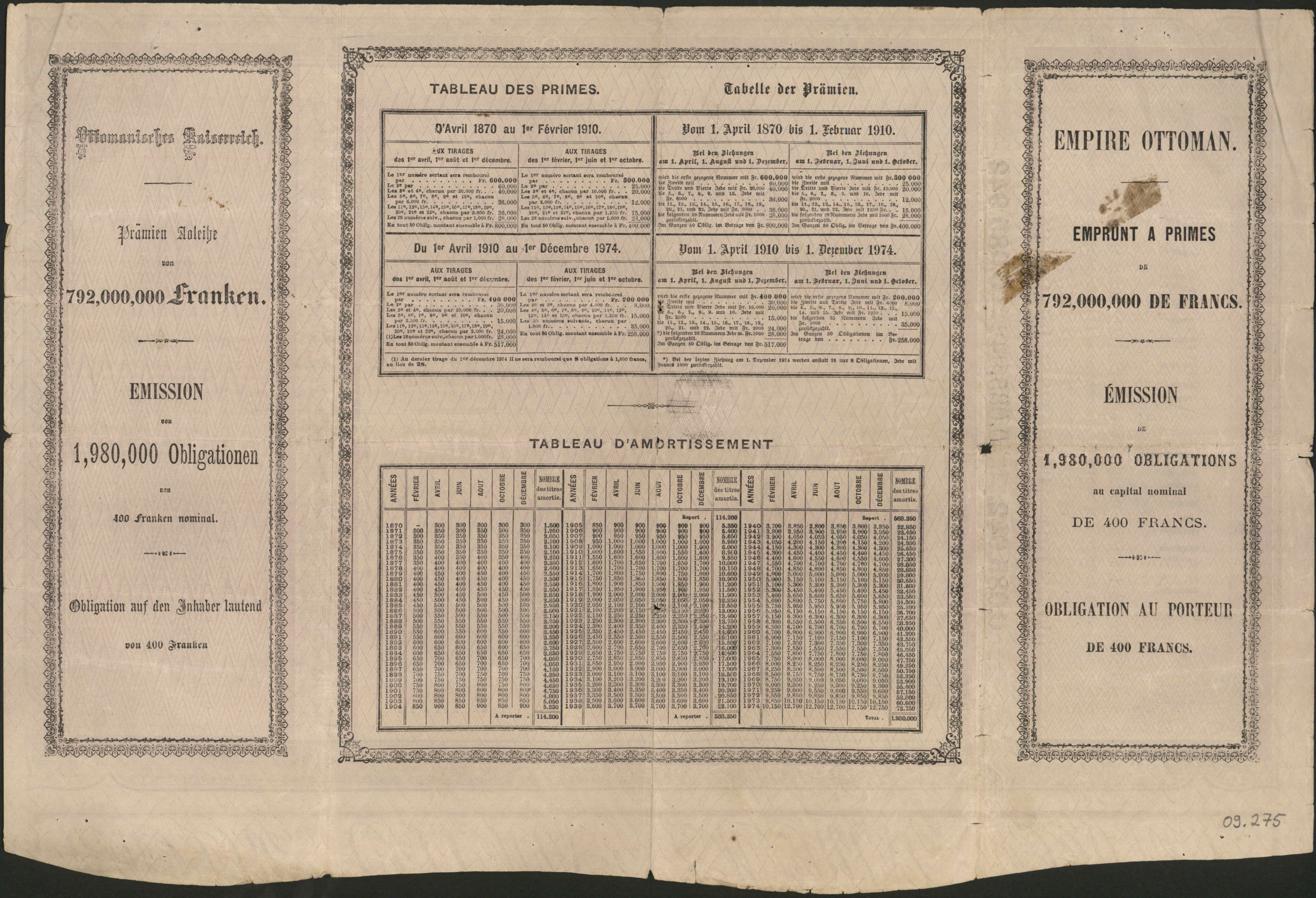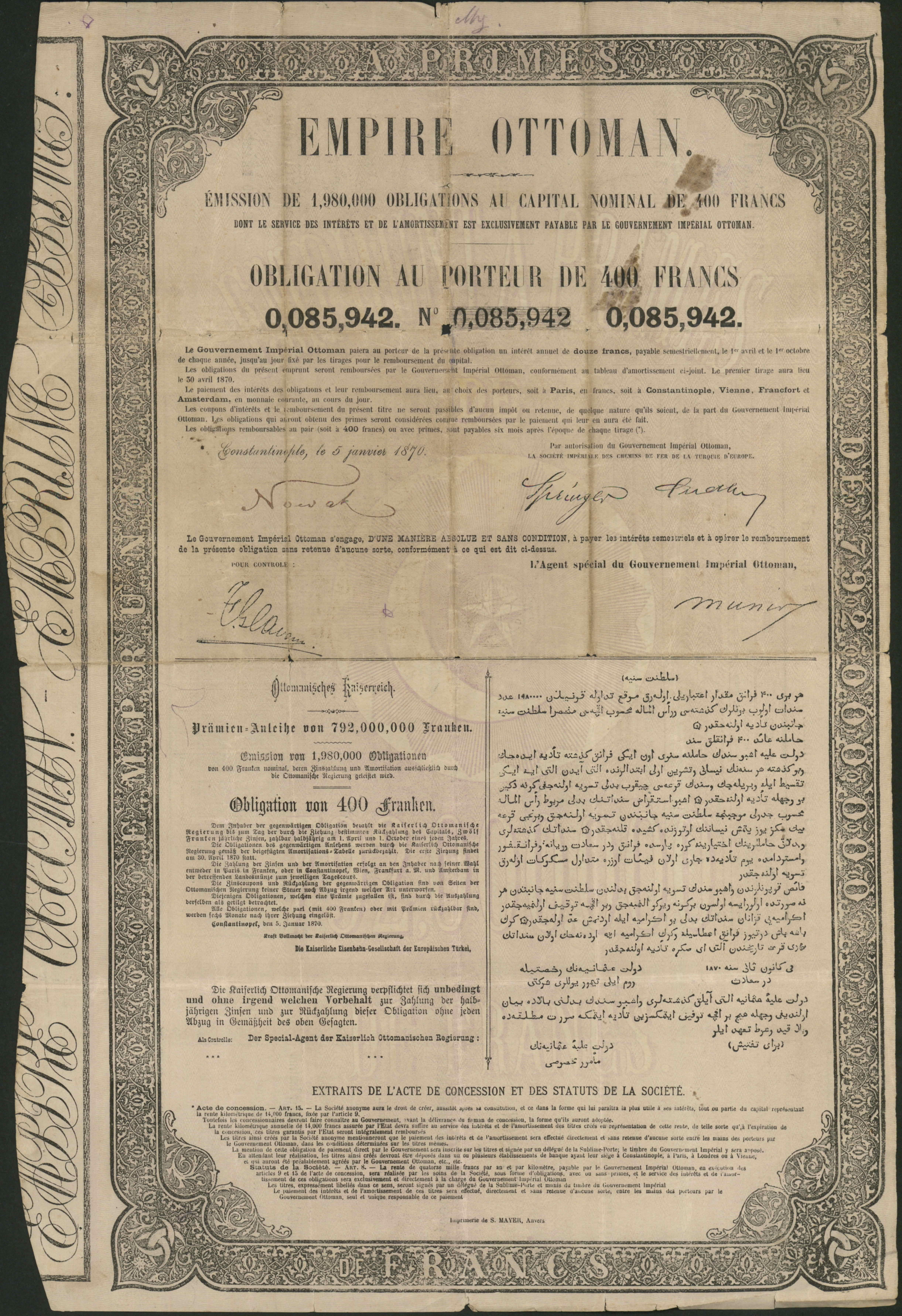 Bond and an obligation, issued by the Ottoman Empire, in Istanbul.
