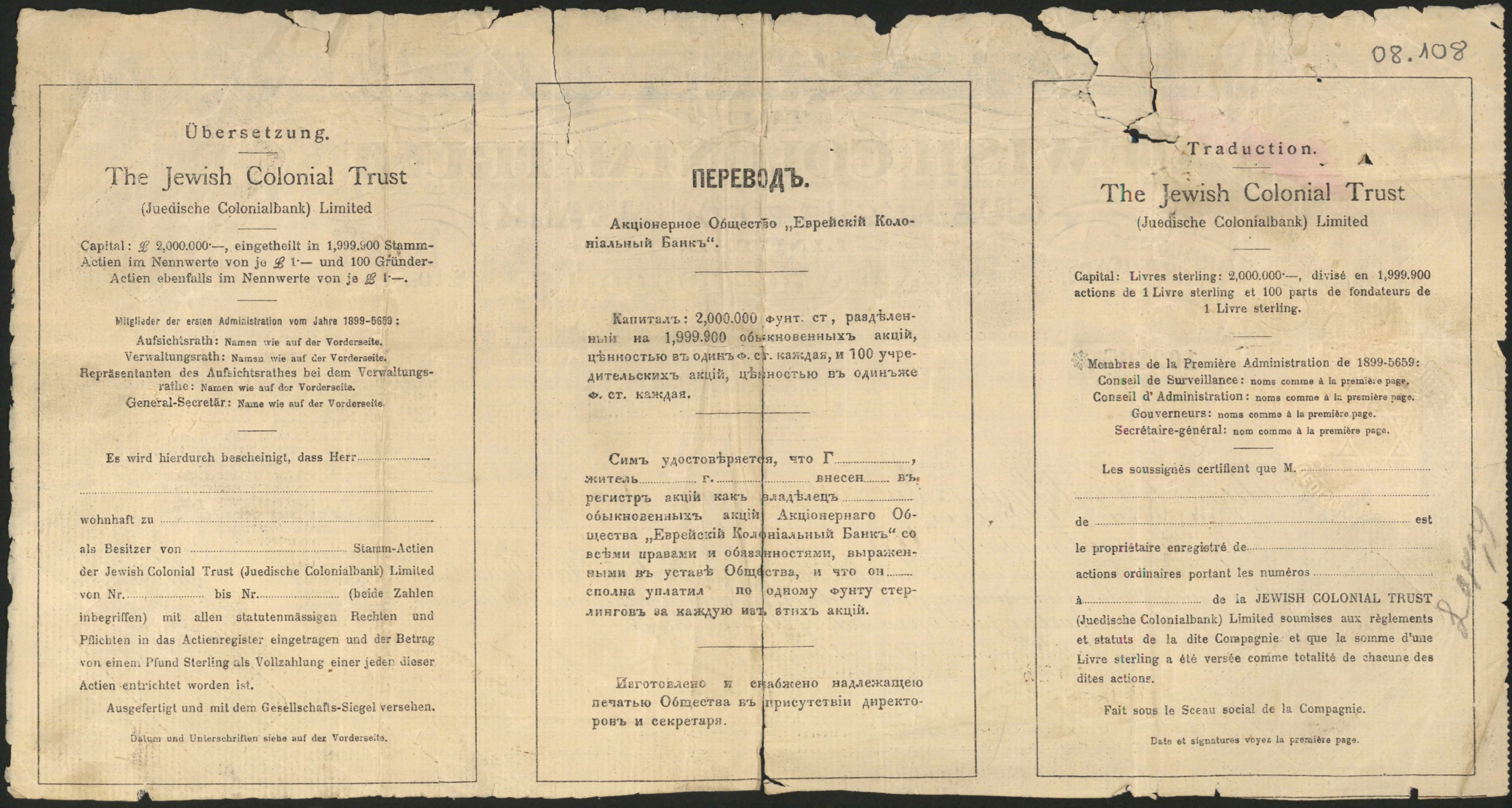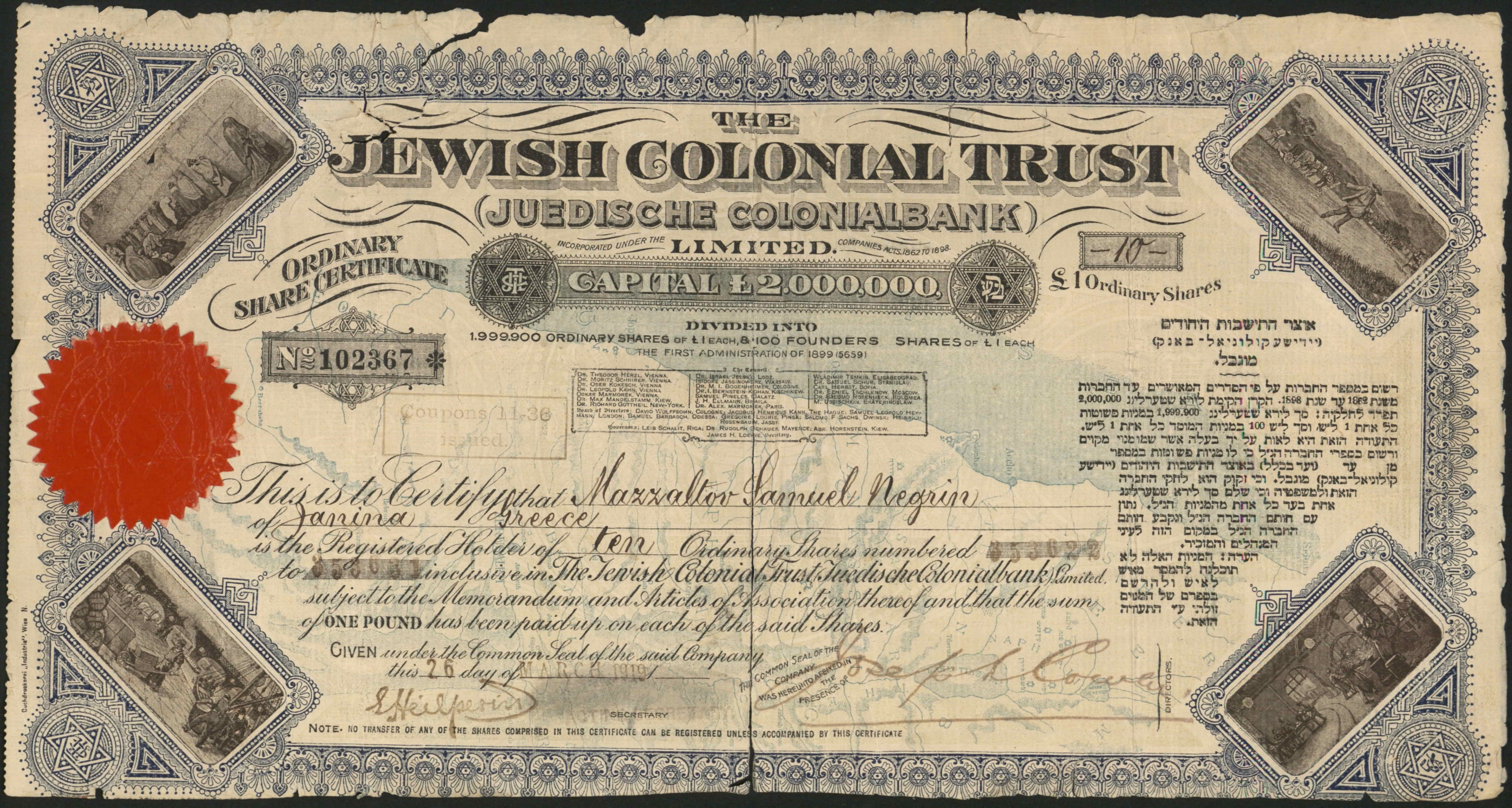 Shares issued by Jewish Colonial Trust for Mazaltov Samuel Negrin in Ioannina.