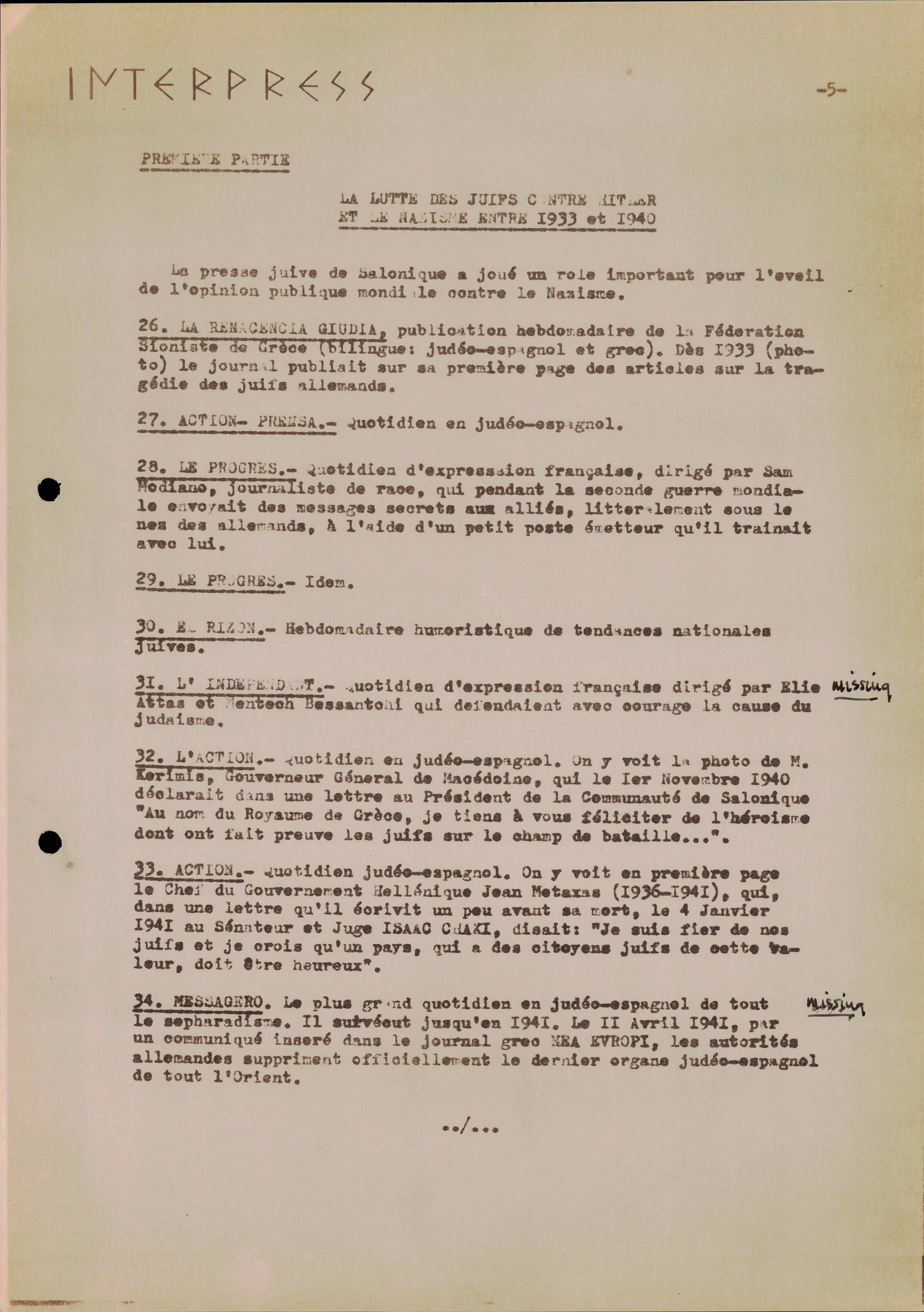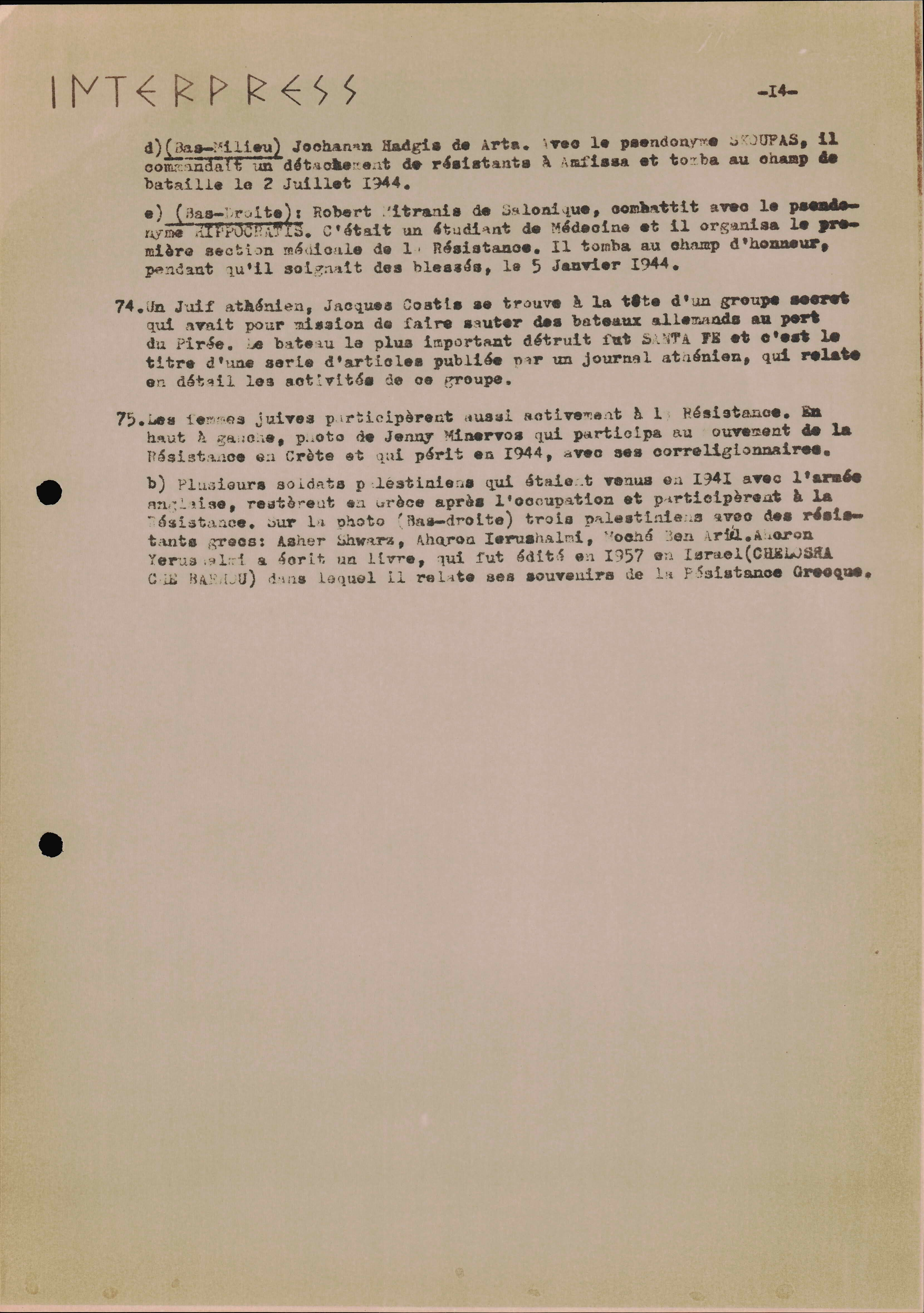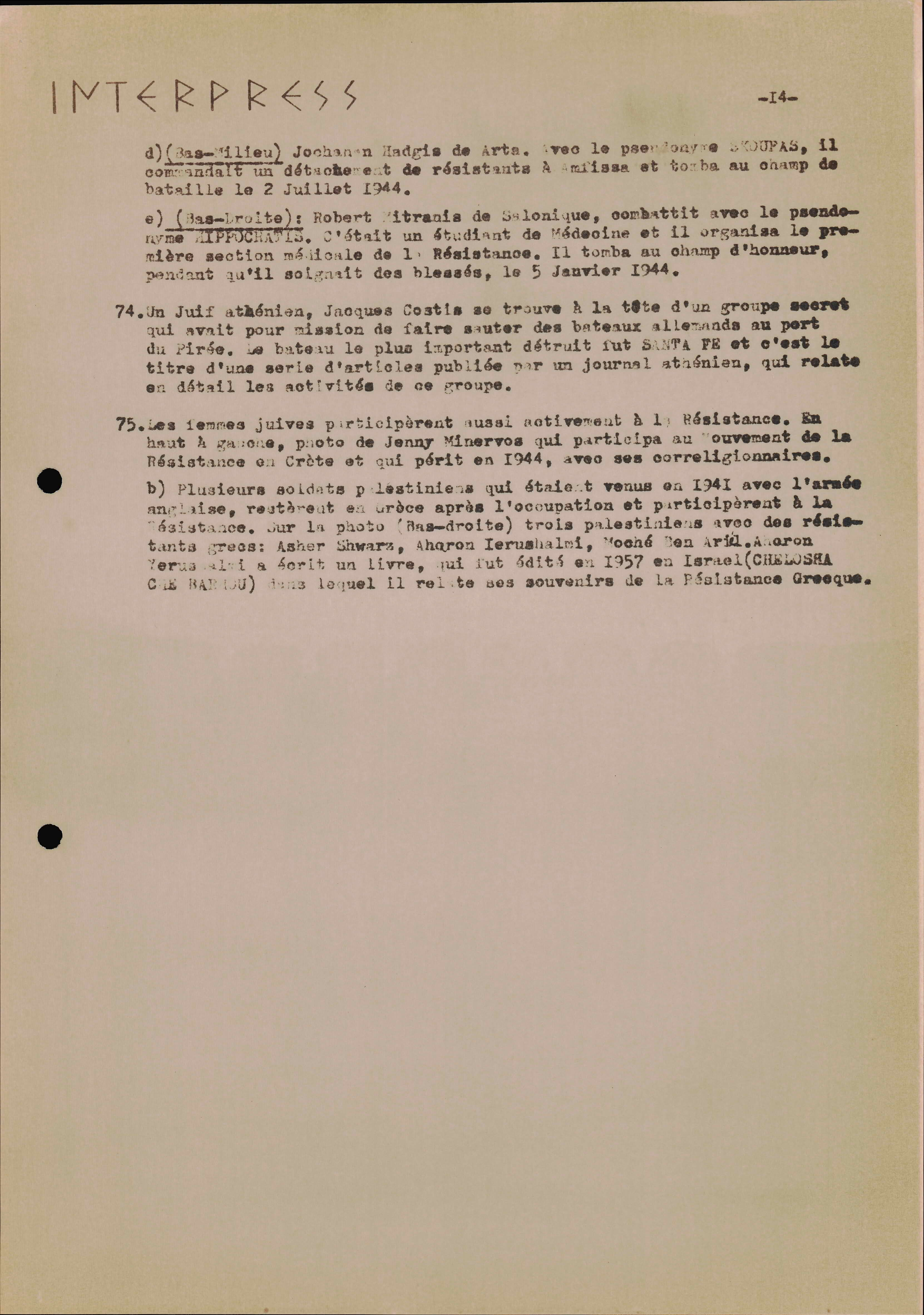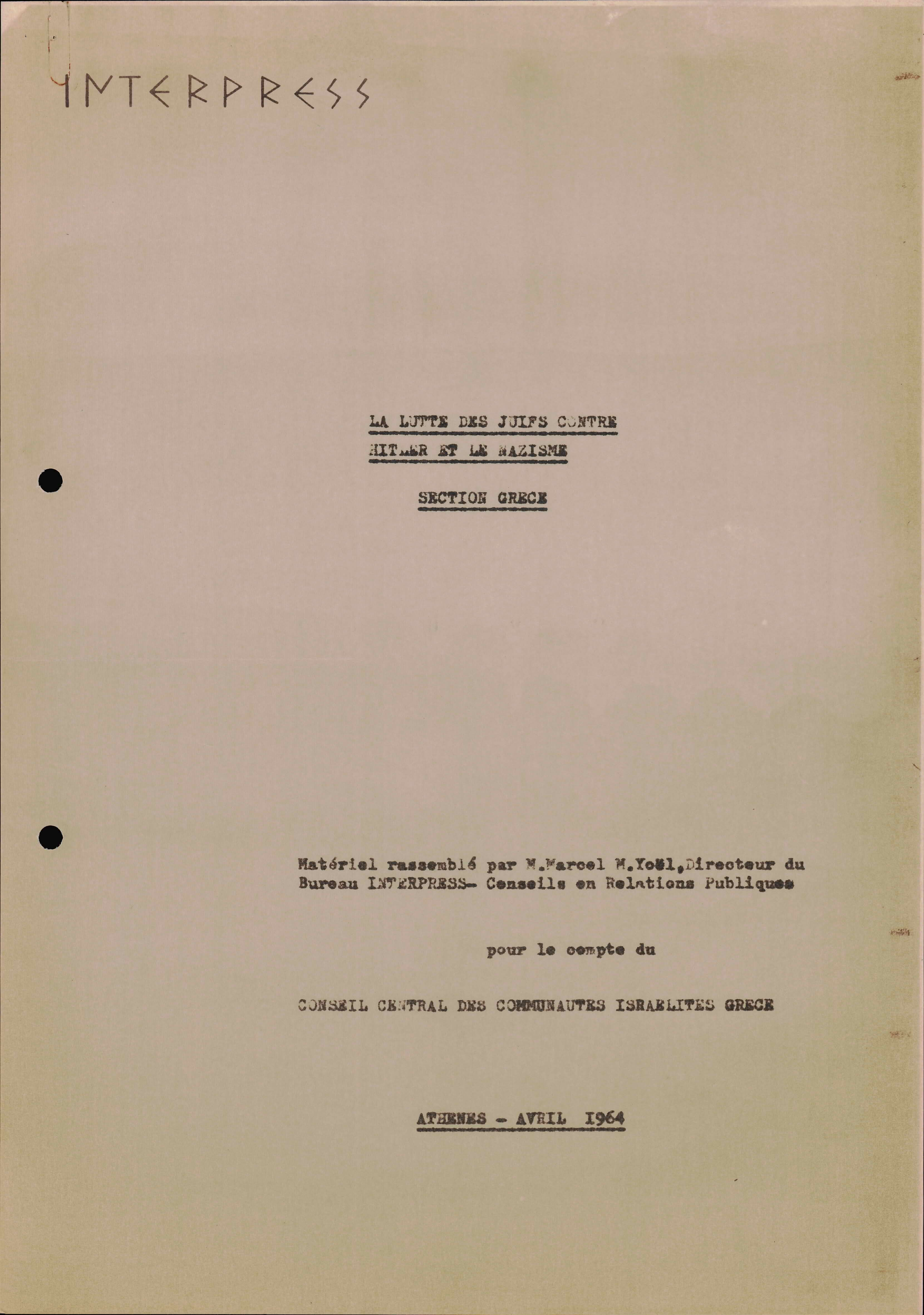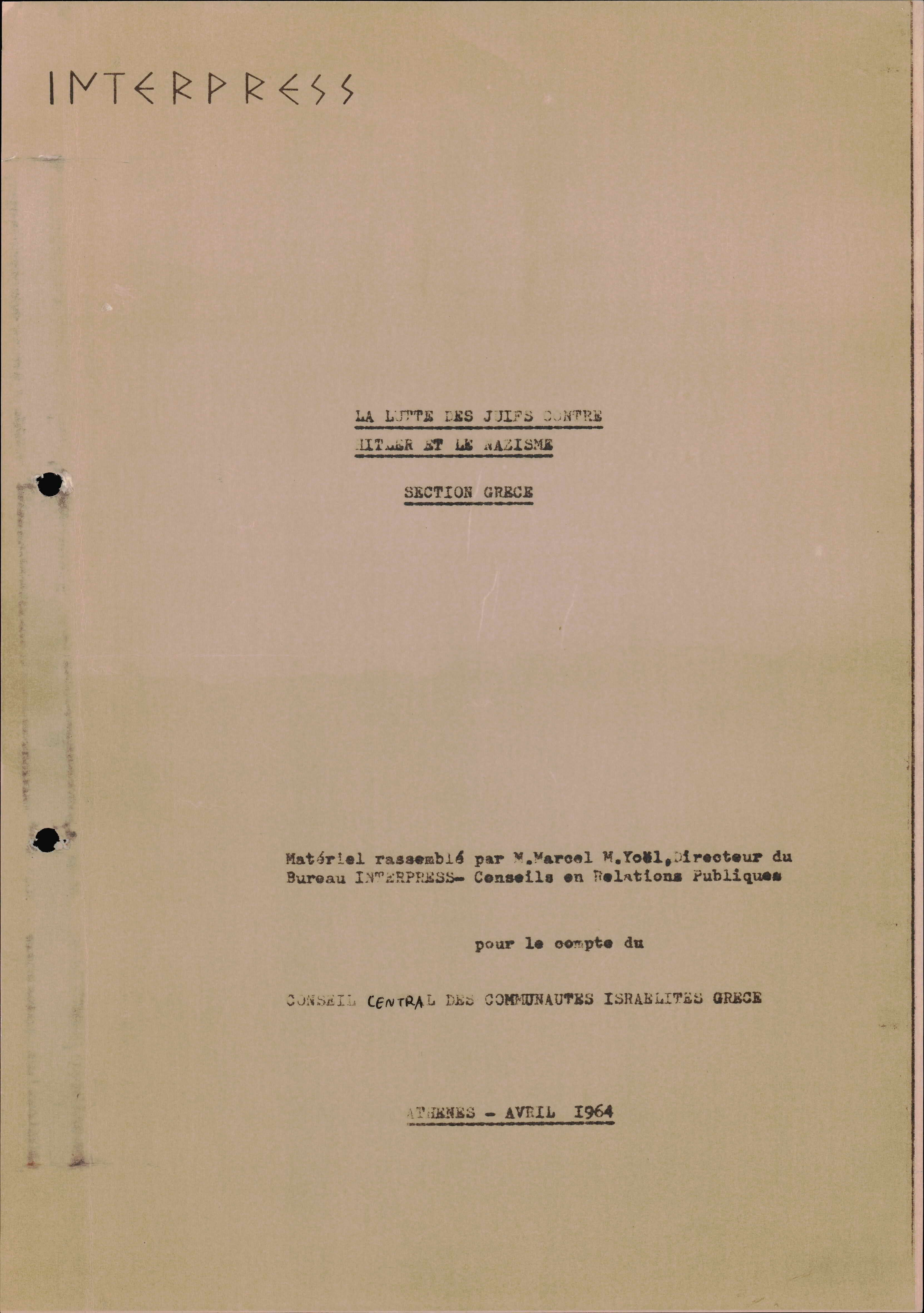 Photocopies of a handtyped document titled "La lutte des juifs contre Hitler et le nazisme-section Grèce".