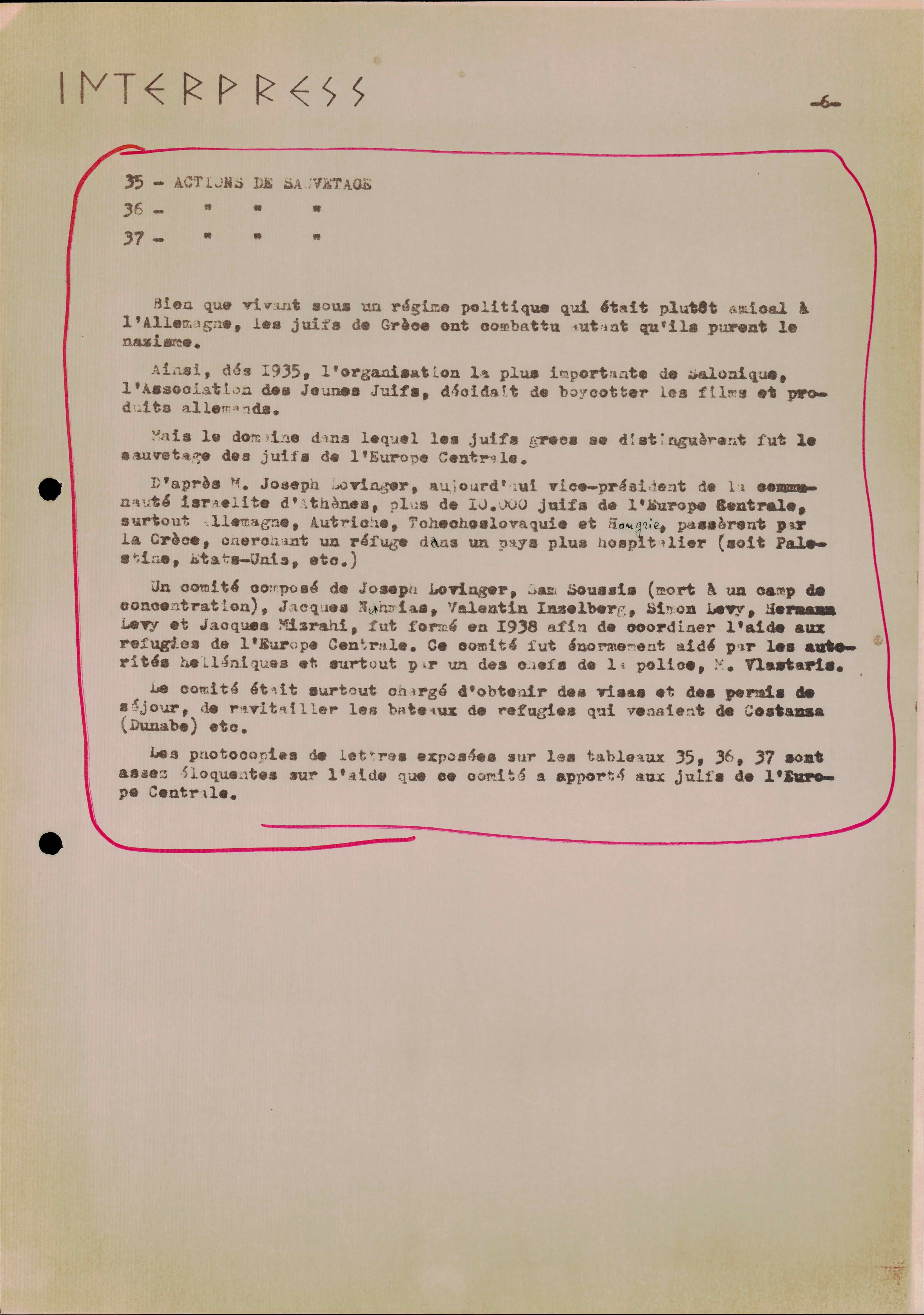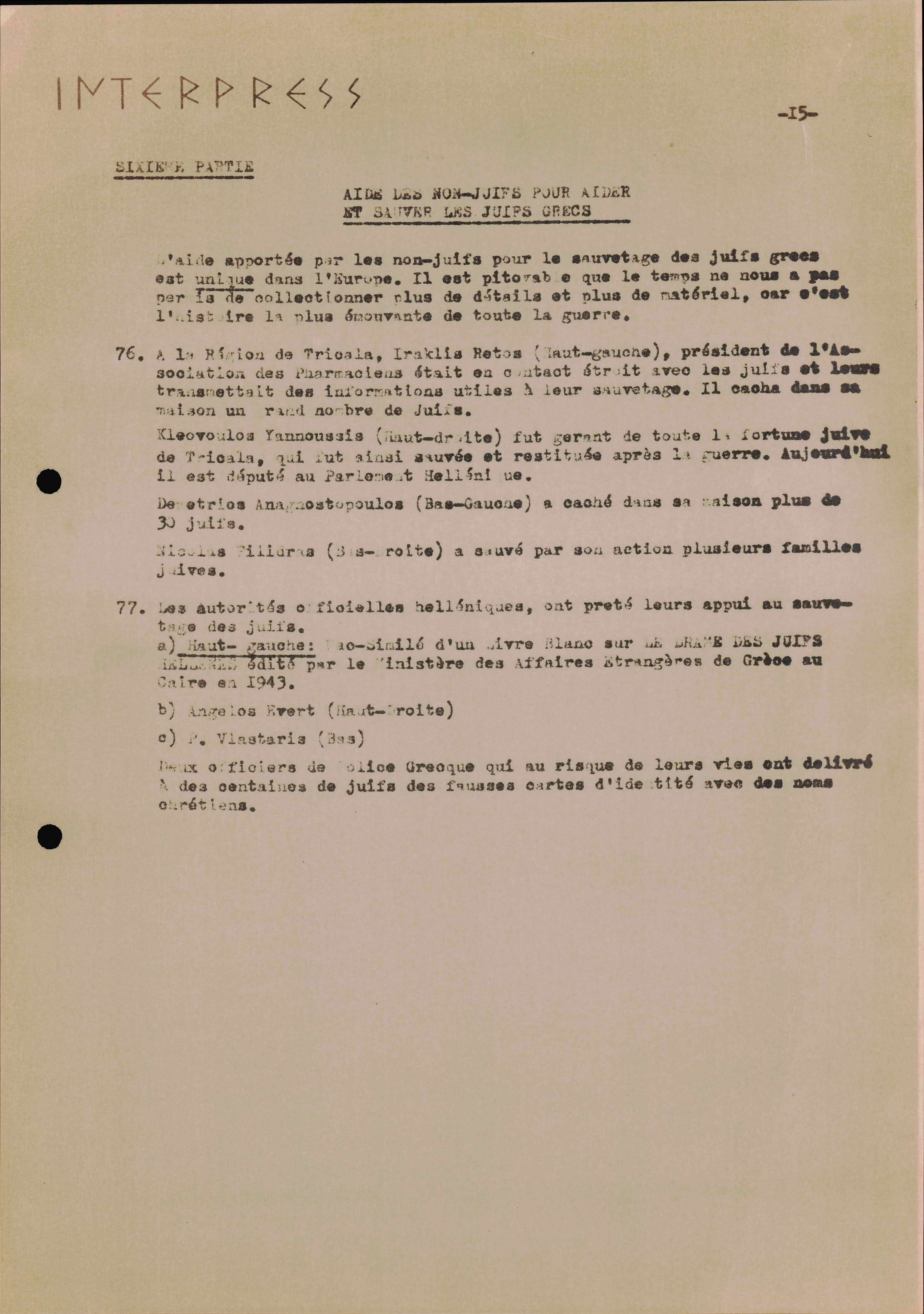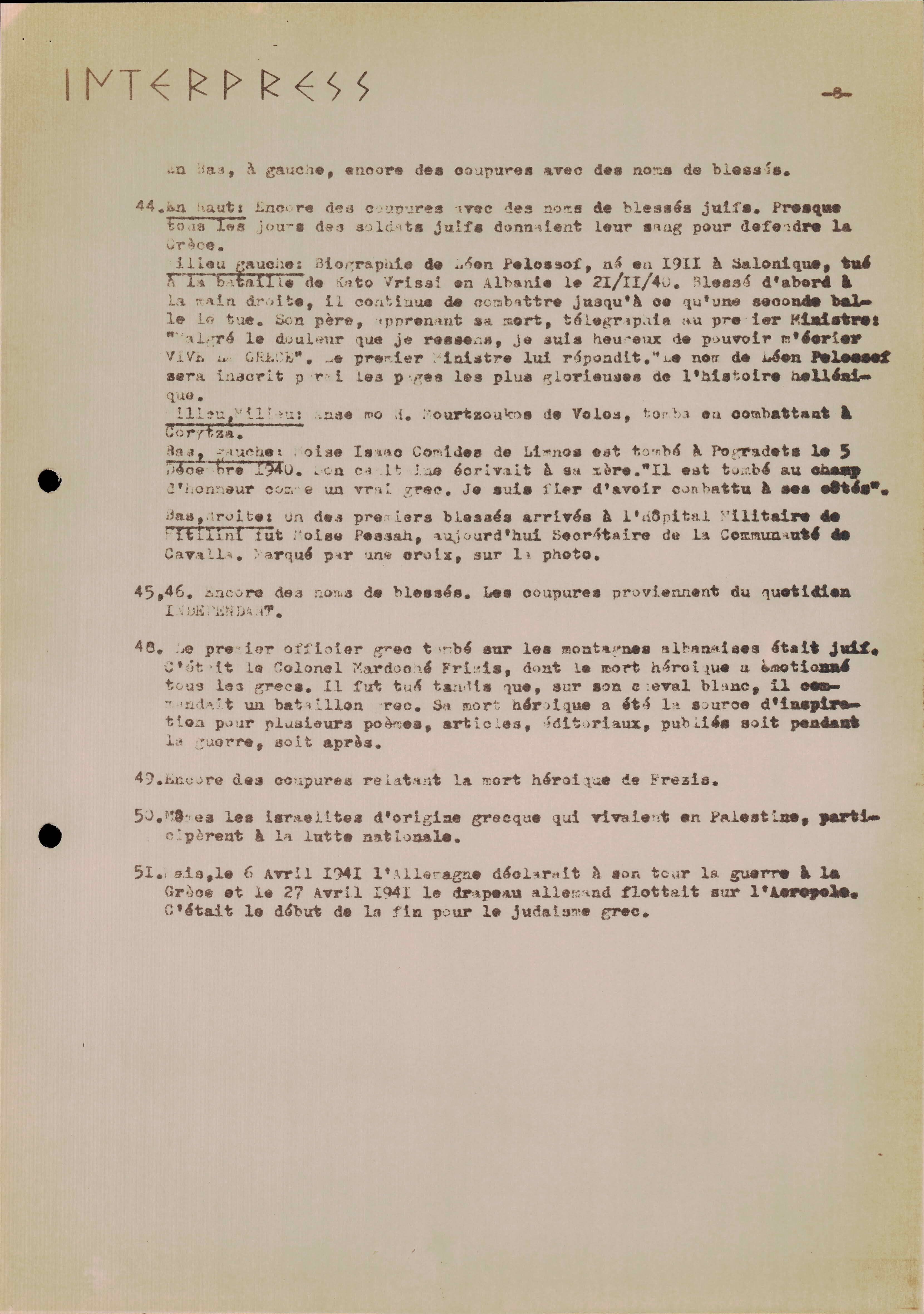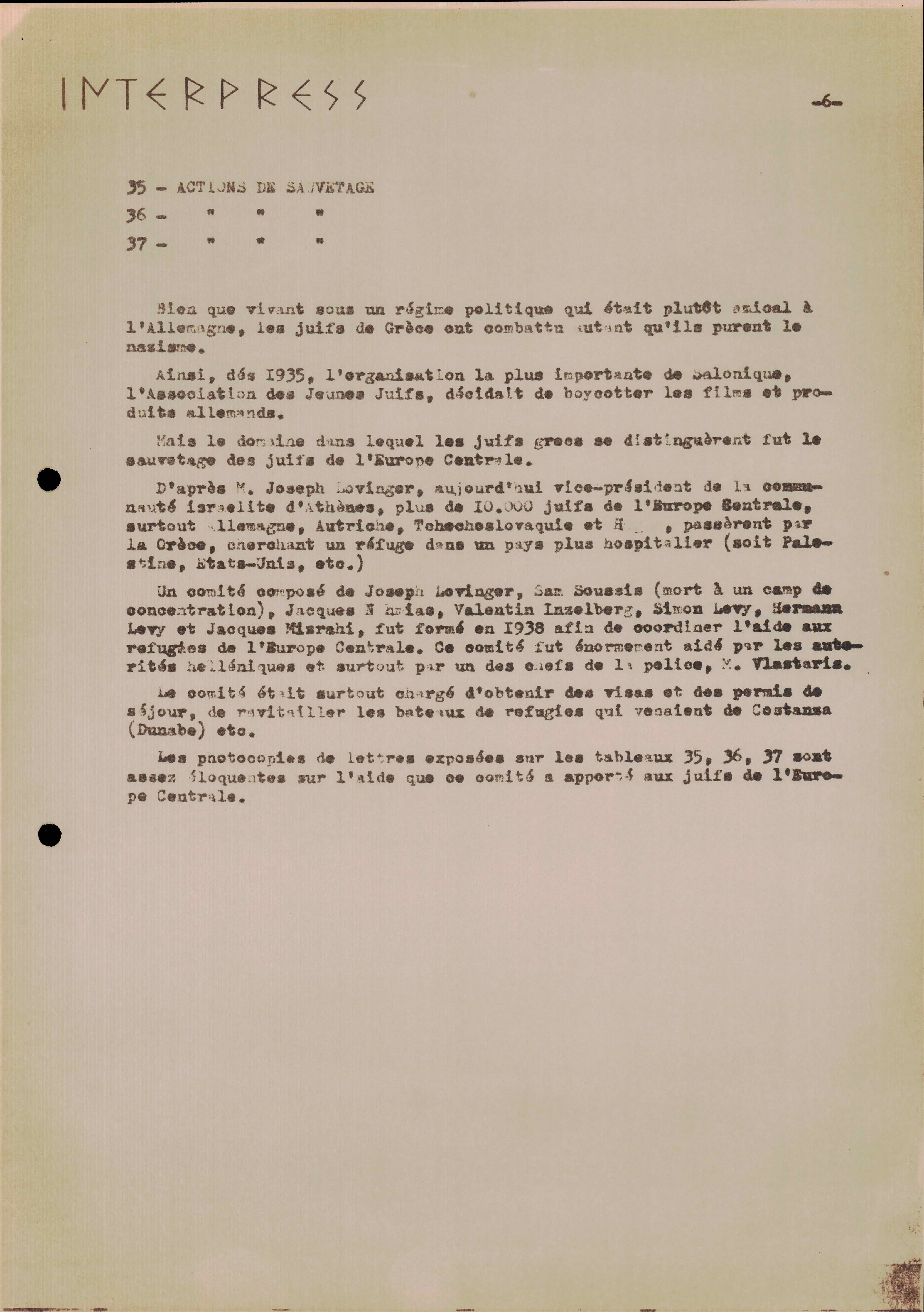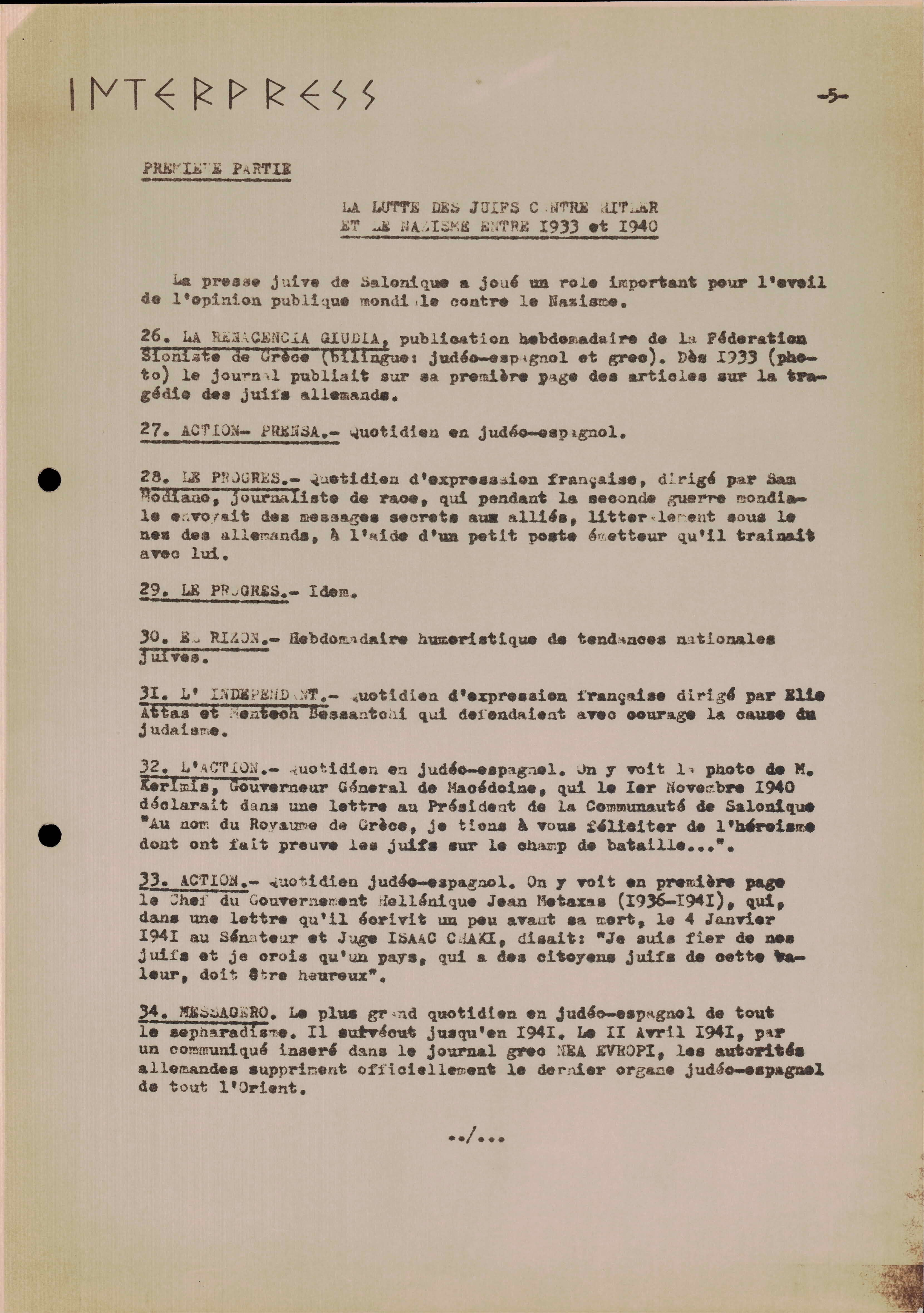 Photocopies of a handtyped document titled "La lutte des juifs contre Hitler et le nazisme-section Grèce".