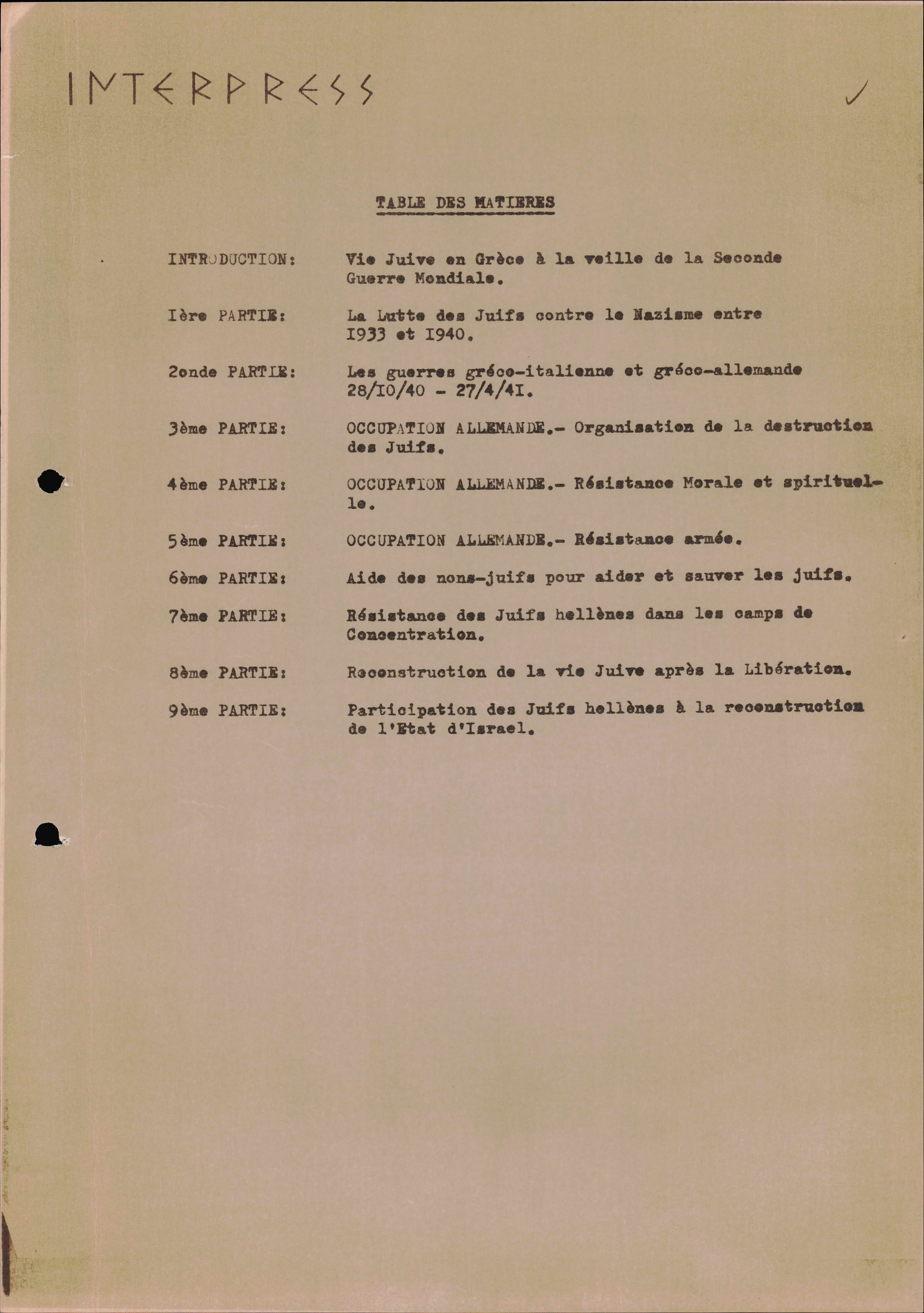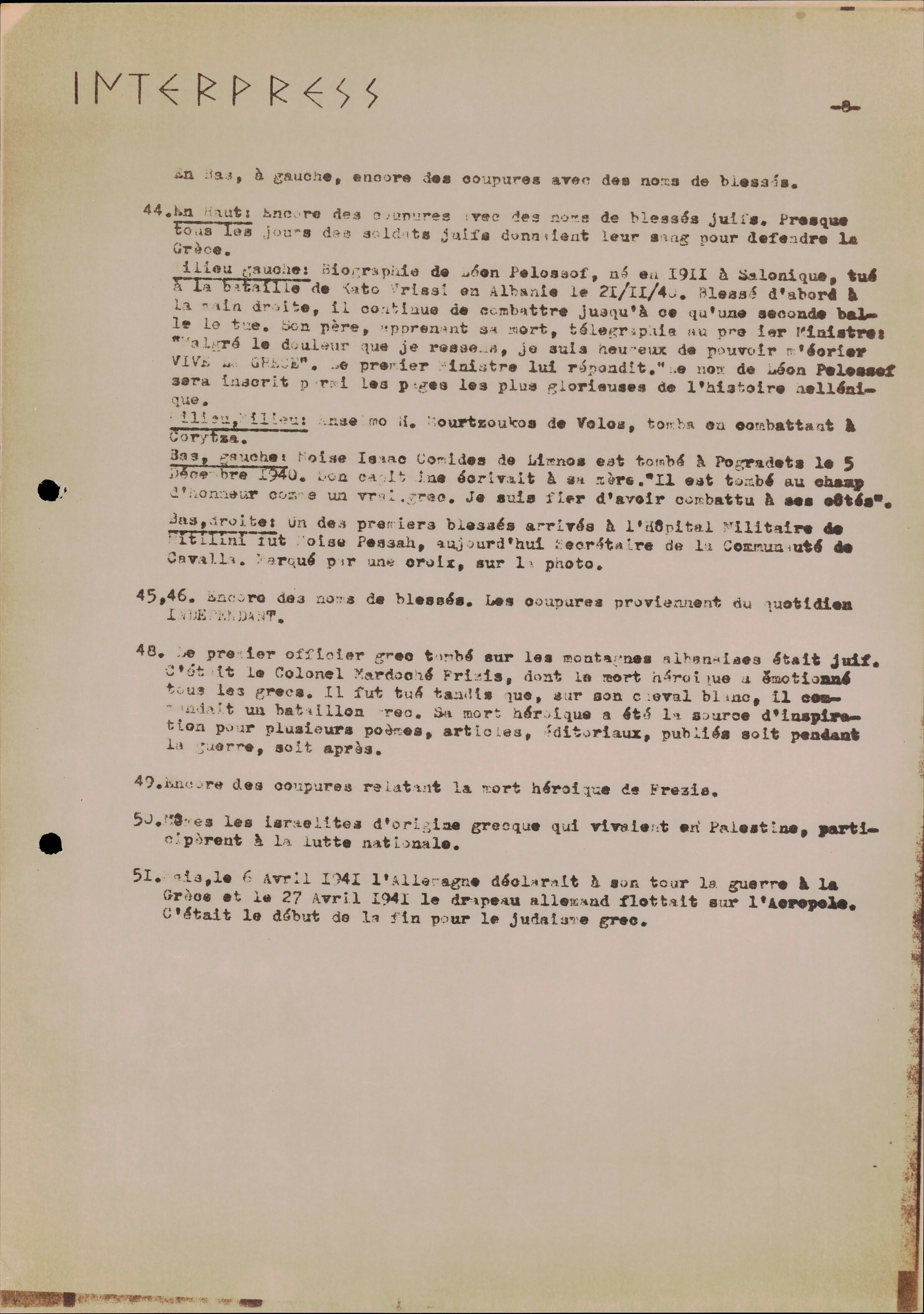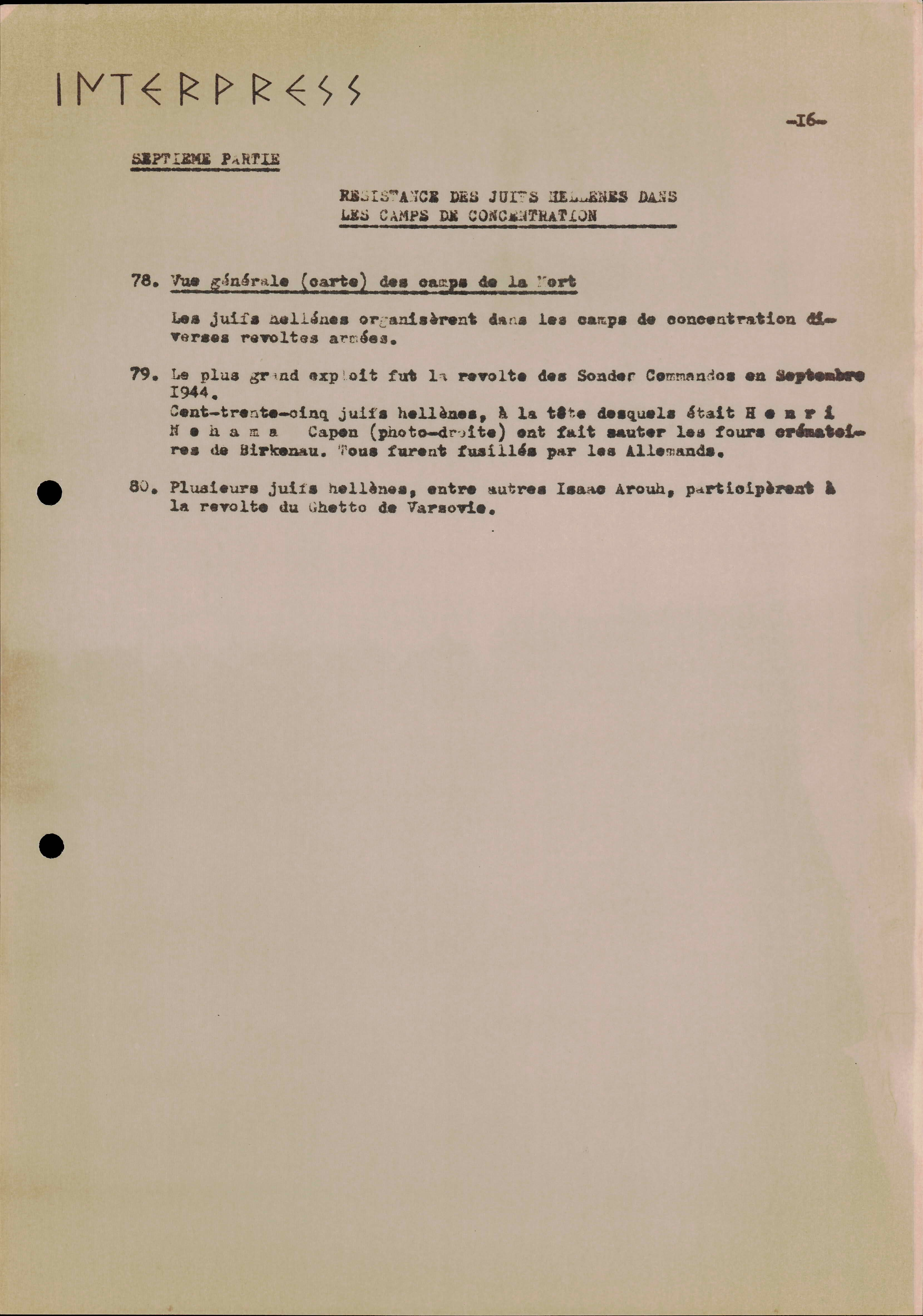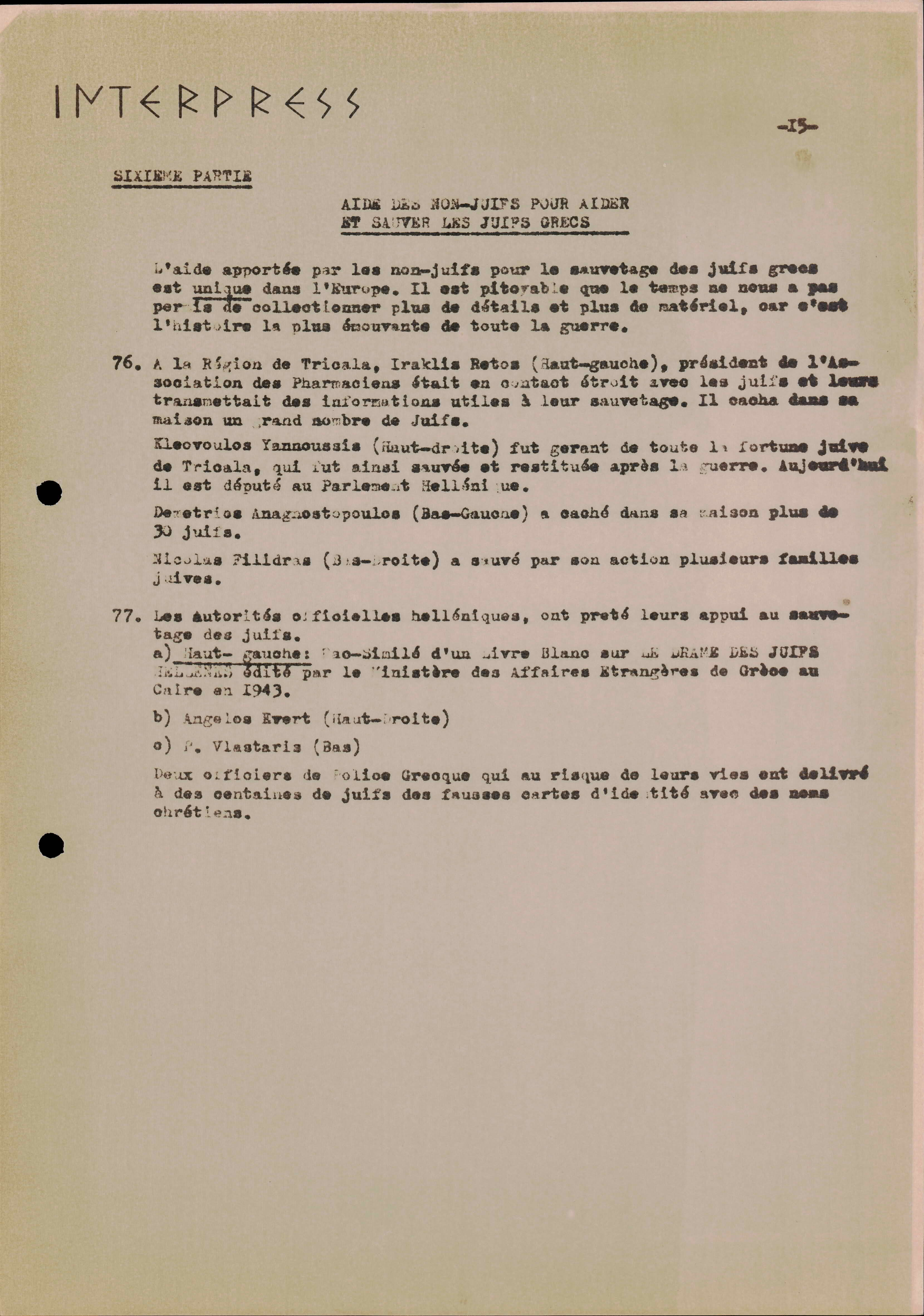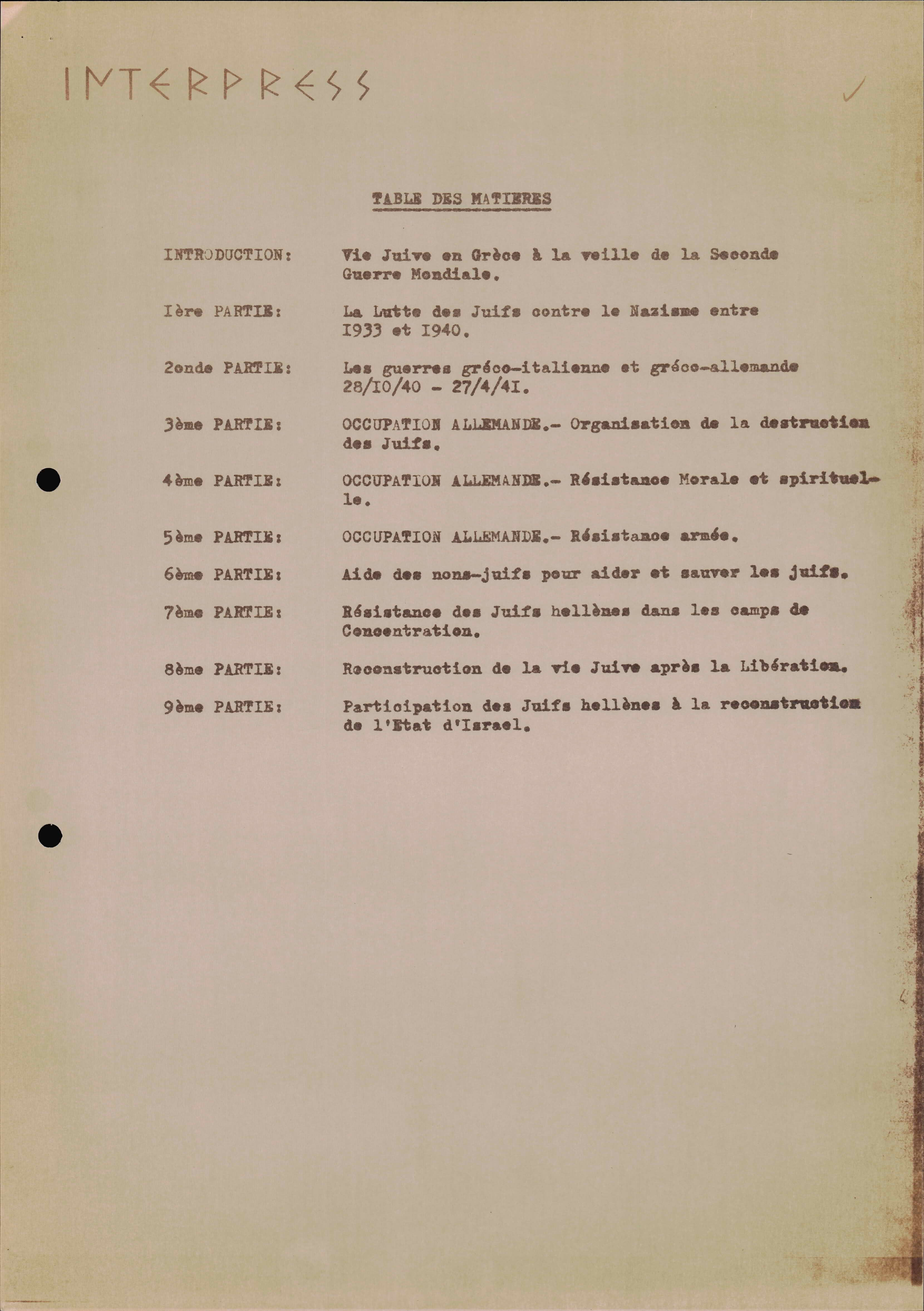 Photocopies of a handtyped document titled "La lutte des juifs contre Hitler et le nazisme-section Grèce".