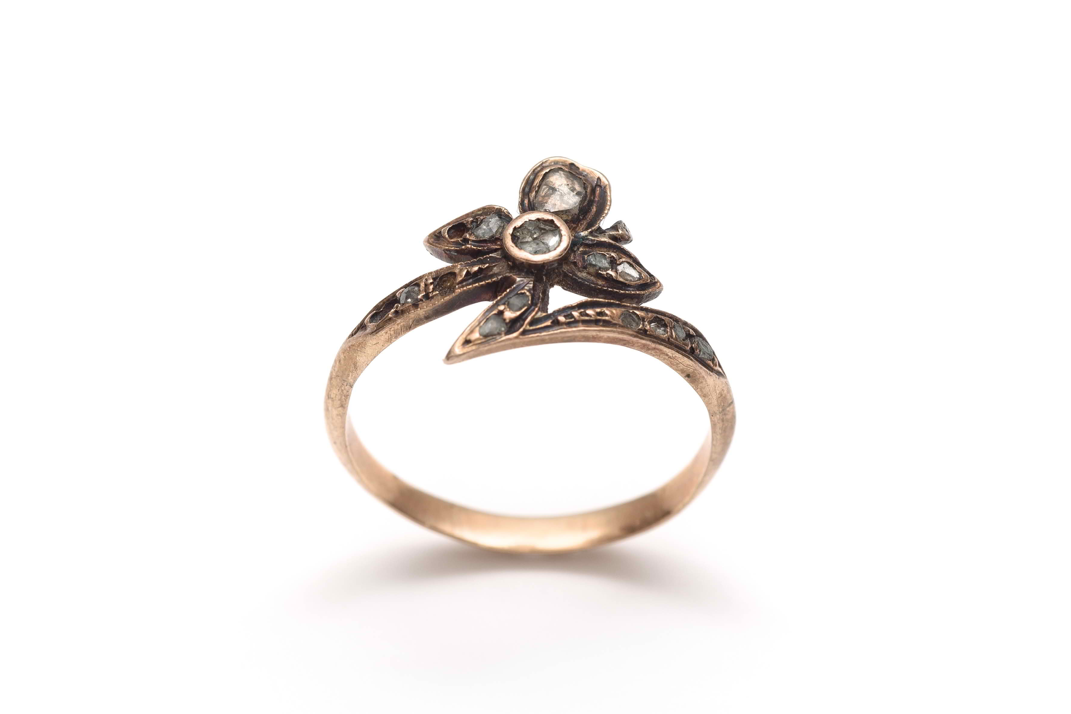 Woman's gold ring, flower-shaped bezel set with diamond chips.