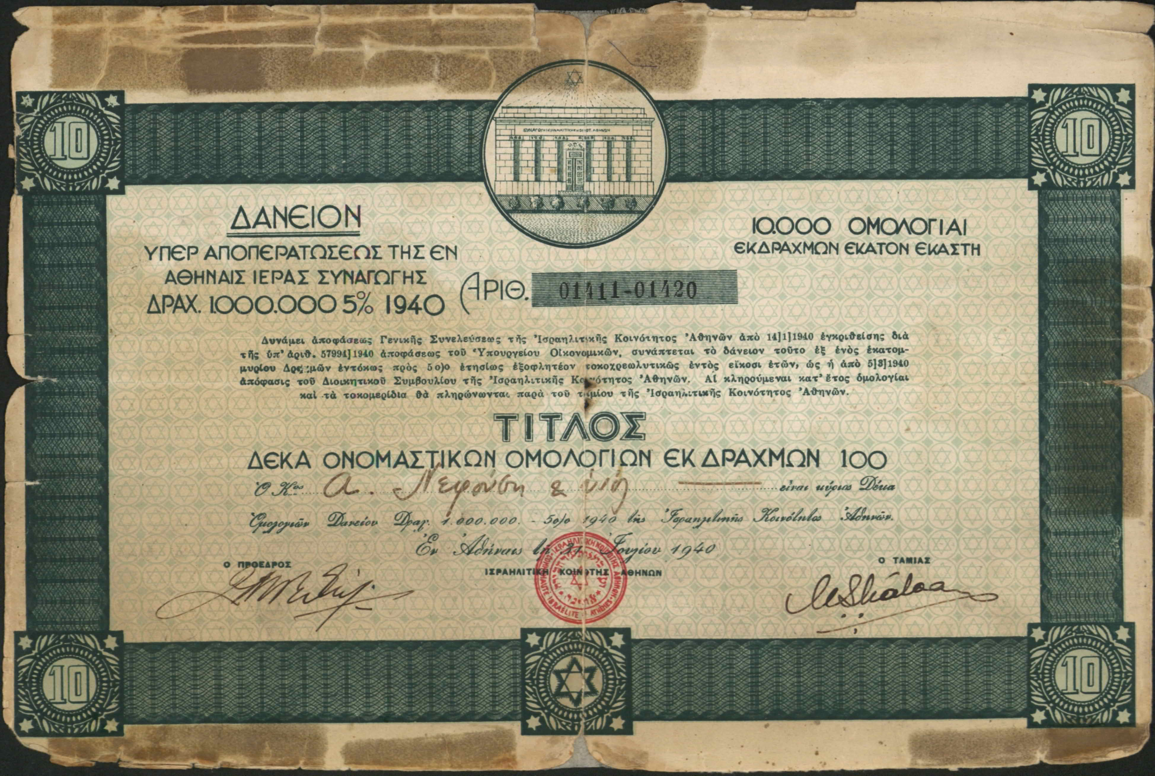 | dc.description | Bond of obligations, for the completion of the Athens Synagogue, issued to A. Nefousi & Sons, by the Jewish Community of Athens, with coupons valid until December 31st, 1960. | |