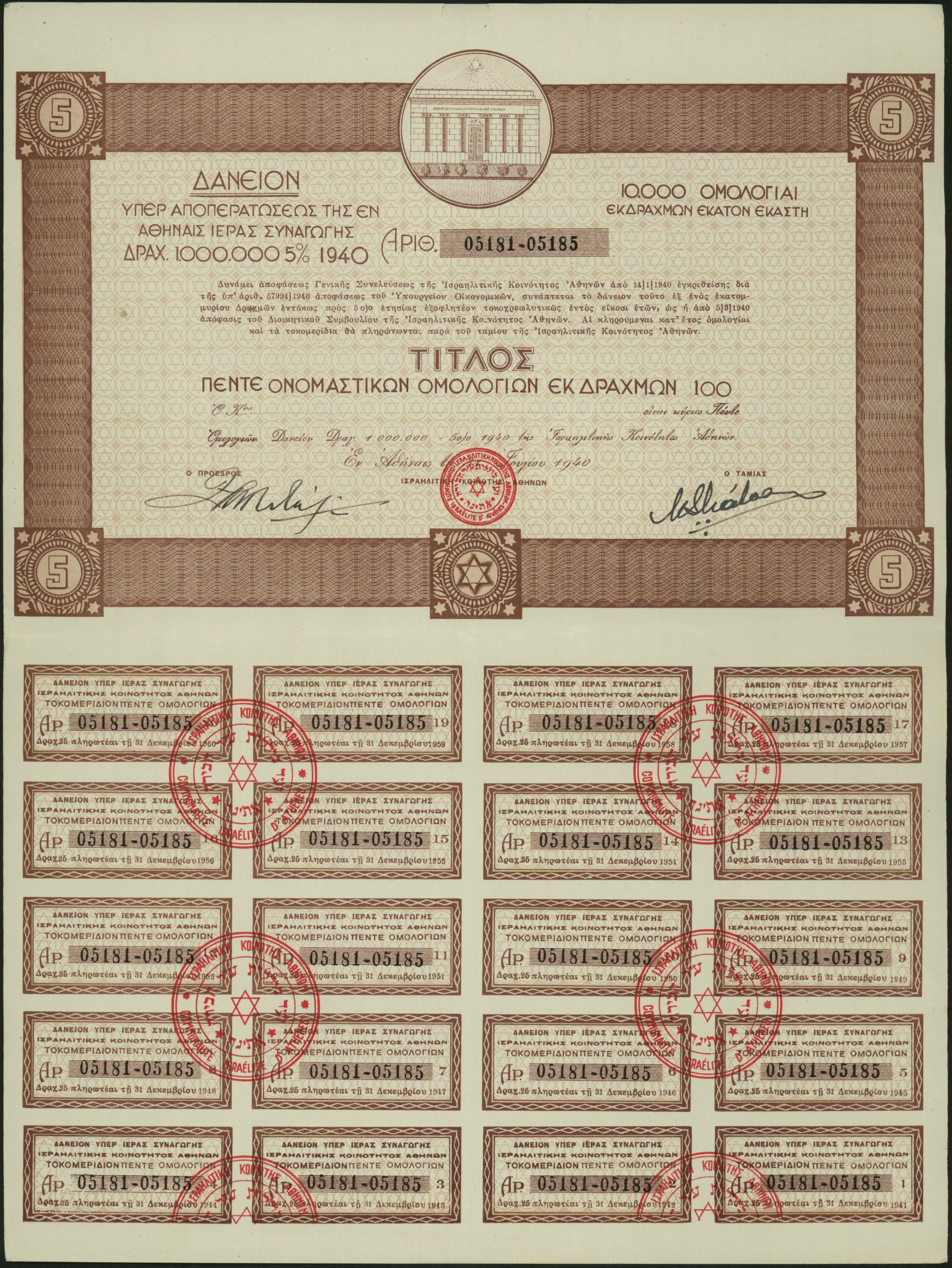 Bonds and obligations, issued by the Jewish Community of Athens with coupons.