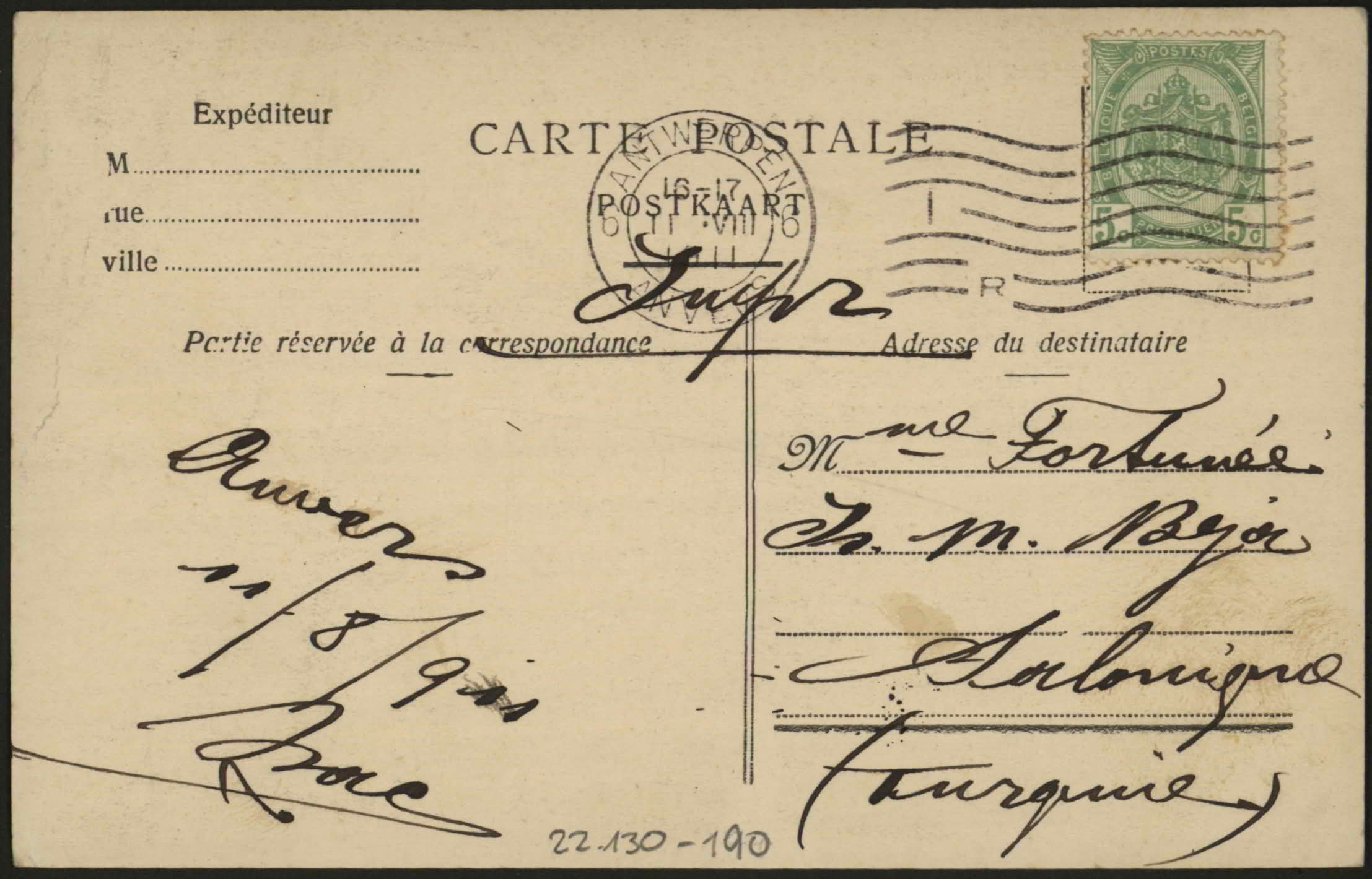 From Isac to Madame Fortunee Is. M. Beja, Salonique, Turquie. "Anvers 11/8/911, Isac".