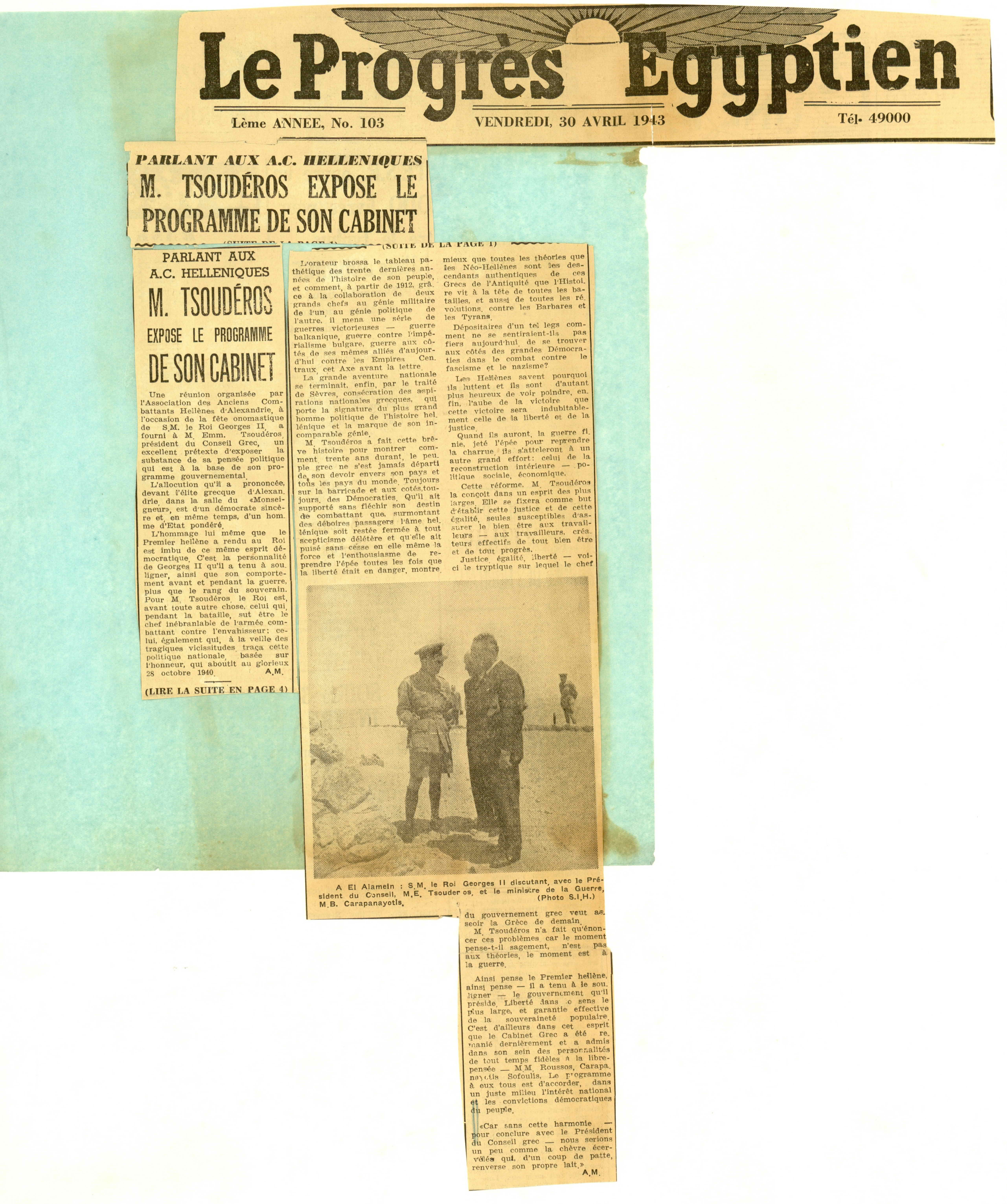 | dc.description | "Le Progrès Égyptien" newspaper clipping, attached on paper, with article titled "Parlant aux A.C. Helléniques M. Tsouderos exposé le programme de son Cabinet", April 30th, 1943, No. 103. | |